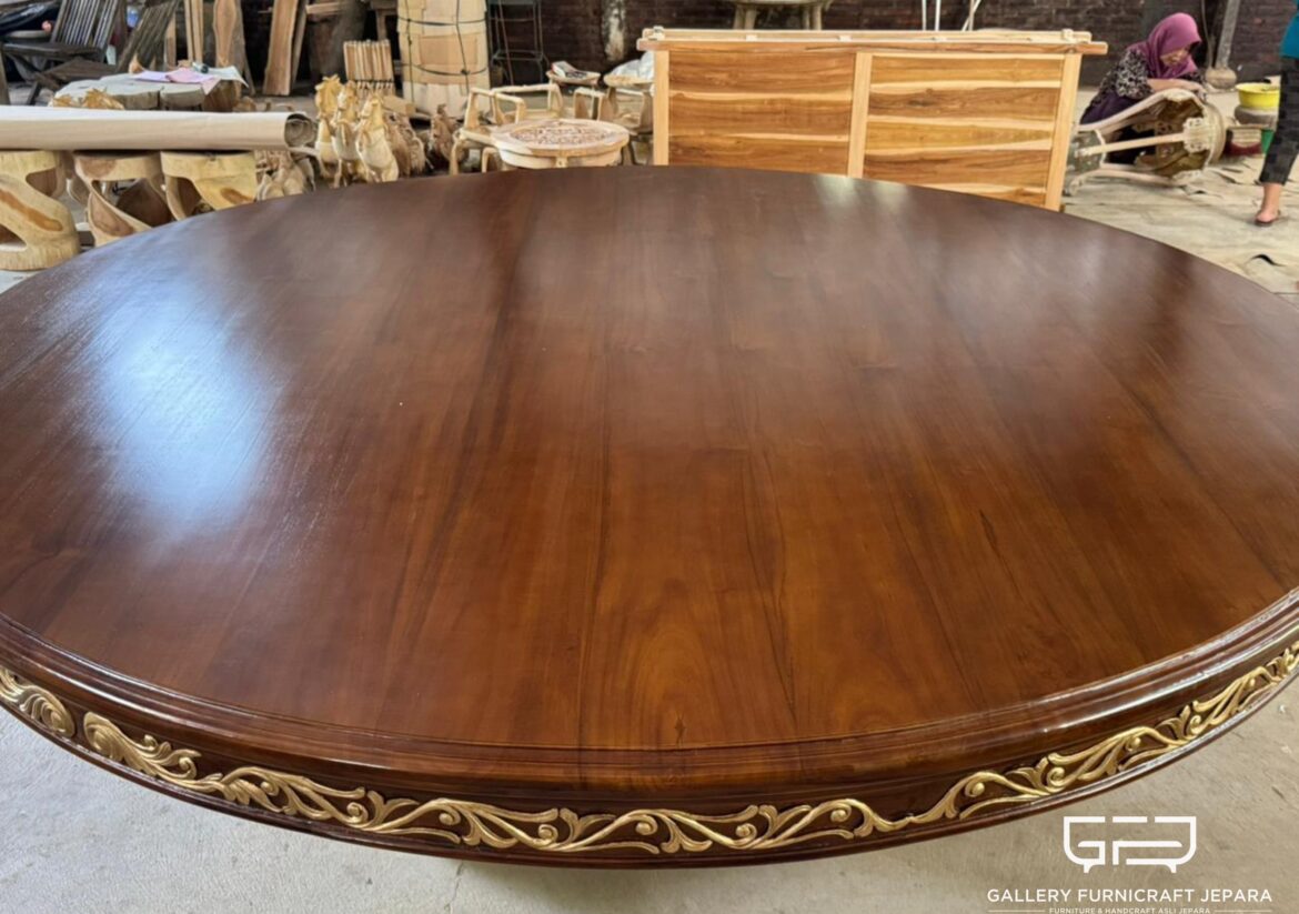 MEETENG TABLE 250CM KAYU JATI SOLID Open Pre Order, meja meeteng kapasitas 12 kursi, diameter 250cm, material kayu jati solid finishing melamine wallnut, diukir oleh seniman ukir berpengalaman asli jepara kota ukir, Original Product by .