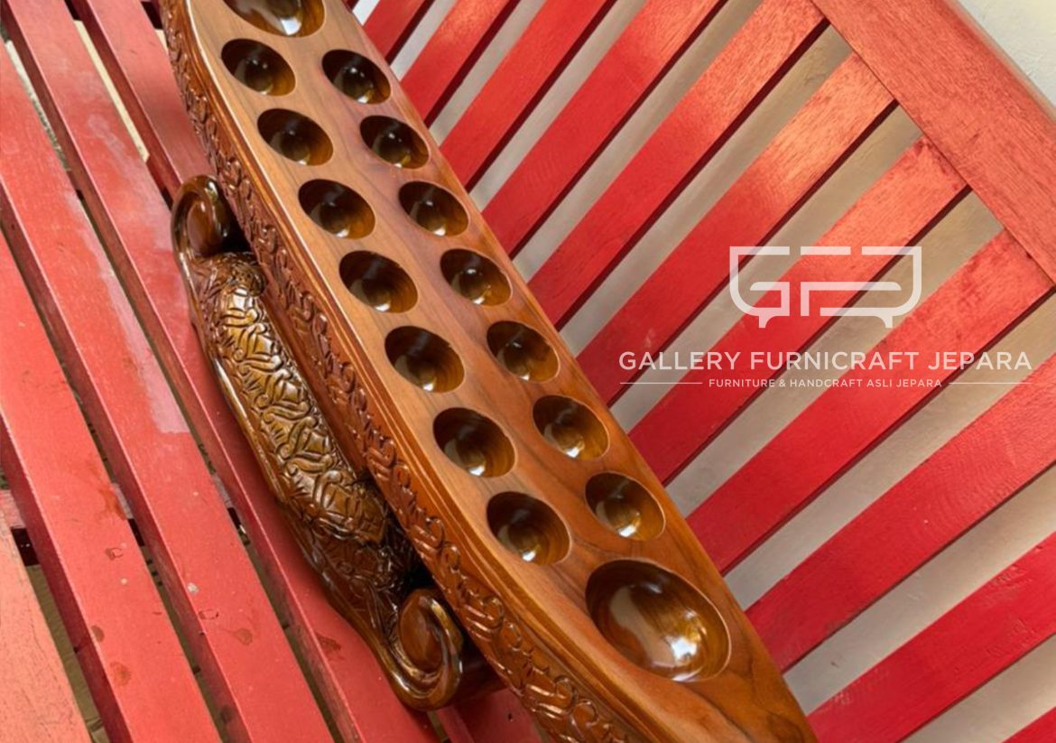 DAKON 7 LUBANG GAMELAN KAYU JATI UTUH FINISHING GLOSSY || PRE ORDER                 Dakon Congklak mainan tradisional model gamelan 7 lubang, material kayu jati premium solid utuh, diukir oleh seniman asli jepara, finishing natural, product by Gallery .