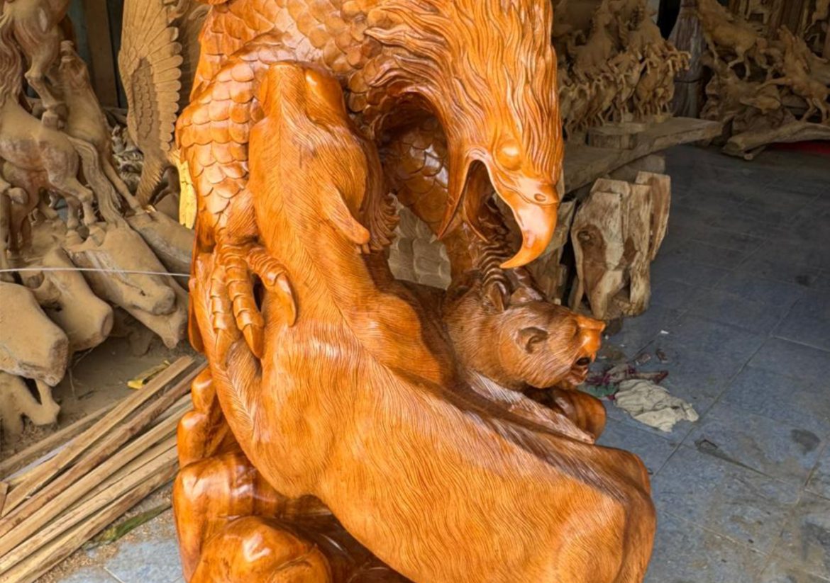 PATUNG ELANG VS HARIMAU SUARWOOD SOLID 255X100X250CM                   *OPEN PRE ORDER* Best seller ukiran patung burung elang vs harimau kayu suar, finishing menggunakan melamine doff Spesifikasi Product : Patung Dimension : 255x100x250cm Material : SuarWood, Natural .