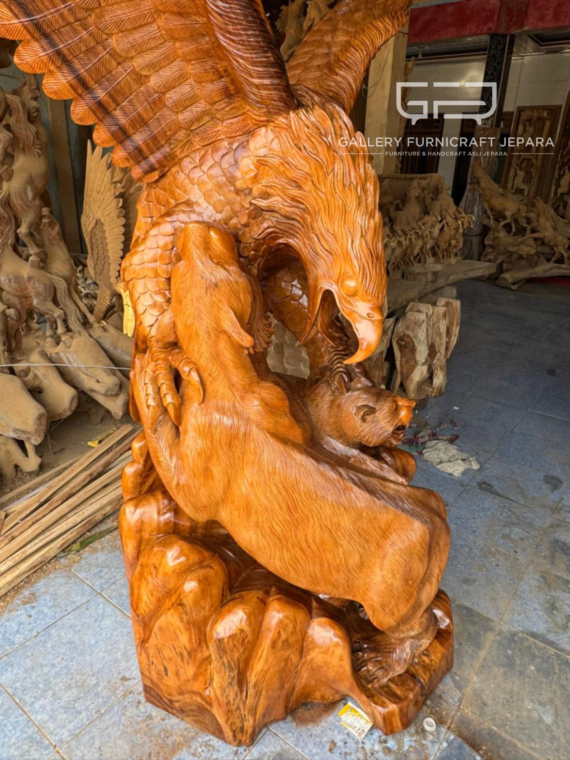 PATUNG ELANG VS HARIMAU SUARWOOD SOLID 255X100X250CM                   *OPEN PRE ORDER* Best seller ukiran patung burung elang vs harimau kayu suar, finishing menggunakan melamine doff Spesifikasi Product : Patung Dimension : 255x100x250cm Material : SuarWood, Natural .