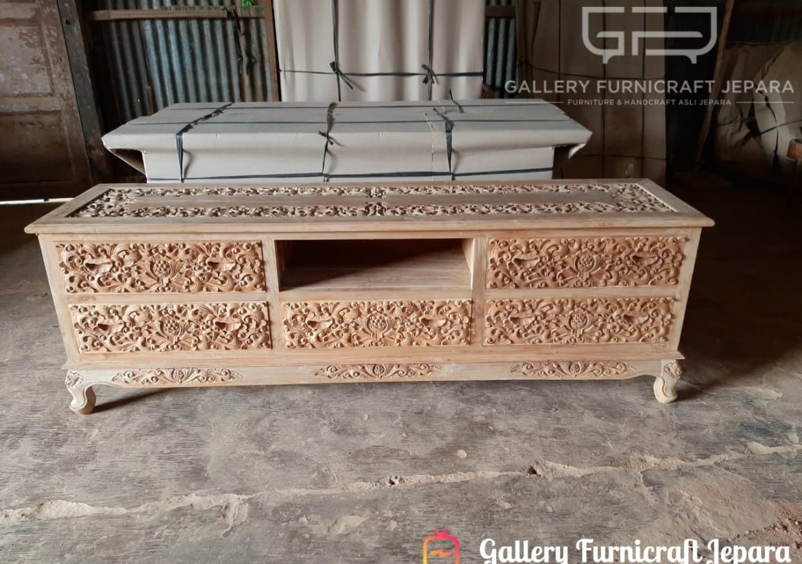BUFET UKIRAN KOMODO KAYU JATI HARGA TERMASUK FINISHING cocok digunakan untuk meja tv, dengan bahan baku kayu jati kualitas A, finishing natural yang menampakkan serat kayu jati asli terkesan lebih antik dan natural .
