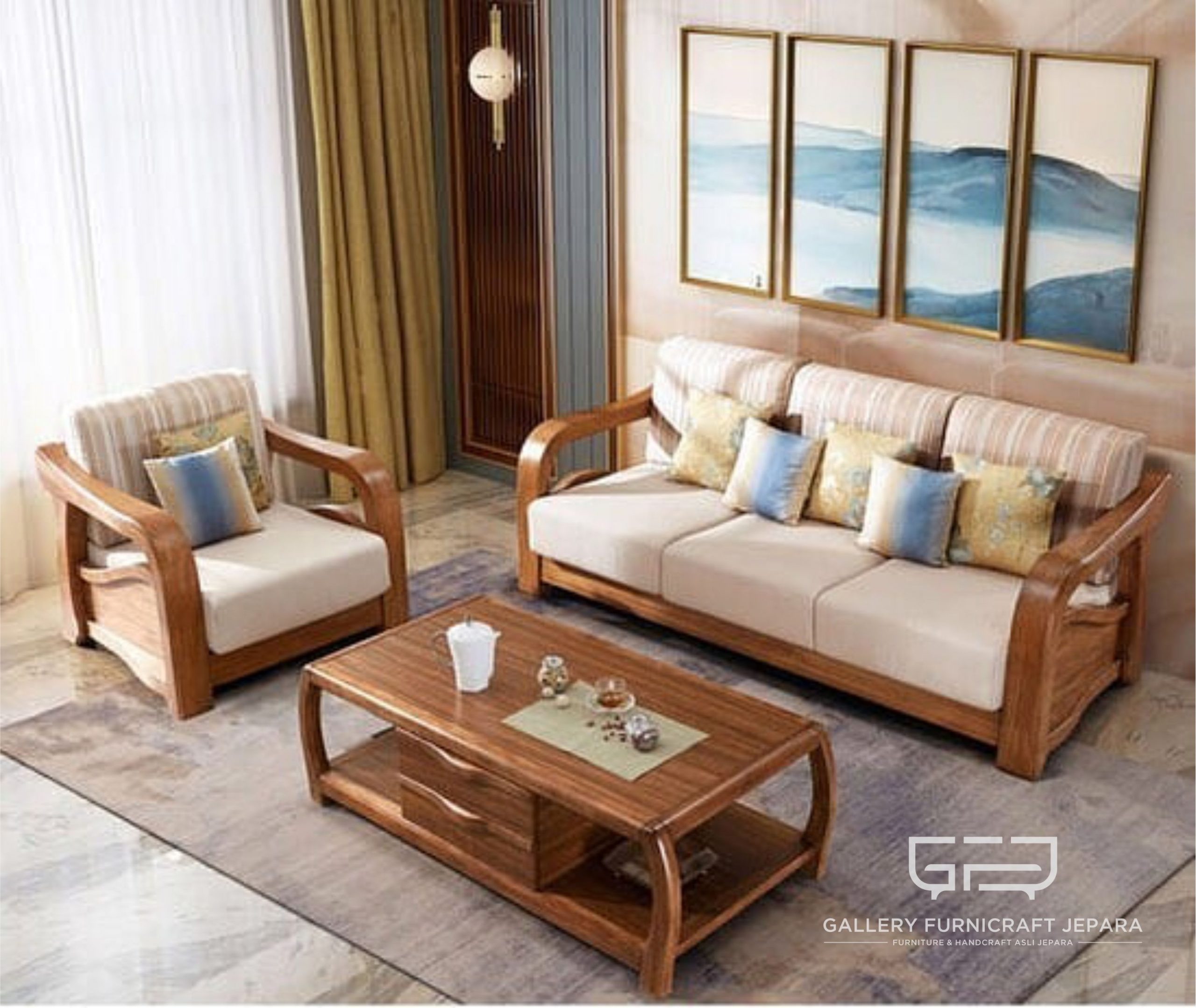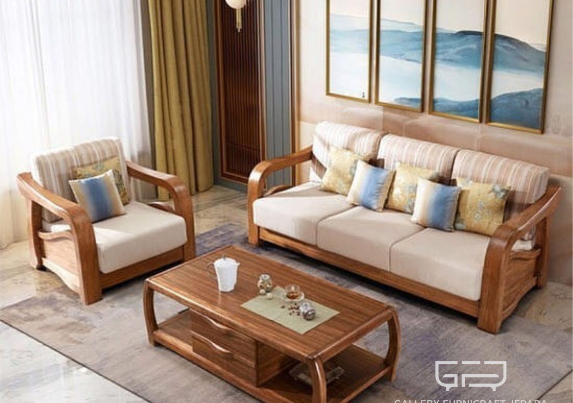 SOFA TAMU GANESA 3.2.1.1 SEATER + MEJA & 2 PUK cocok digunakan untuk sofa, kursi tamu dll, dengan bahan baku kayu jati, finishing duco gold yang mewah Spesifikasi : – Material Kayu Jati – .