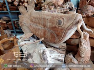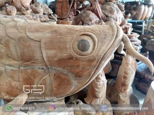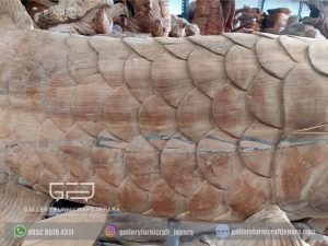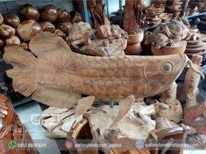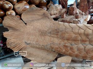 Patung Ikan Arwana, cocok sebagai patung koleksi dan dekorasi ruangan lobby hotel, bahan baku full jati tua yang sudah ratusan tahun dengan stand akar jati, karya seniman ukir jepara spesialis filosofi ikan arwana, Harga Berikut Finishing Natural Melamine.