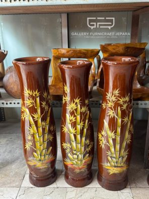 Vas Bunga 60cm Kayu Jati Lukis Bambu