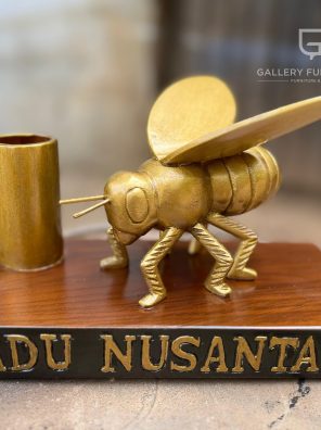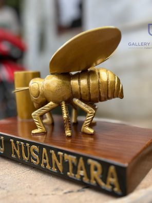 Custom Handcraft Patung Lebah 25cm Kayu Jati Finishing Natural Combinasi Gold