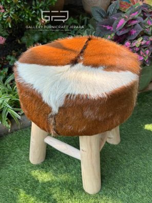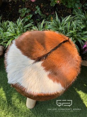 Stool Bulat Kulit Kambing Asli Kaki Jati Bleaching 40x40x45cm