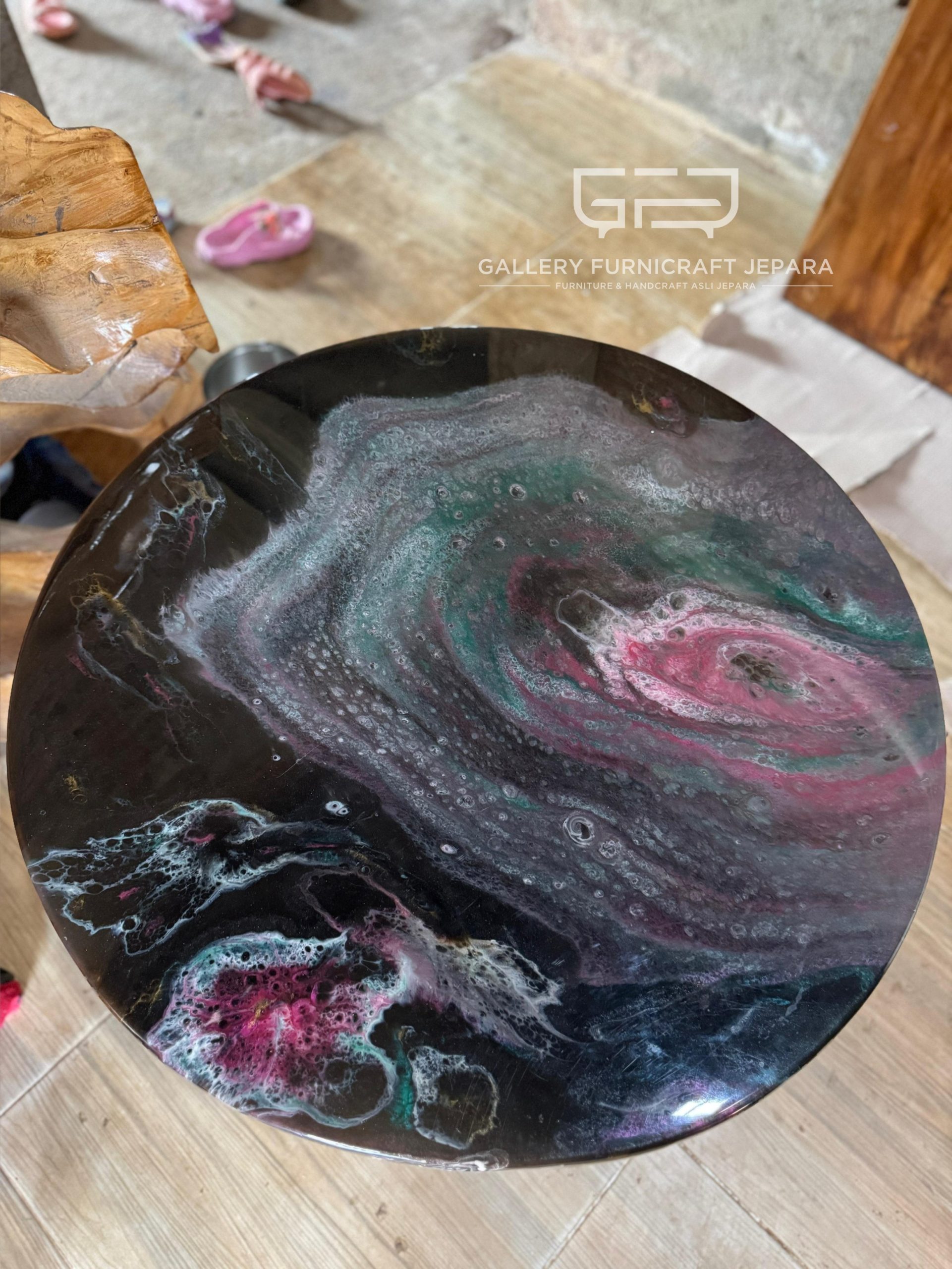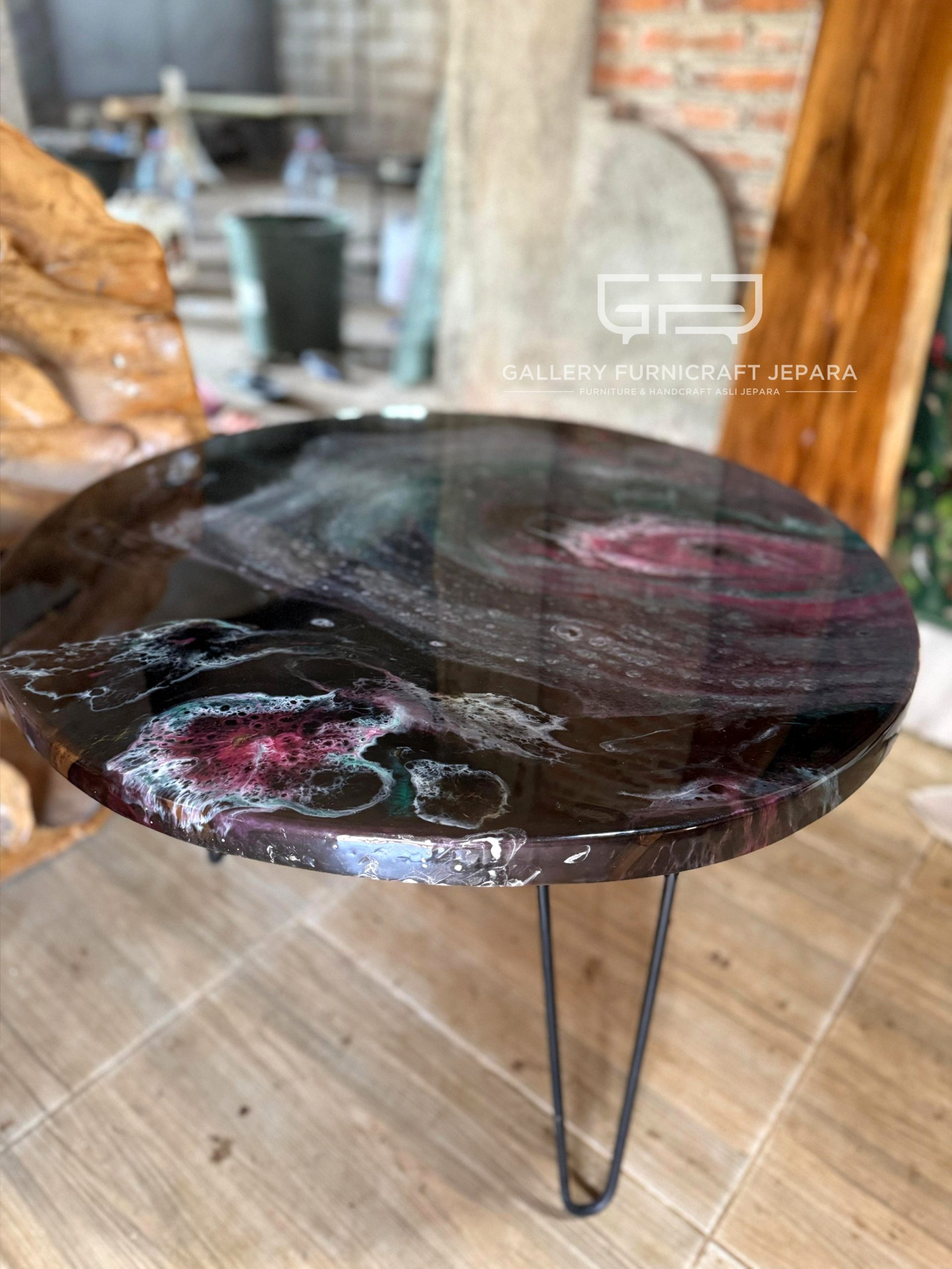 Meja kopi dengan material jati solid dikombinasikan seni resin, product by Gallery Furnicraft Jepara.