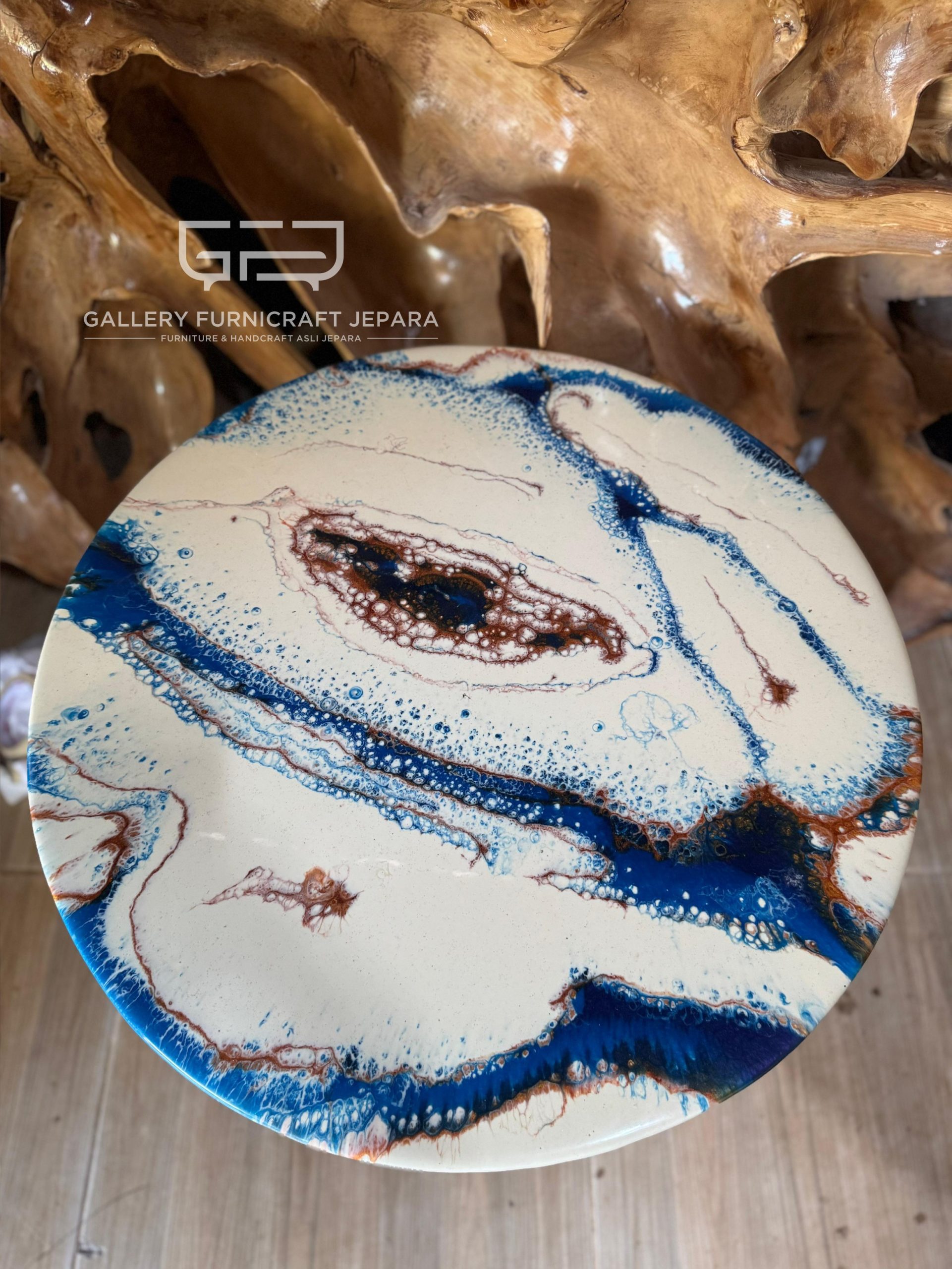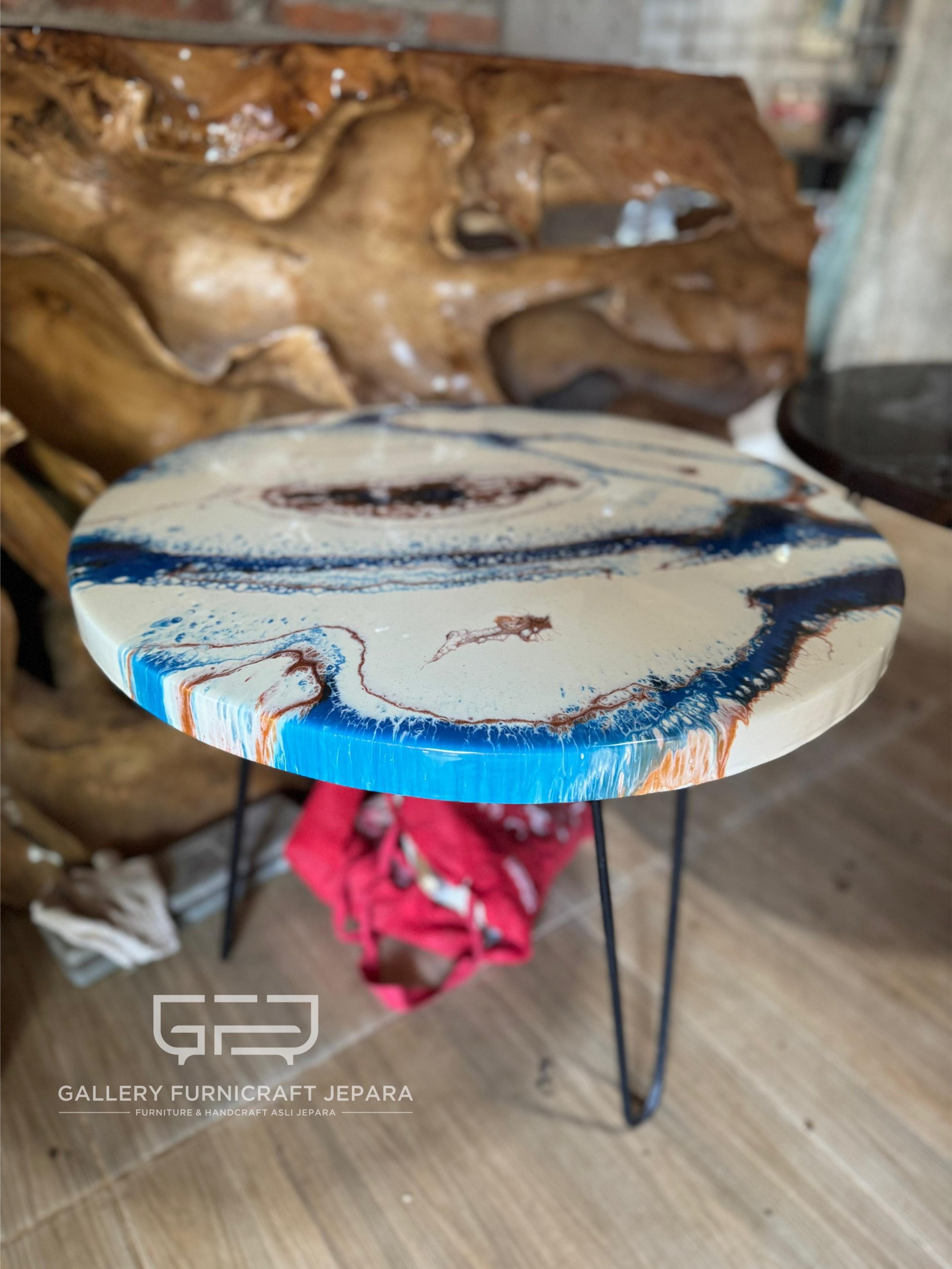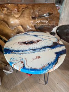 Meja kopi dengan material jati solid dikombinasikan seni resin, product by Gallery Furnicraft Jepara.