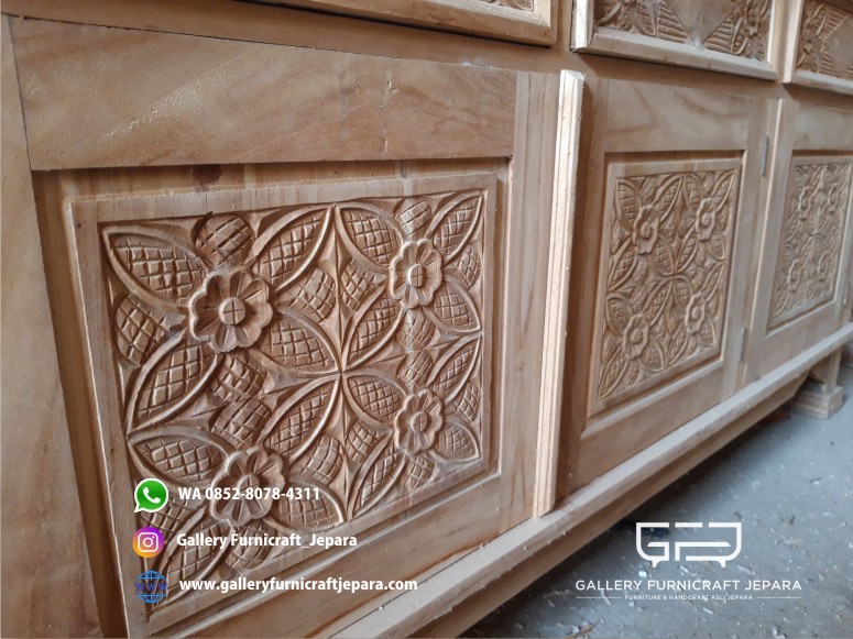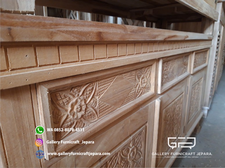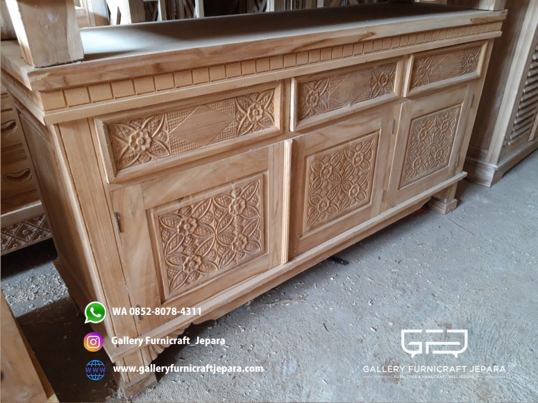 Bufet minimalis dengan ukiran bunga di pintu dan lacinya berbahan kayu jati grade A