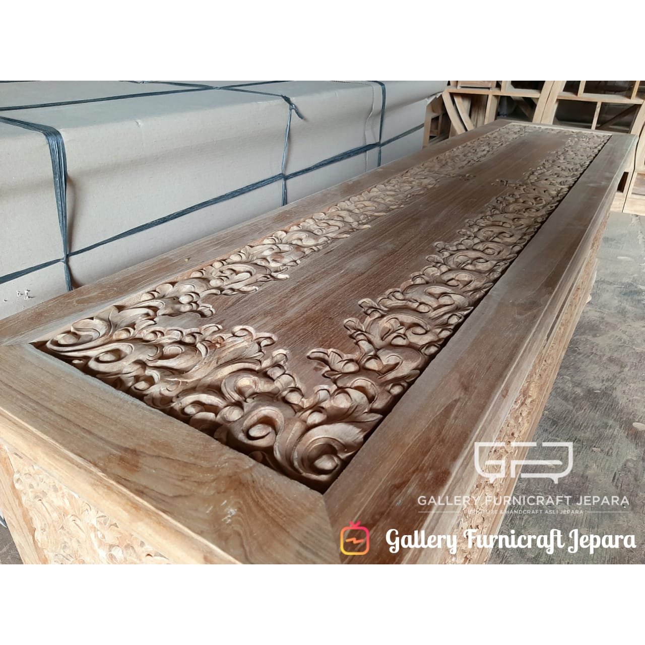 cocok digunakan untuk meja tv, dengan bahan baku kayu jati kualitas A, finishing natural yang menampakkan serat kayu jati asli terkesan lebih antik dan natural