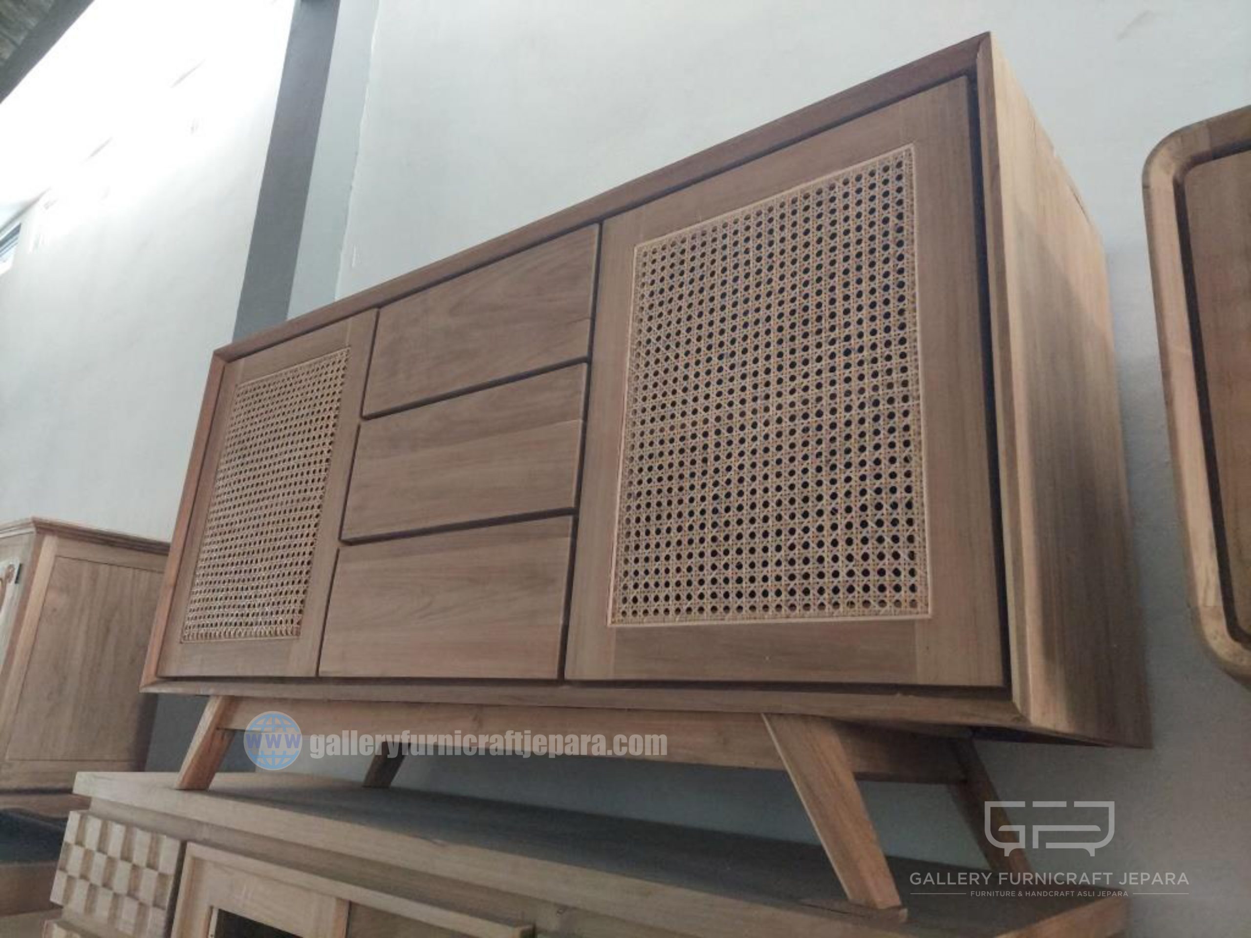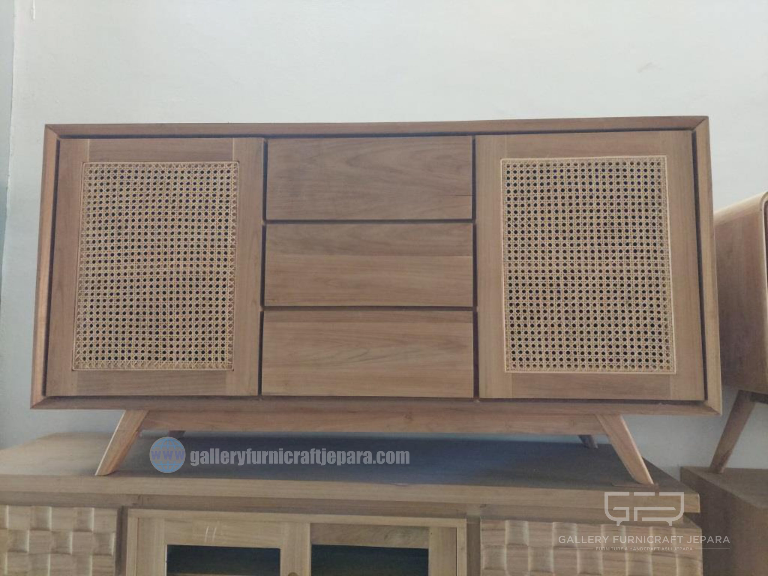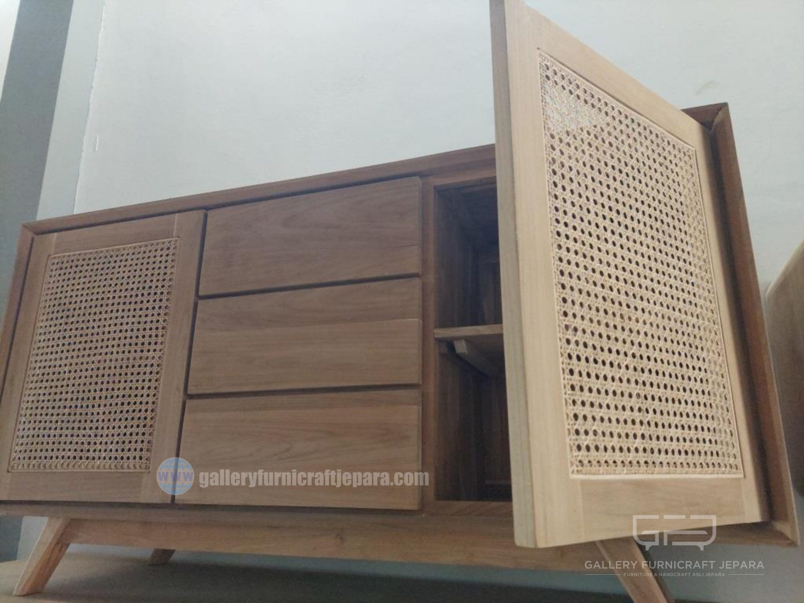 Lemari/Bufet desain minimalis kombinasi rotan, dilengkapi 2 pintu dan 3 laci, bahan baku kayu jati grade A kualitas terbaik, Tukangan presisi dan konstruksi kuat, harga diatas untuk unfinish (bisa juga request finishing dengan penambahan biaya)