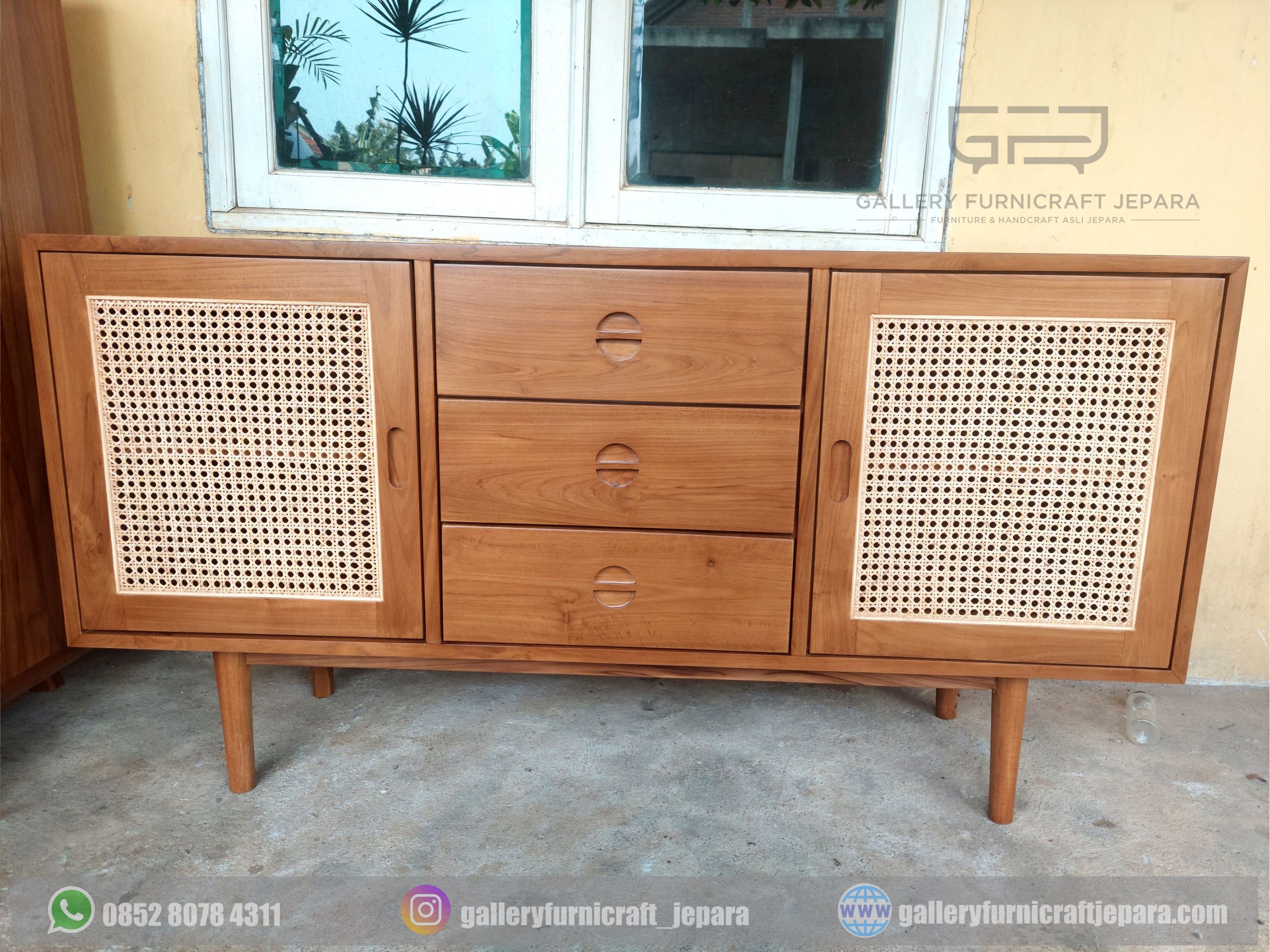 Tv cabinet berkonsep minimalis retro scandinavian berbahan kayu jati grade A perhutani, finishing natural jati coating doff melamin.