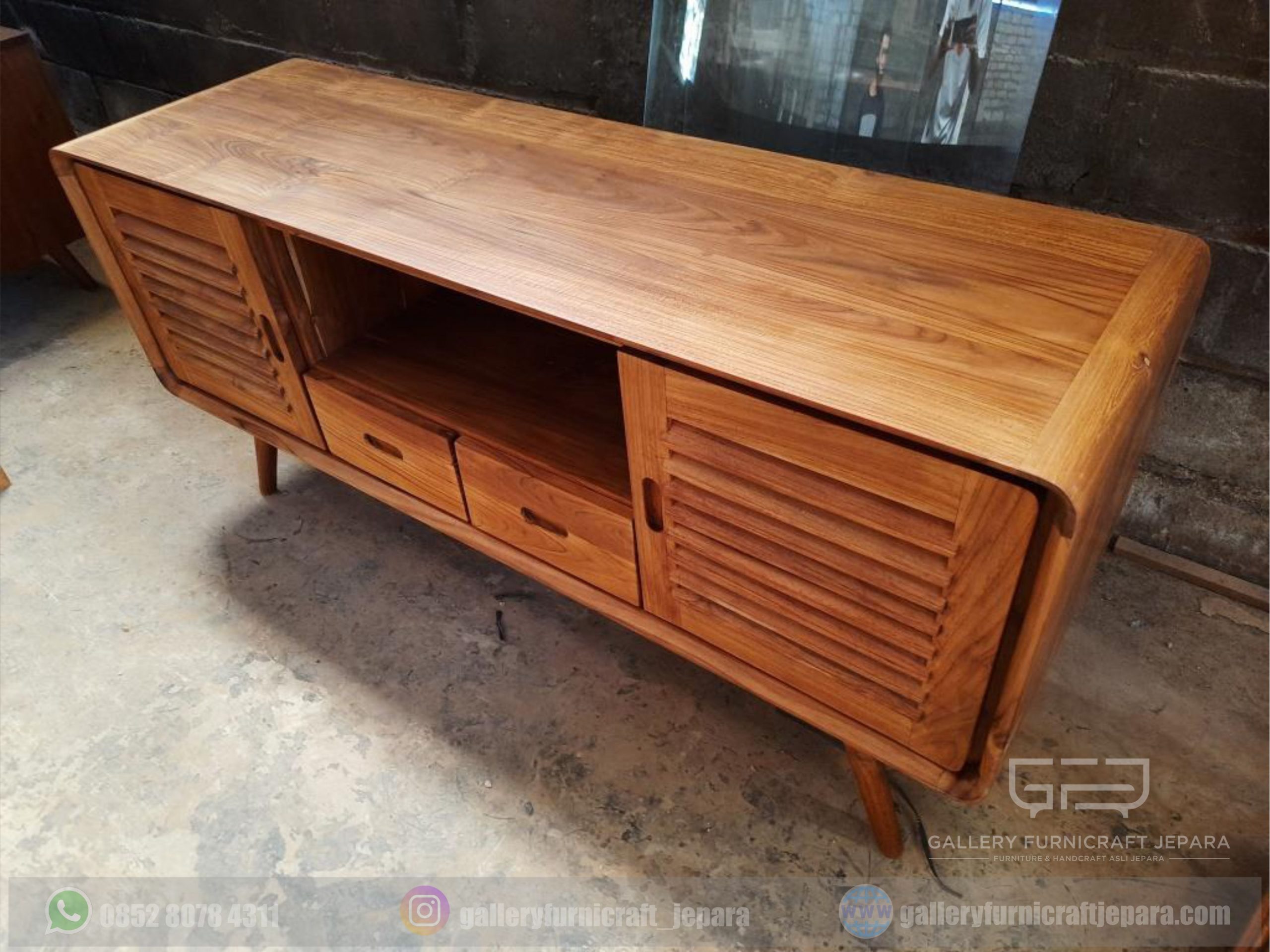 cocok digunakan untuk meja tv/meja buffet/meja rias/meja hias dll, dengan bahan baku kayu jati kualitas A, finishing natural yang menampakkan serat kayu jati asli terkesan lebih antik dan natural
