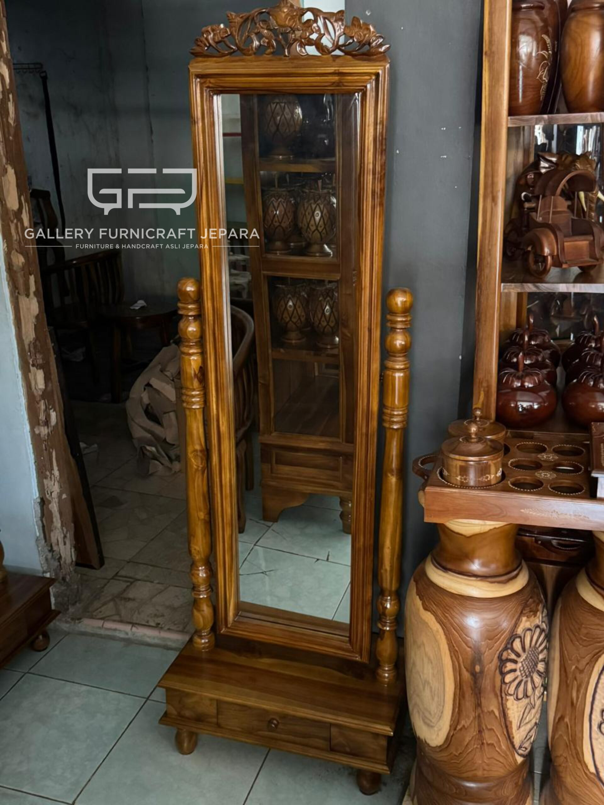 Ready, Cermin berdiri kayu jati ukir, dilengkapi dengan 1 laci, material jati solid, finishing natural melamin