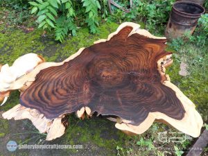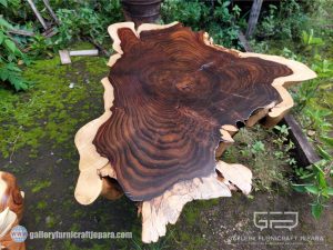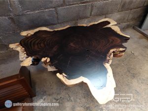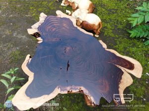 Open Order, bahan top table meja kopi dari kepala kayu sonokeling solid tekstur lorek macan antik, dengan finishing natural satin doff
