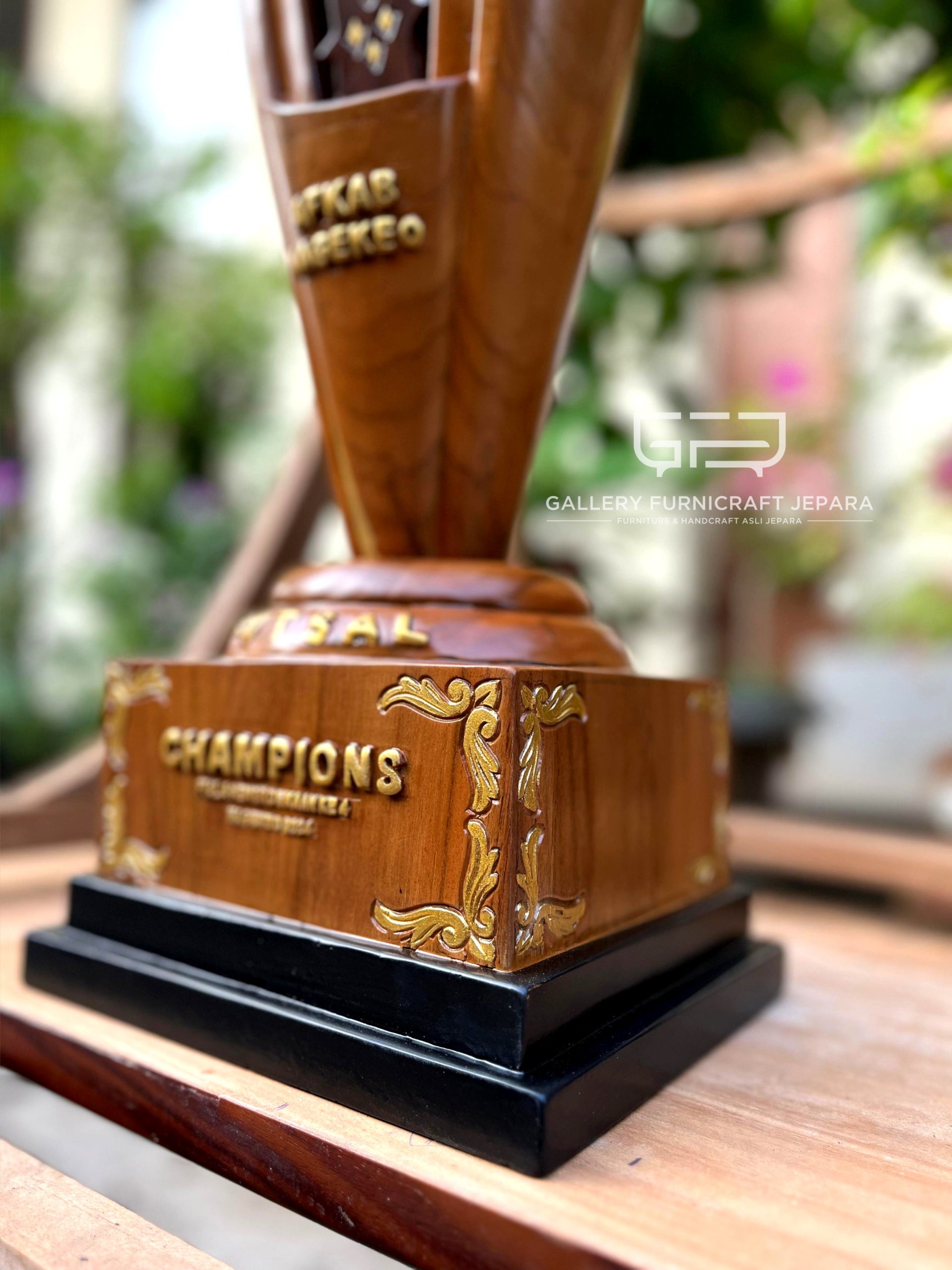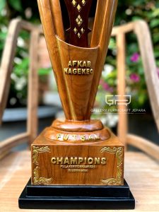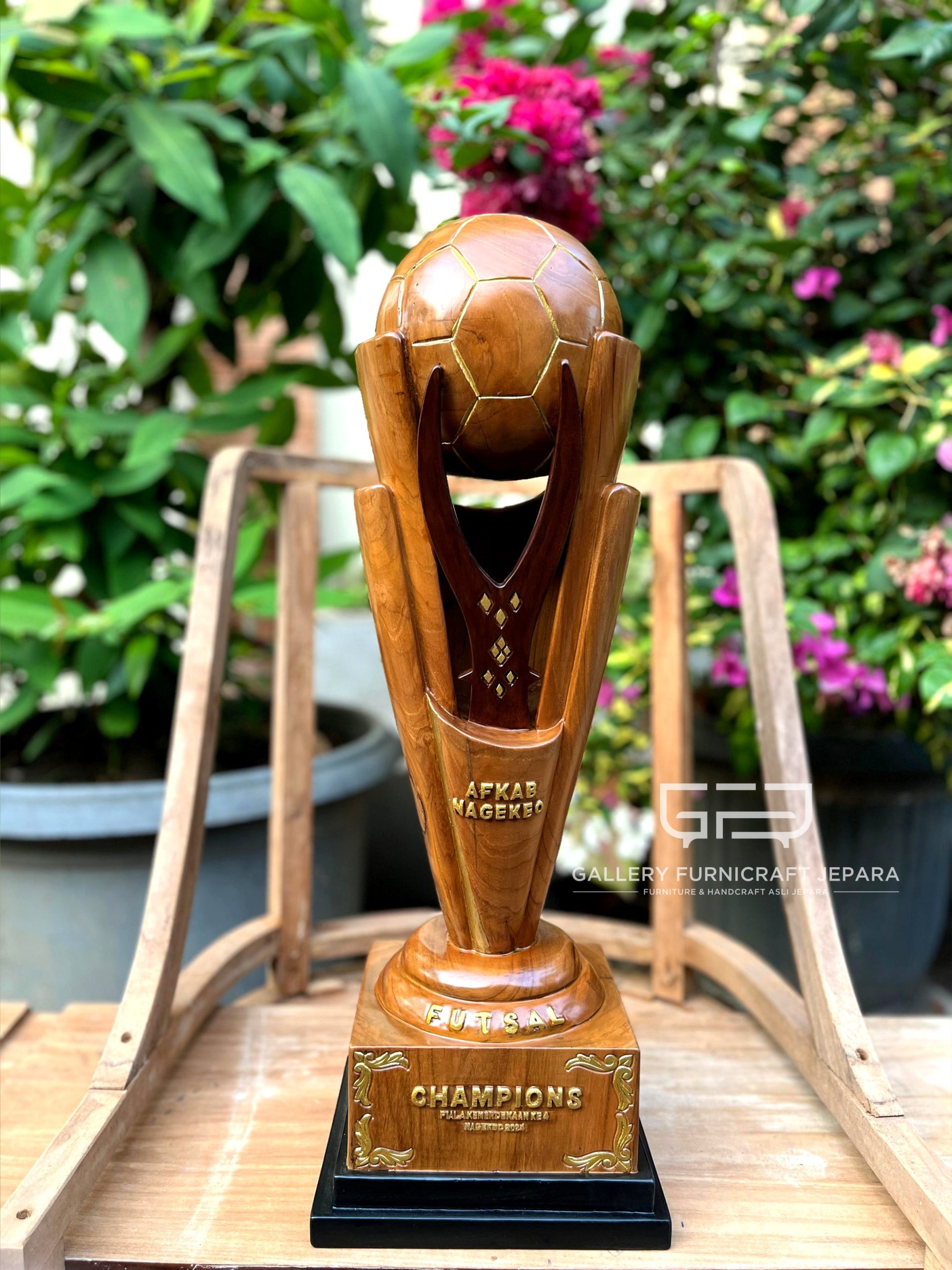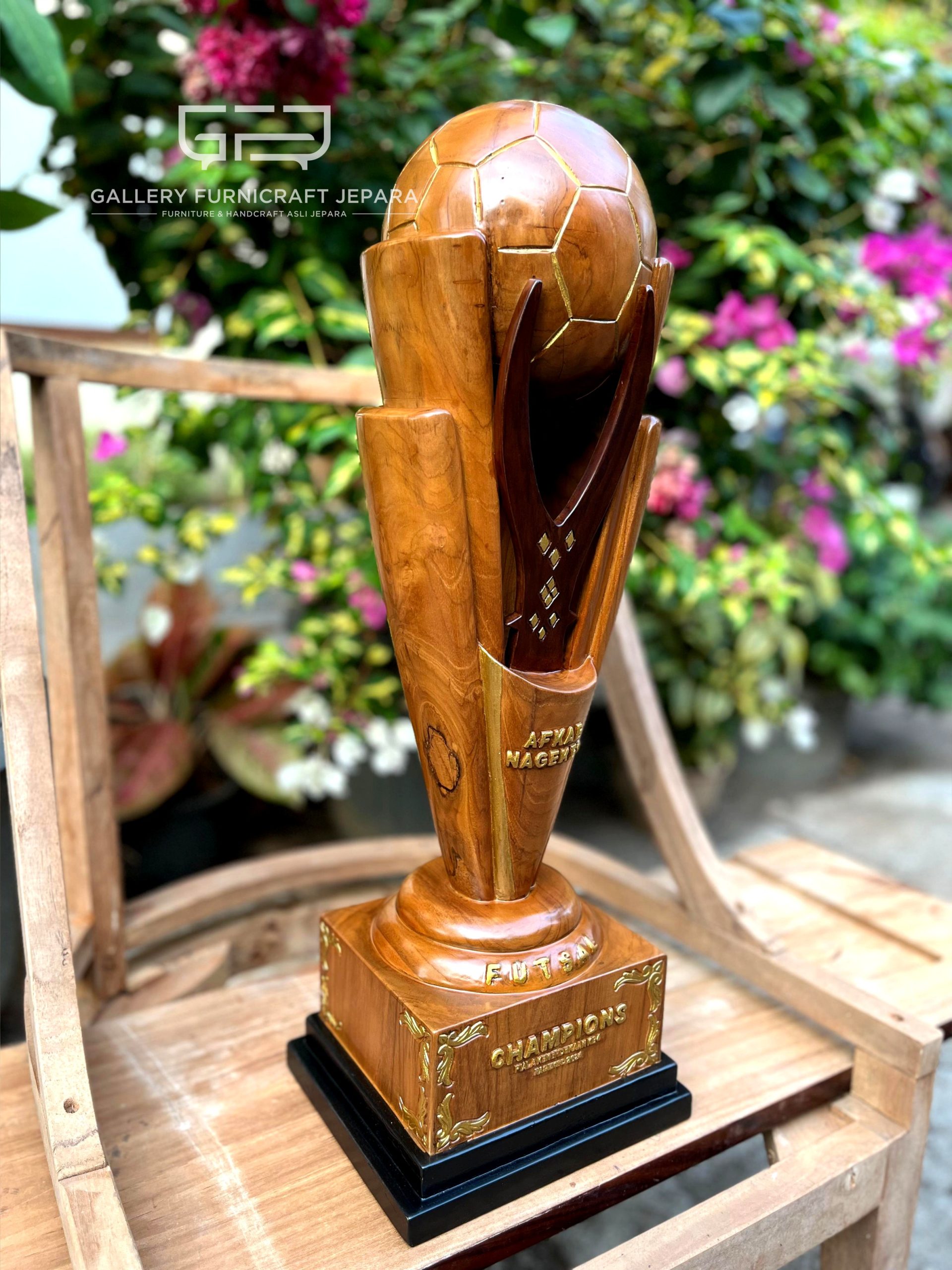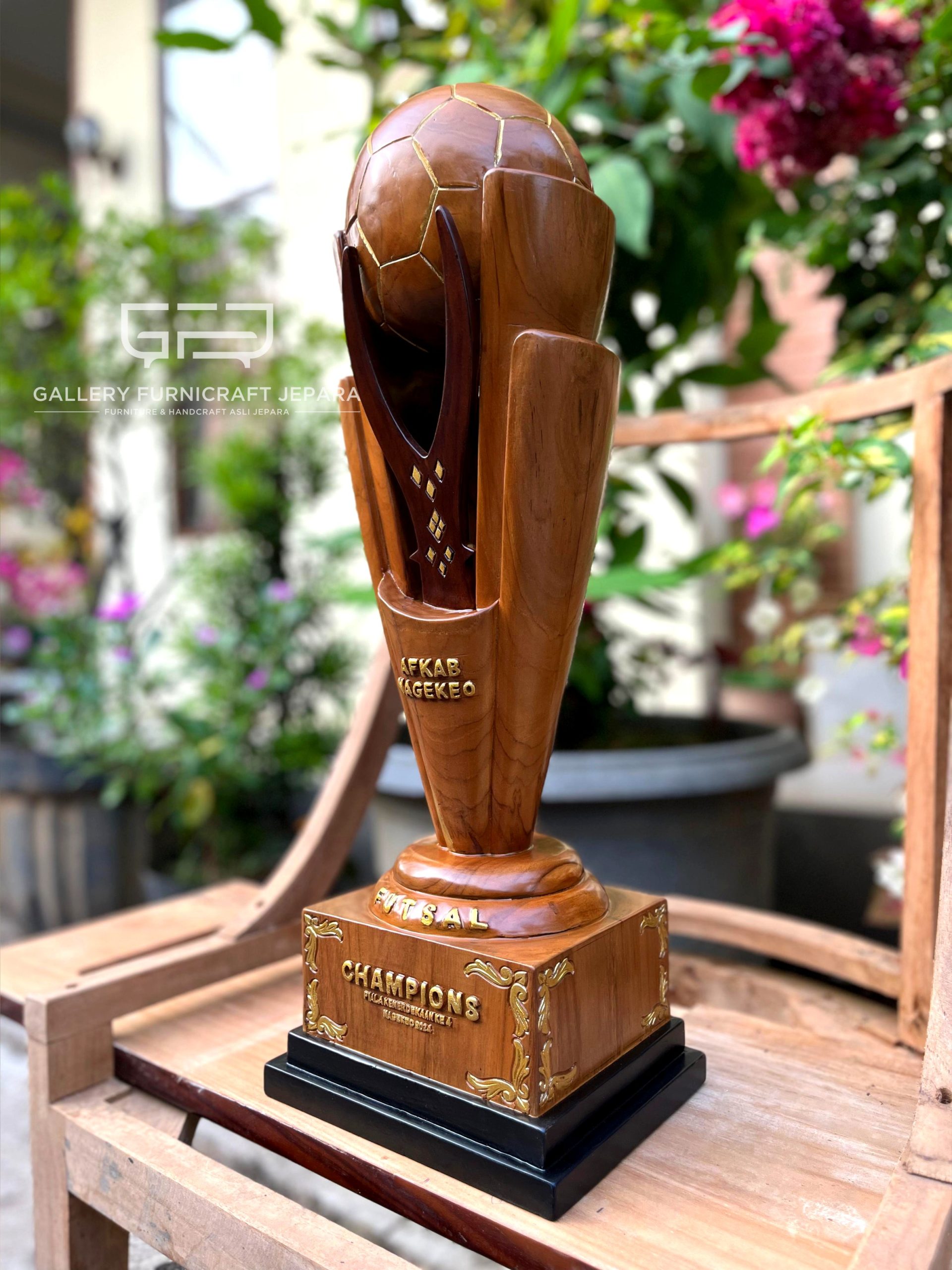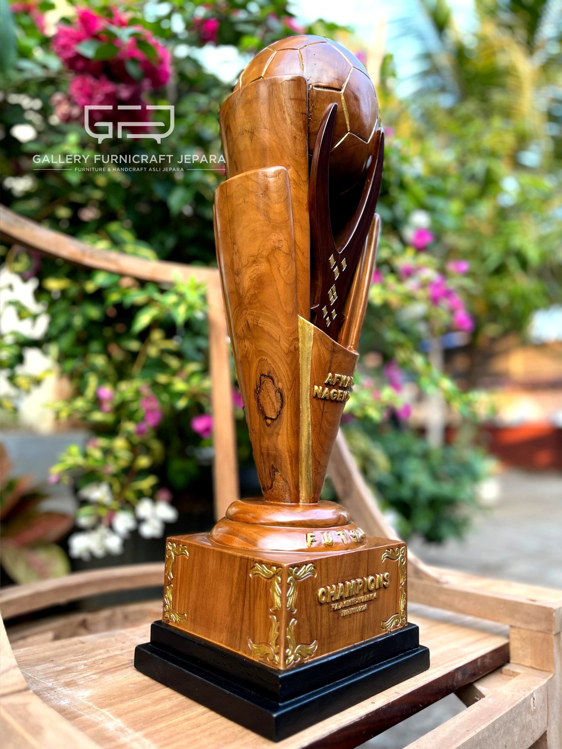 Custom piala untuk turnamen sepakbola/futsal. Material kayu jati solid, Finishing Natural Melamine Satin Doff.