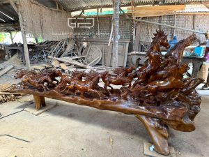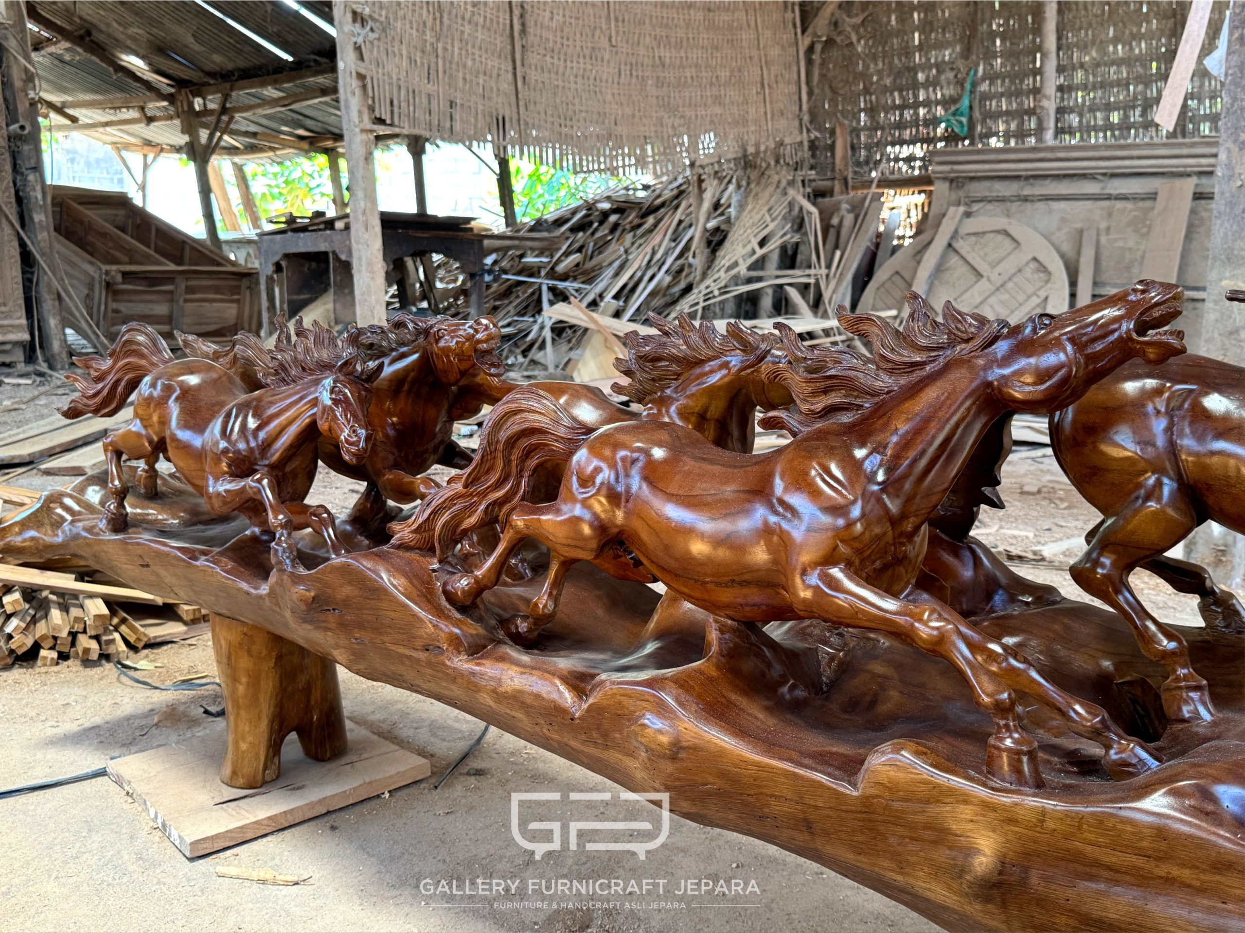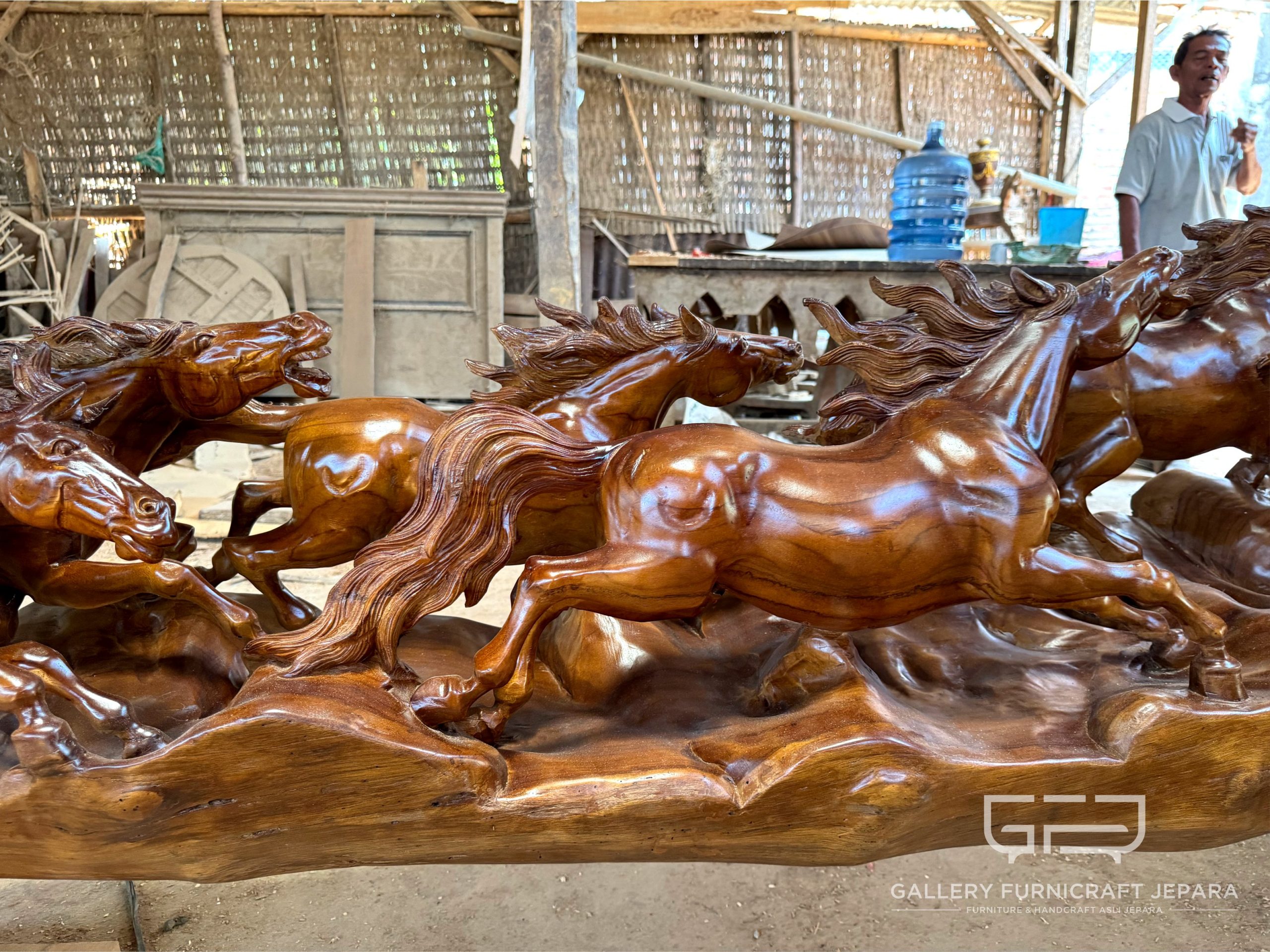 Relief kuda lari isi 8, material kayu jati solid, finishing natural melamine, made by Gallery Furnicraft Jepara.