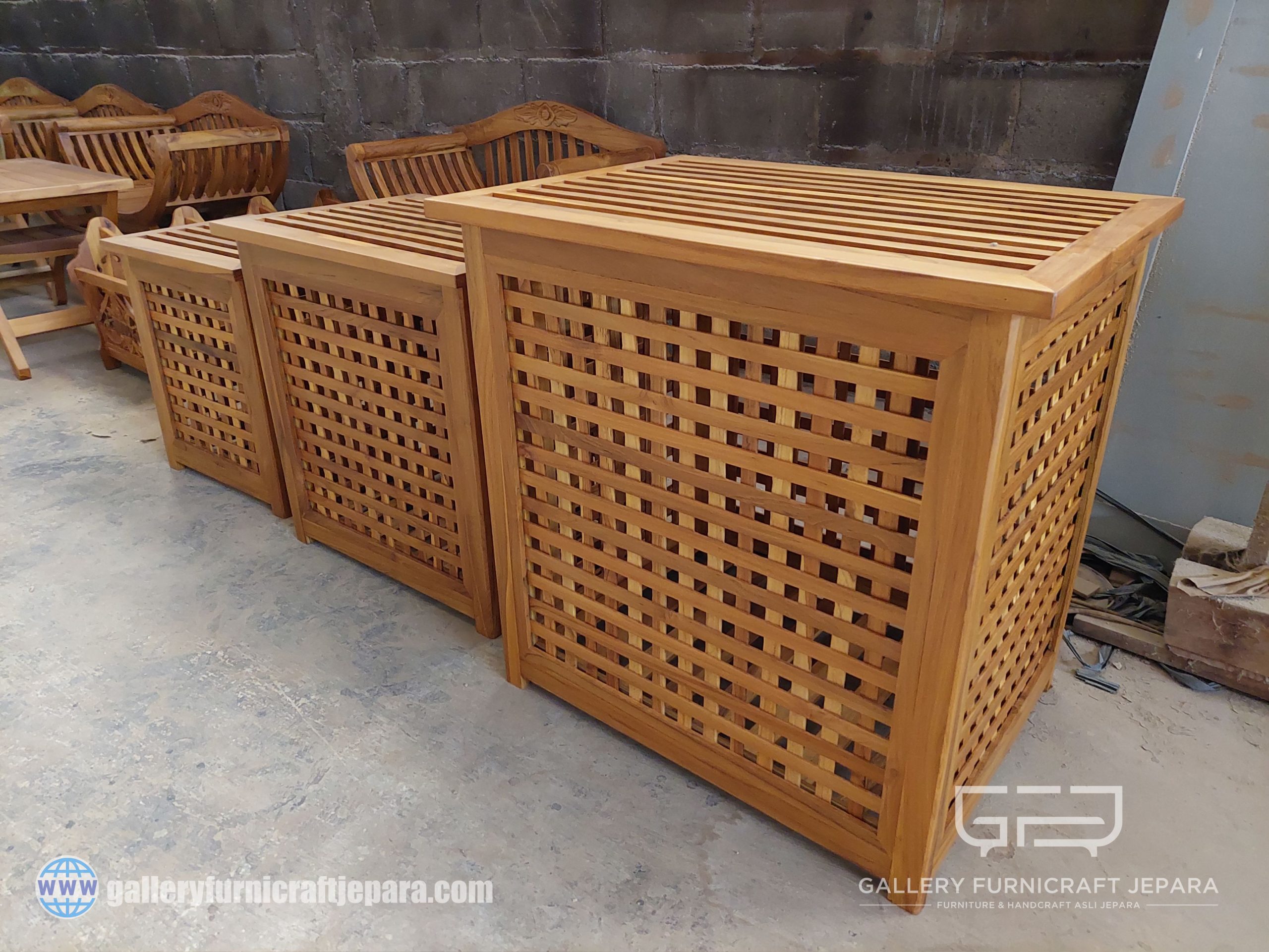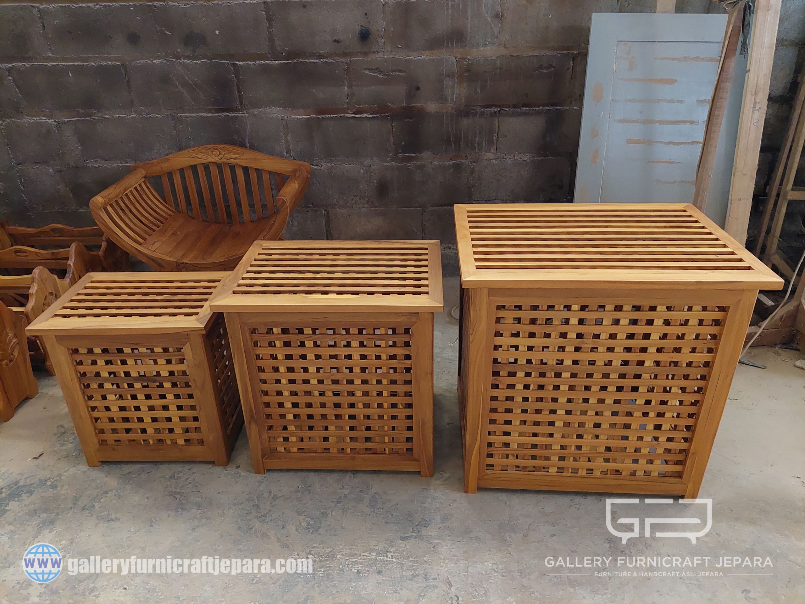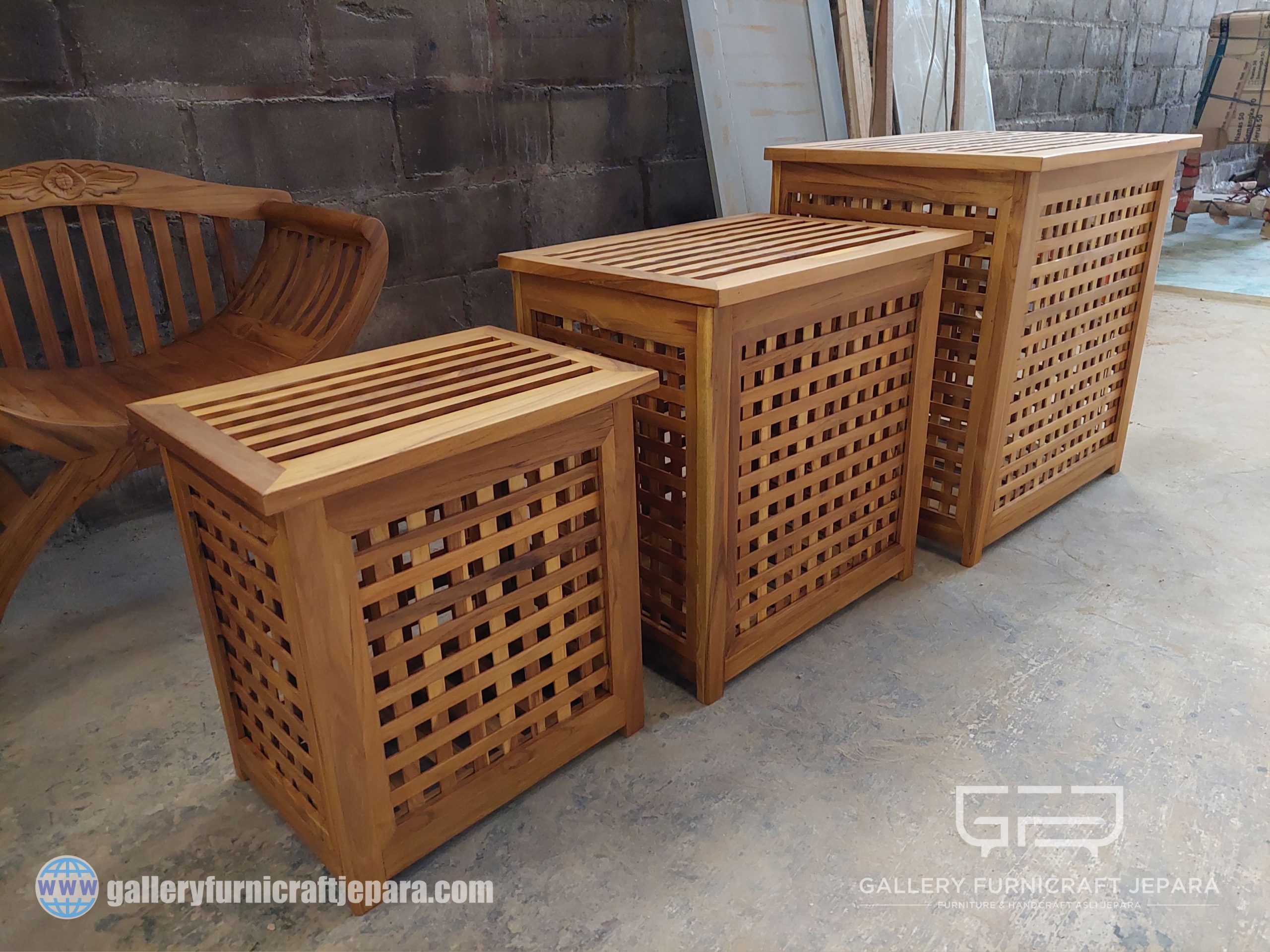 Keranjang baju kotor 1 sett isi 3 unit, material kayu jati kualitas terbaik (jati perhutani)kuat dan tidak mudah patah, finishing melamine doff yang menampilkan serat indah kayu jati.