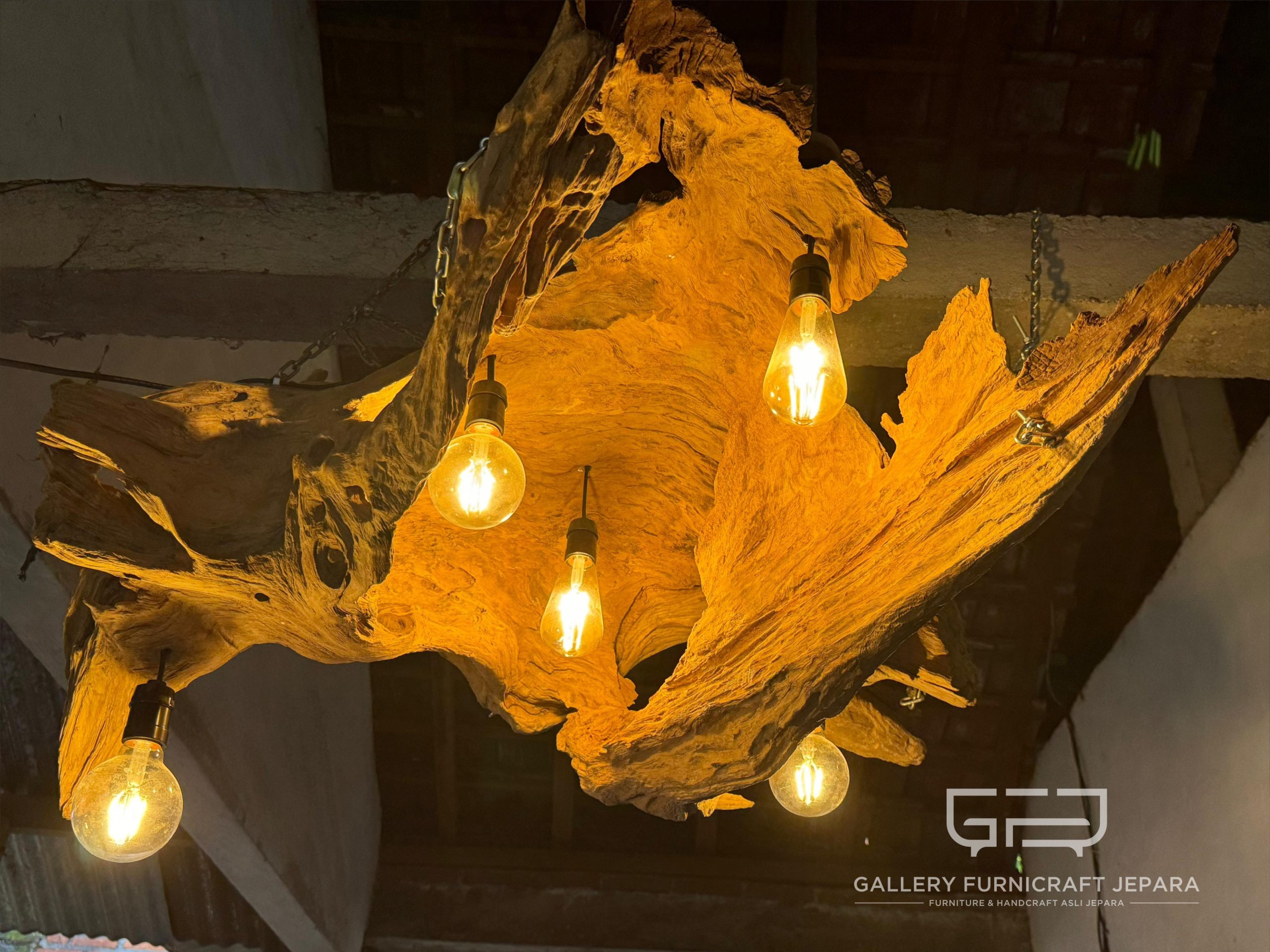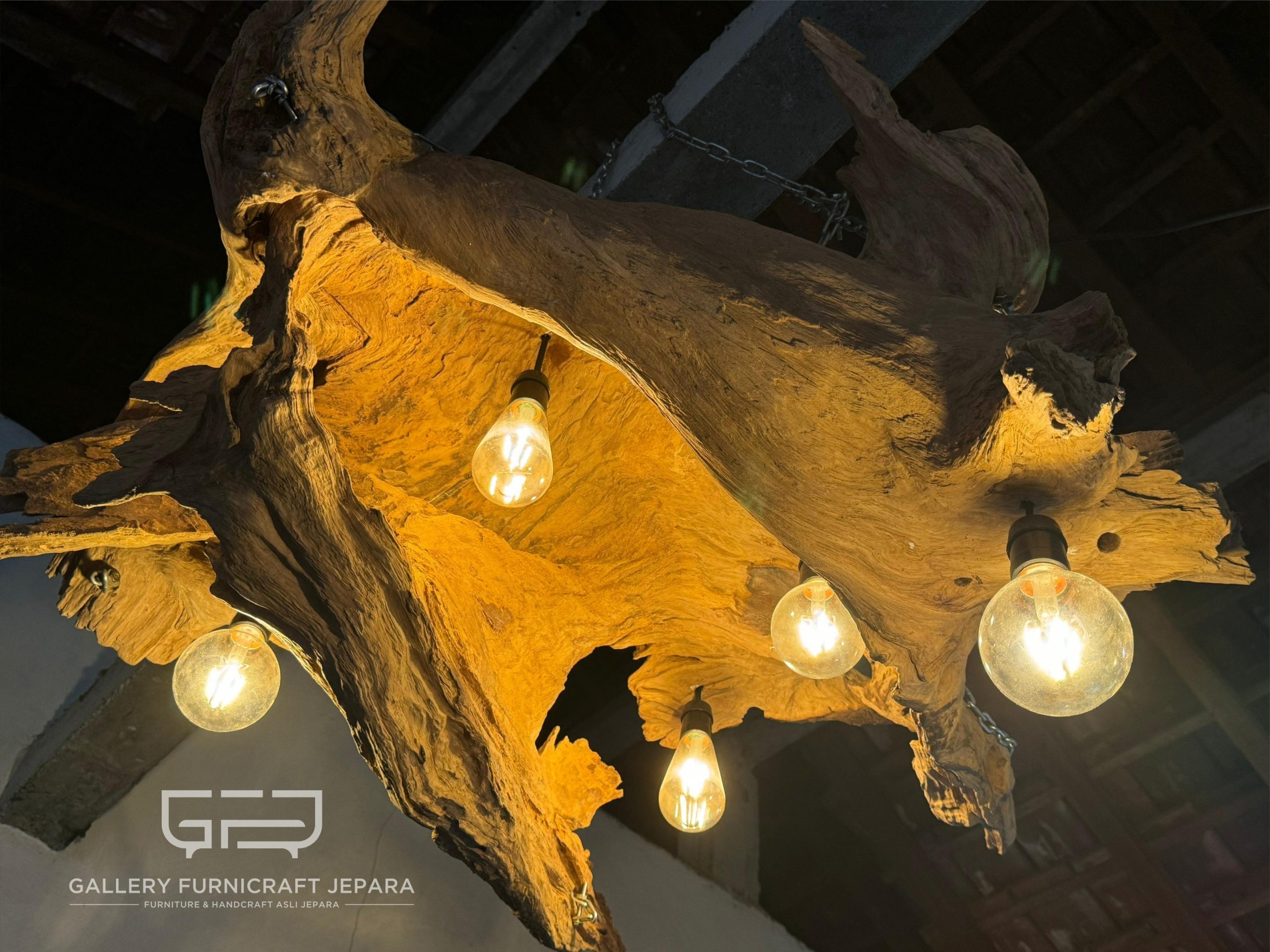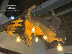 Lampu gantung material jati alami erosi yang sudah sangat tua dan keras secara alami, cocok digunakan untuk dekorasi hotel/villa/meja makan untuk indoor maupun outdoor, made by Gallery Furnicraft Jepara.