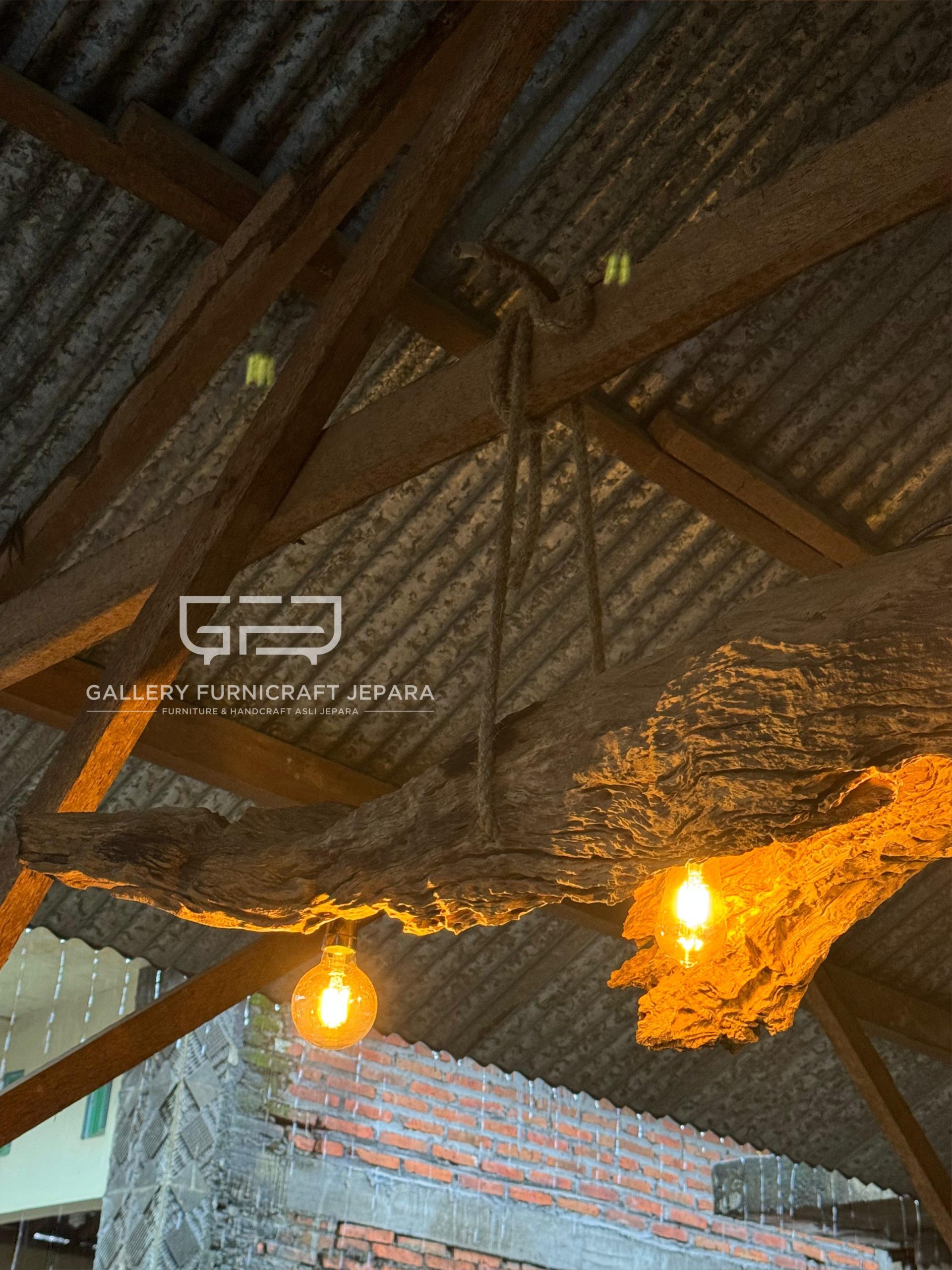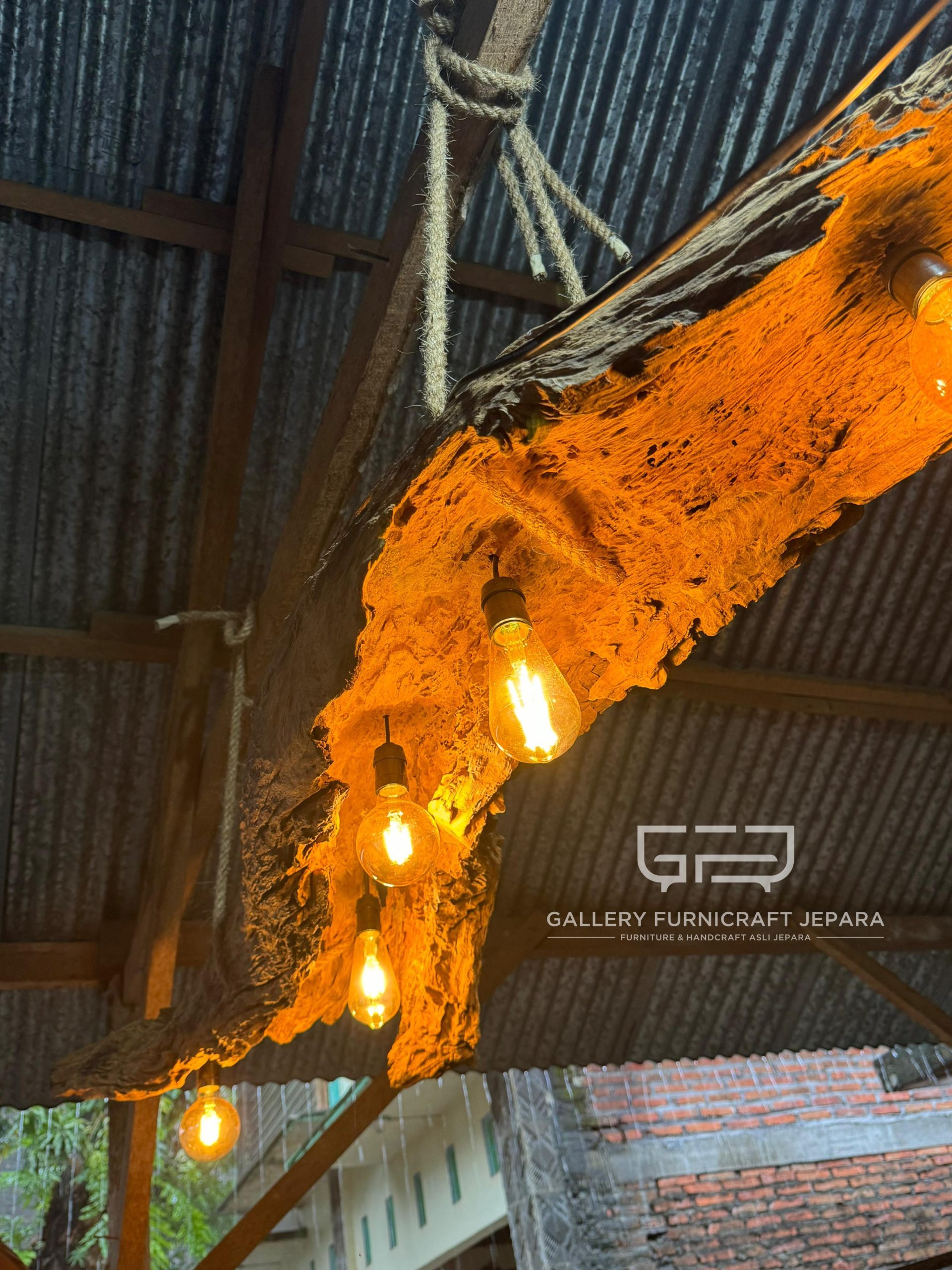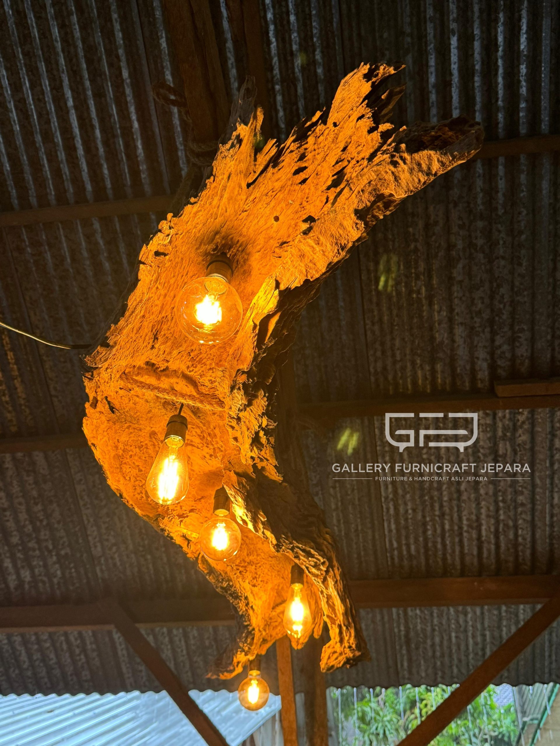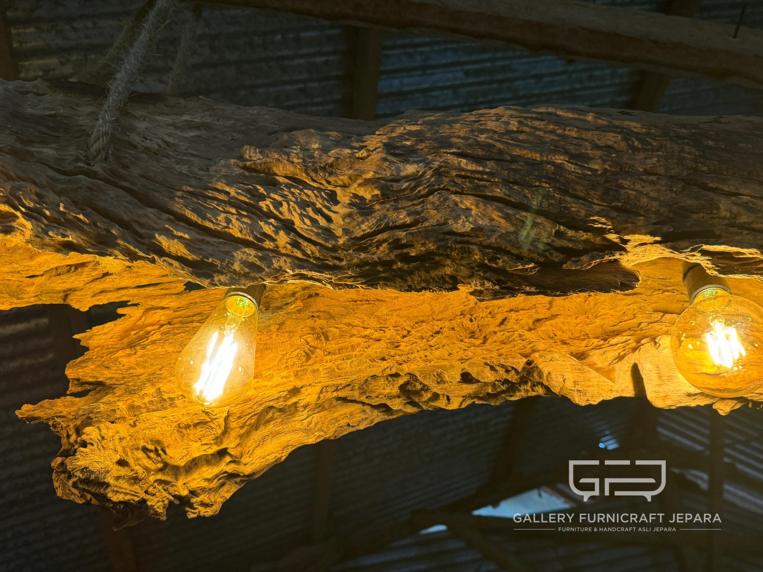 Lampu gantung material jati alami erosi yang sudah sabgat tua dan keras secara alami, cocok digunakan untuk dekorasi hotel/villa/meja makan untuk indoor maupun outdoor, made by Gallery Furnicraft Jepara.