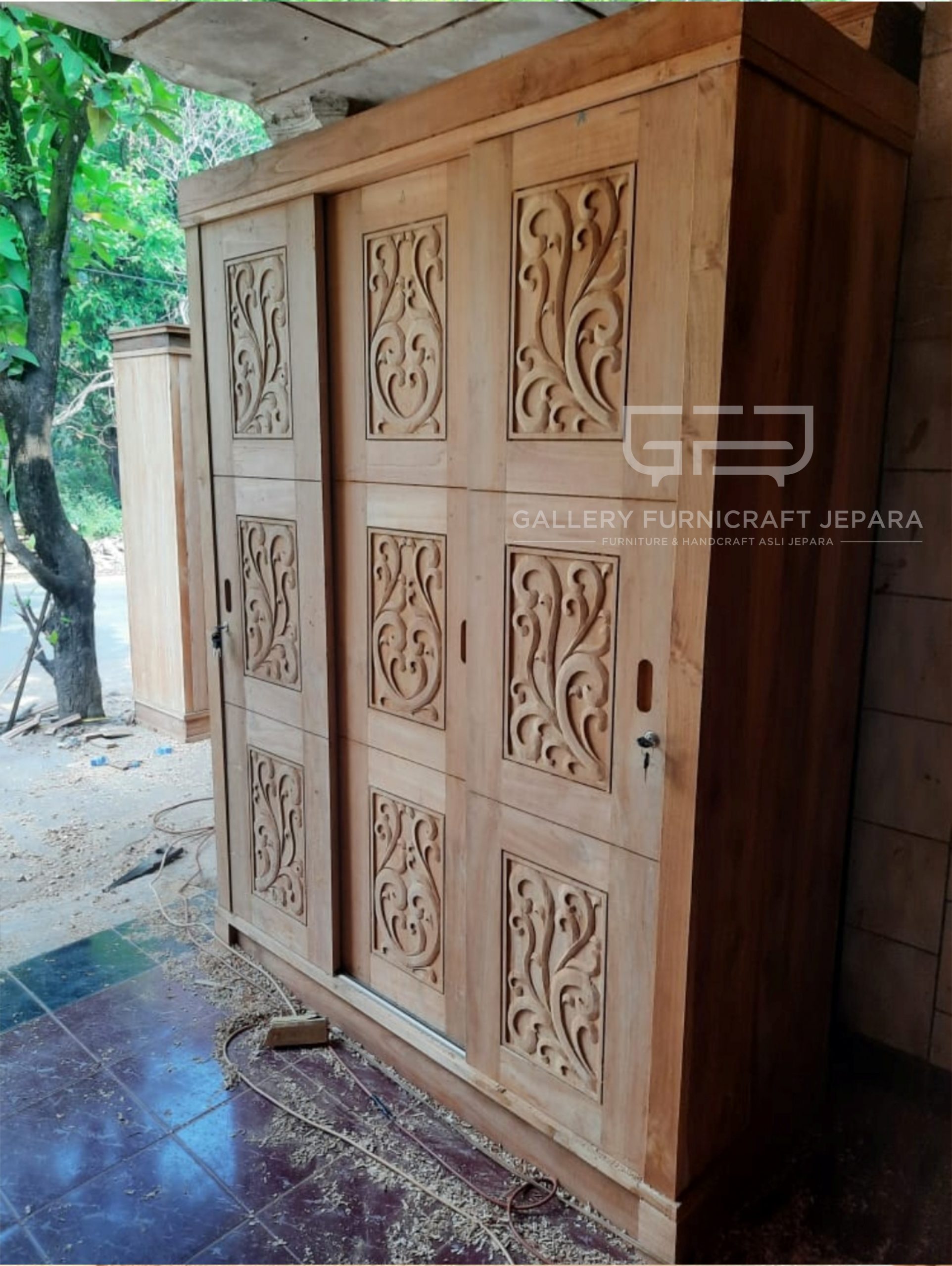 LEMARI PAKAIAN 3 PINTU SLIDING FULL KAYU JATI TERMASUK FINISHING [export quality product]