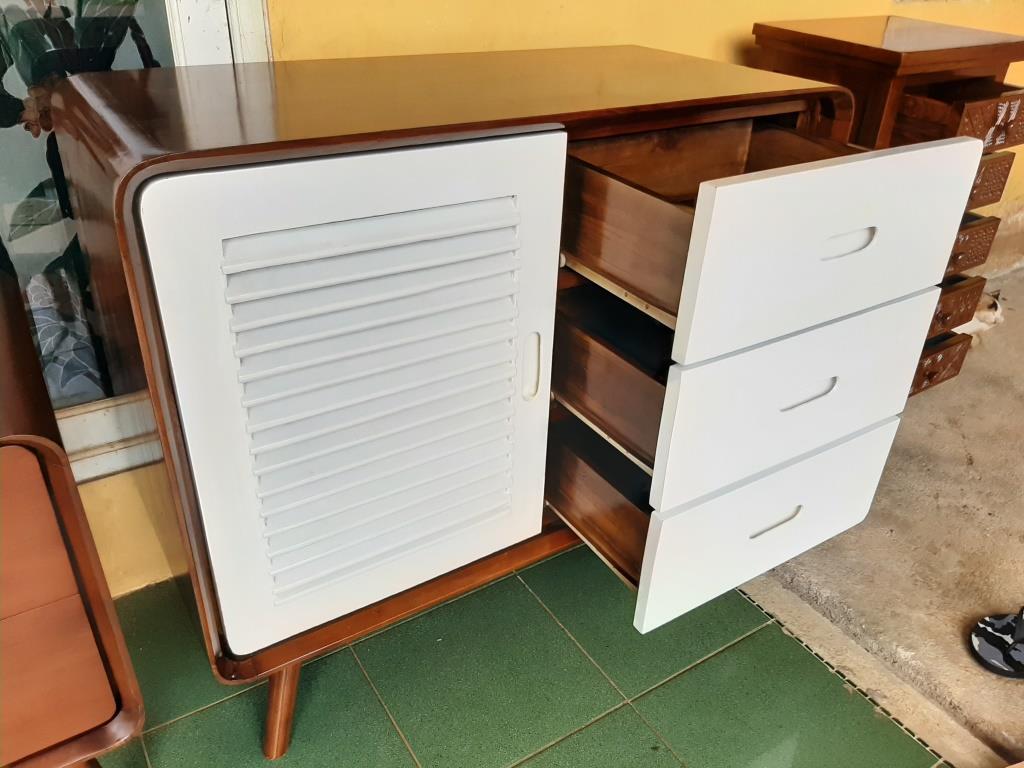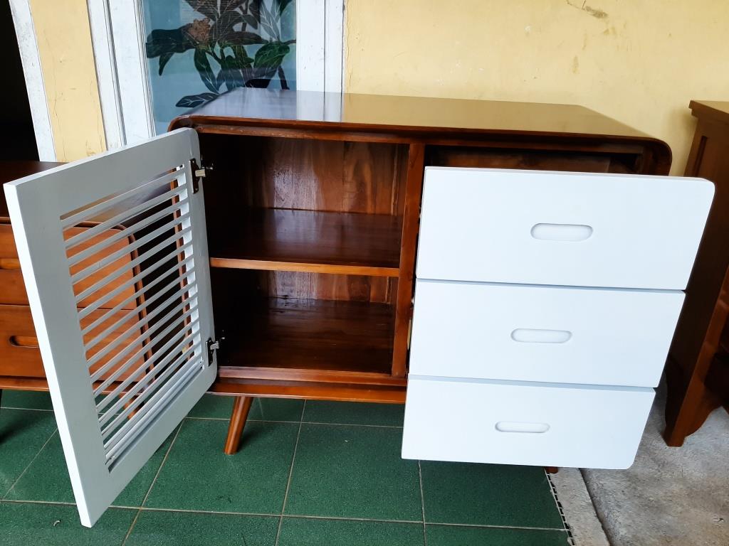 Best seller lemari retro, dapat digunakan sebagai lemari pakaian maupun kabinet dengan penyimpanan serbaguna, bahan baku kayu jati grade A dan finishing duco kombinasi natural.