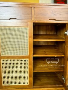 Lemari sepatu minimalis rotan, material kayu jati kualitas terbaik, terdapat 2 pintu isi 4 hambalan sepatu dan 2 laci, finishing natural melamine, made by Gallery Furnicraft Jepara.