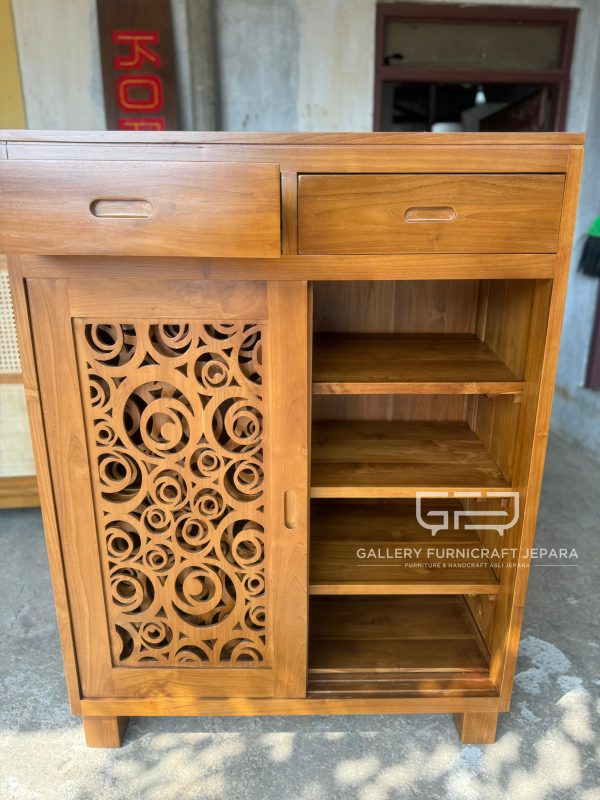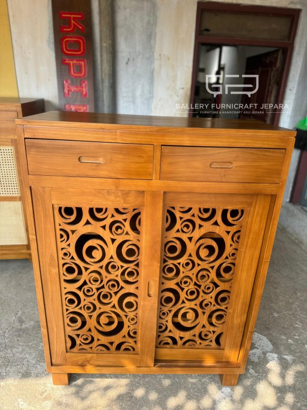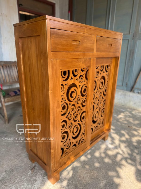 Lemari sepatu pintu slide ukiran tribal material kayu jati kualitas terbaik, terdapat 2 pintu isi 4 hambalan sepatu dan 2 laci, finishing natural melamine, made by Gallery Furnicraft Jepara.