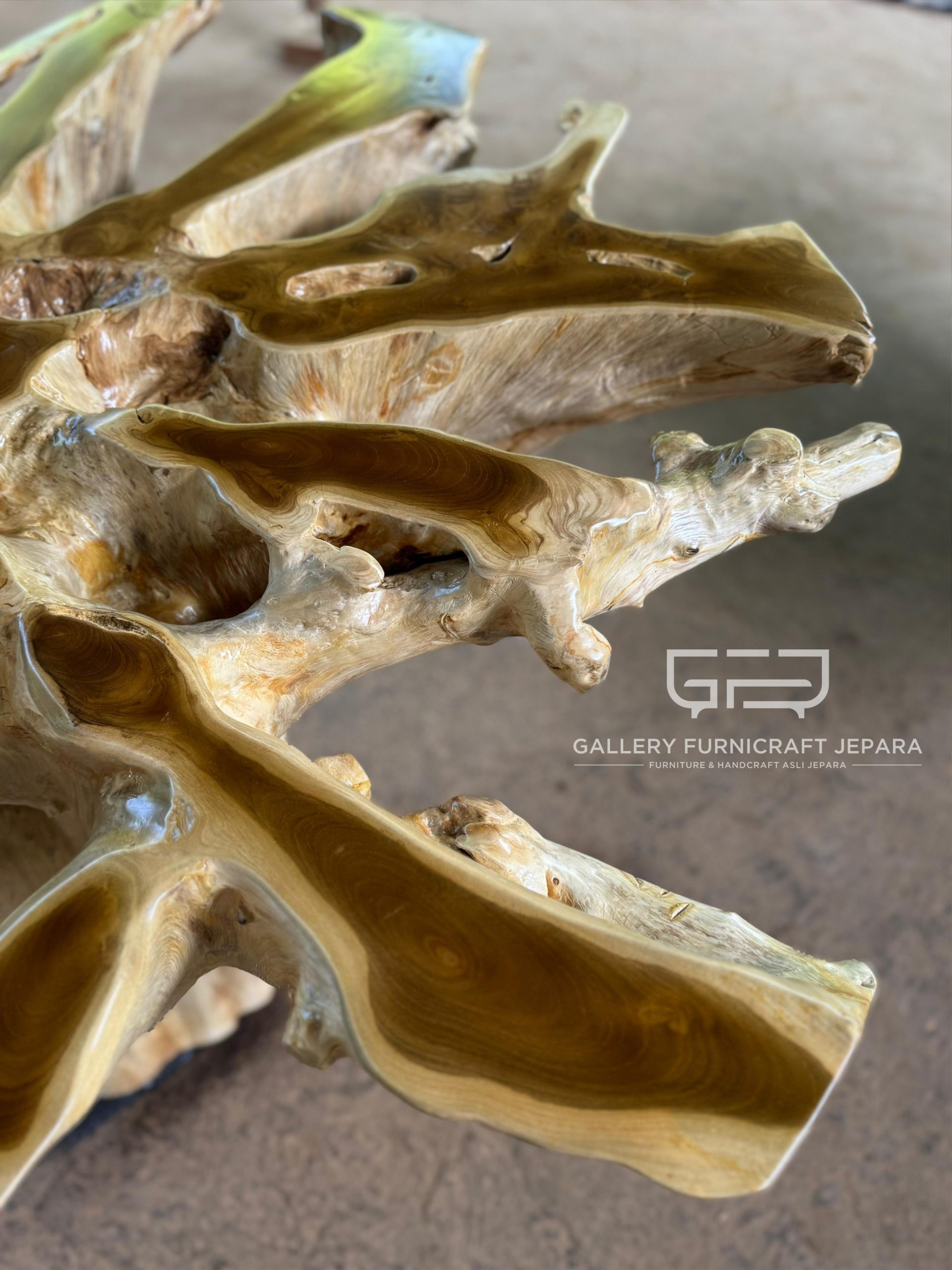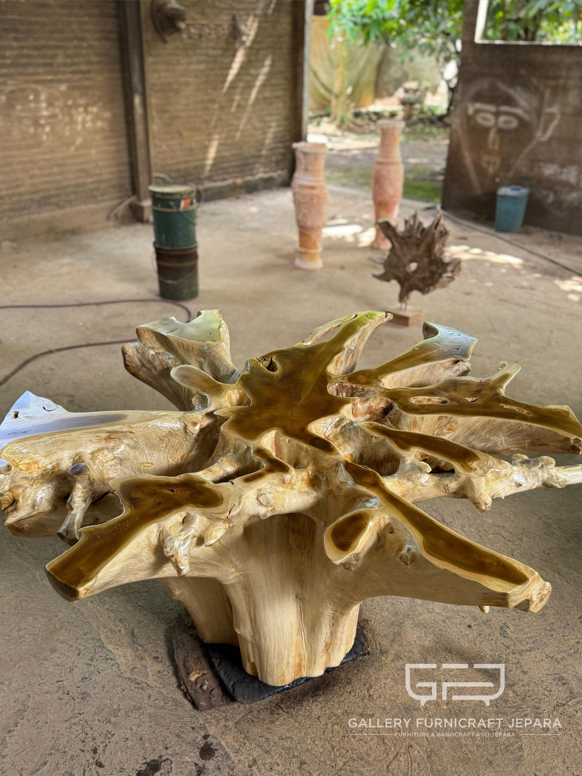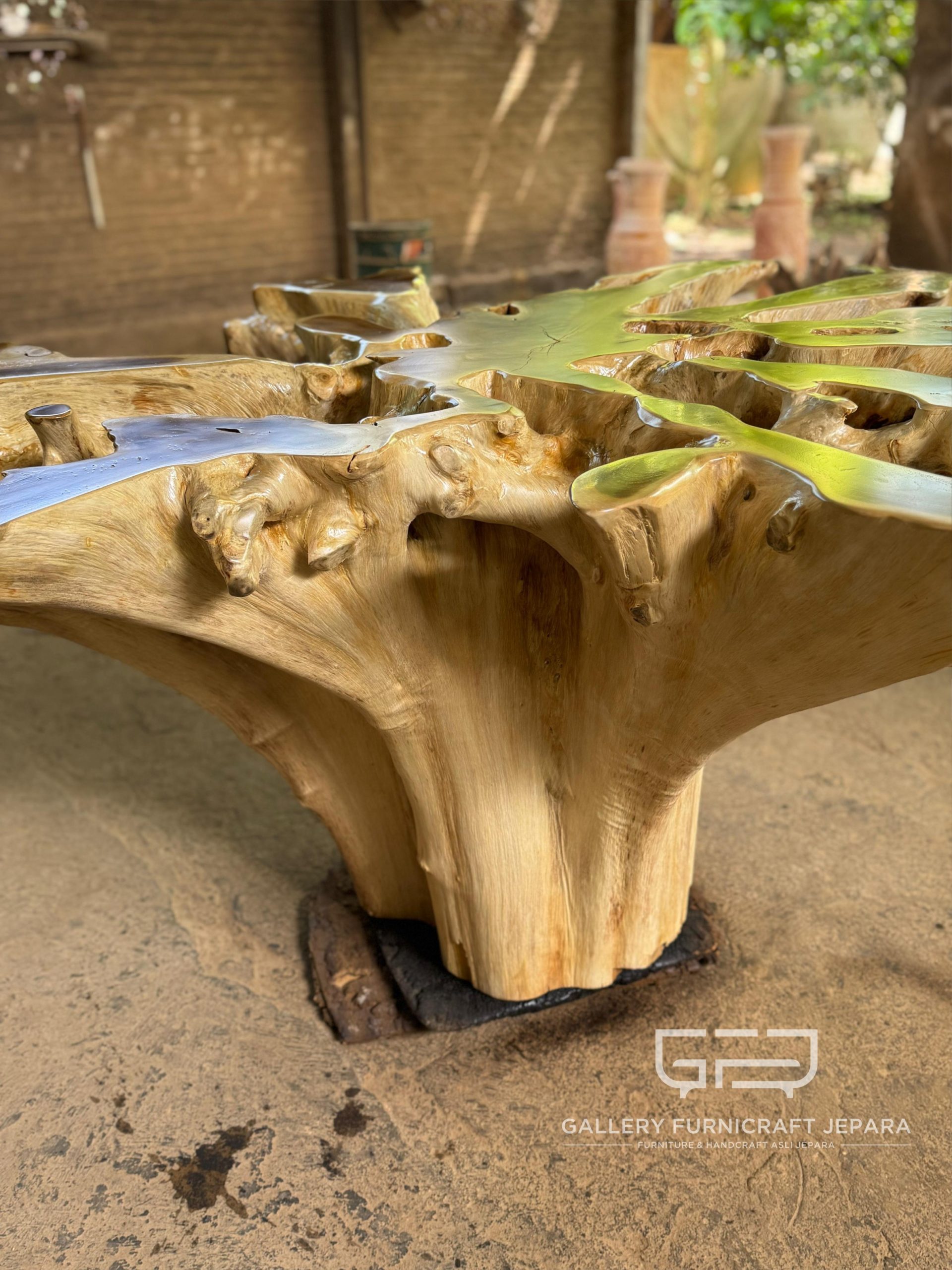 Cocok untuk meja meeteng, meja makan, meja tengah, meja hotel dll, material akar jati utuh tanpa sambungan, kayu tua dan kering, product by Gallery Furnicraft Jepara.