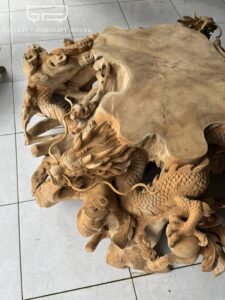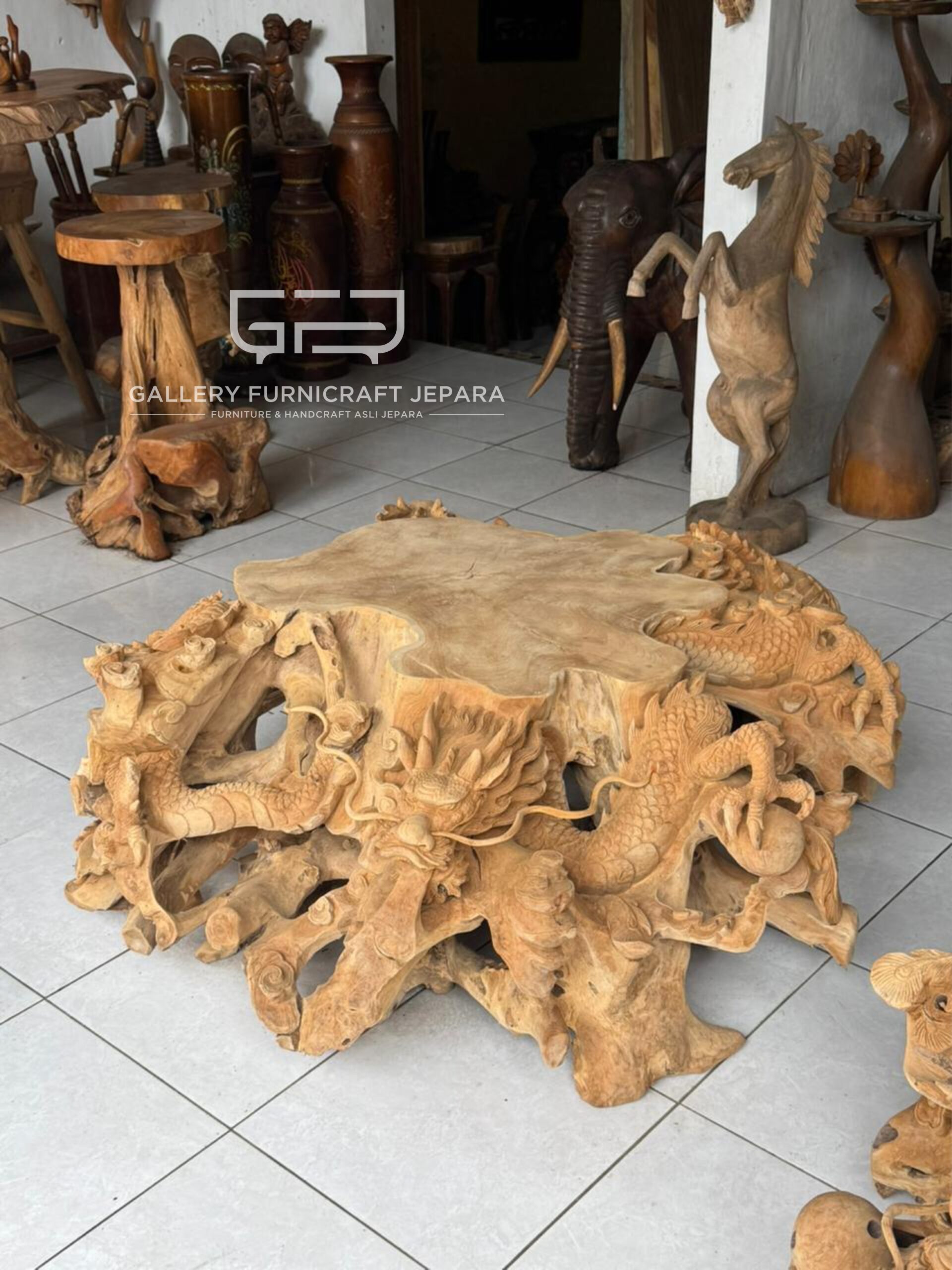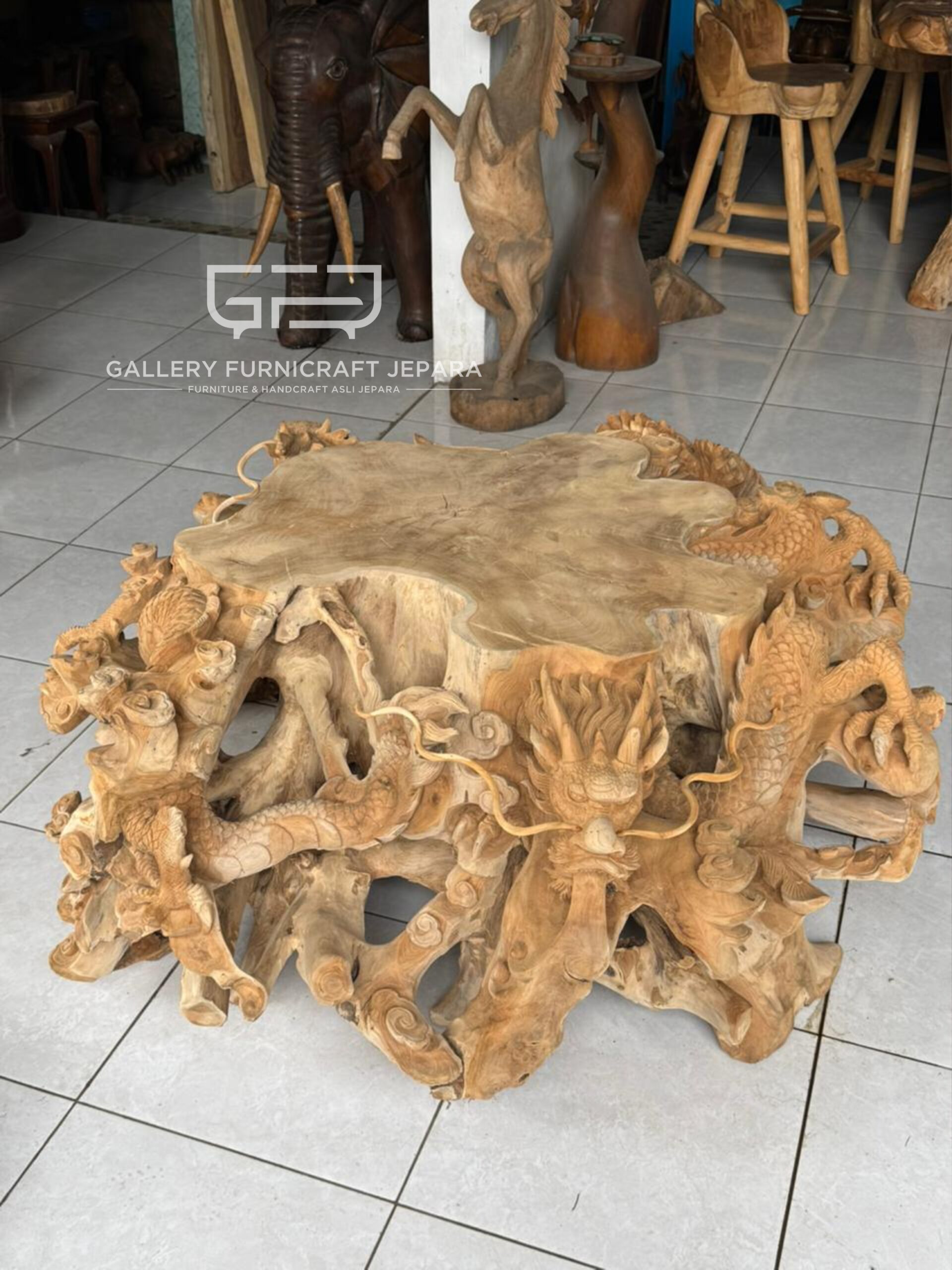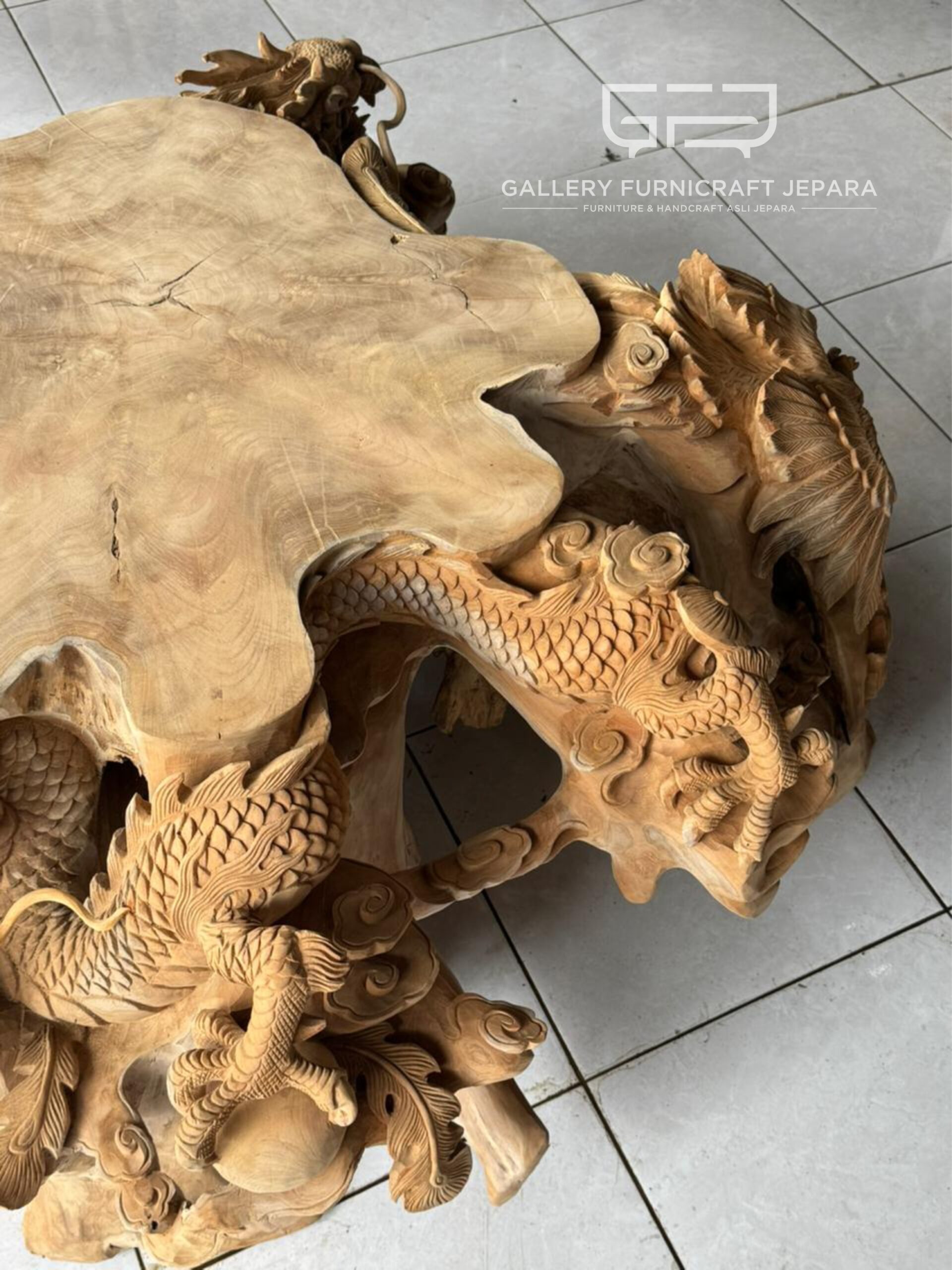 Ready, meja akar jati pendem solid ukiran naga vs burung poenix, Original Product by Gallery Furnicraft Jepara