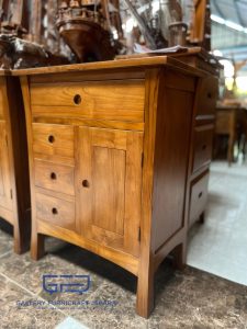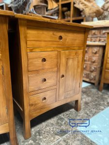 Nakas kabinet dengan banyak storage penyimpanan, terdapat pintu dan laci, material kayu jati solid kualitas perhutani, dengan kualitas konstruksi kuat, finishing melamine satin doff.
