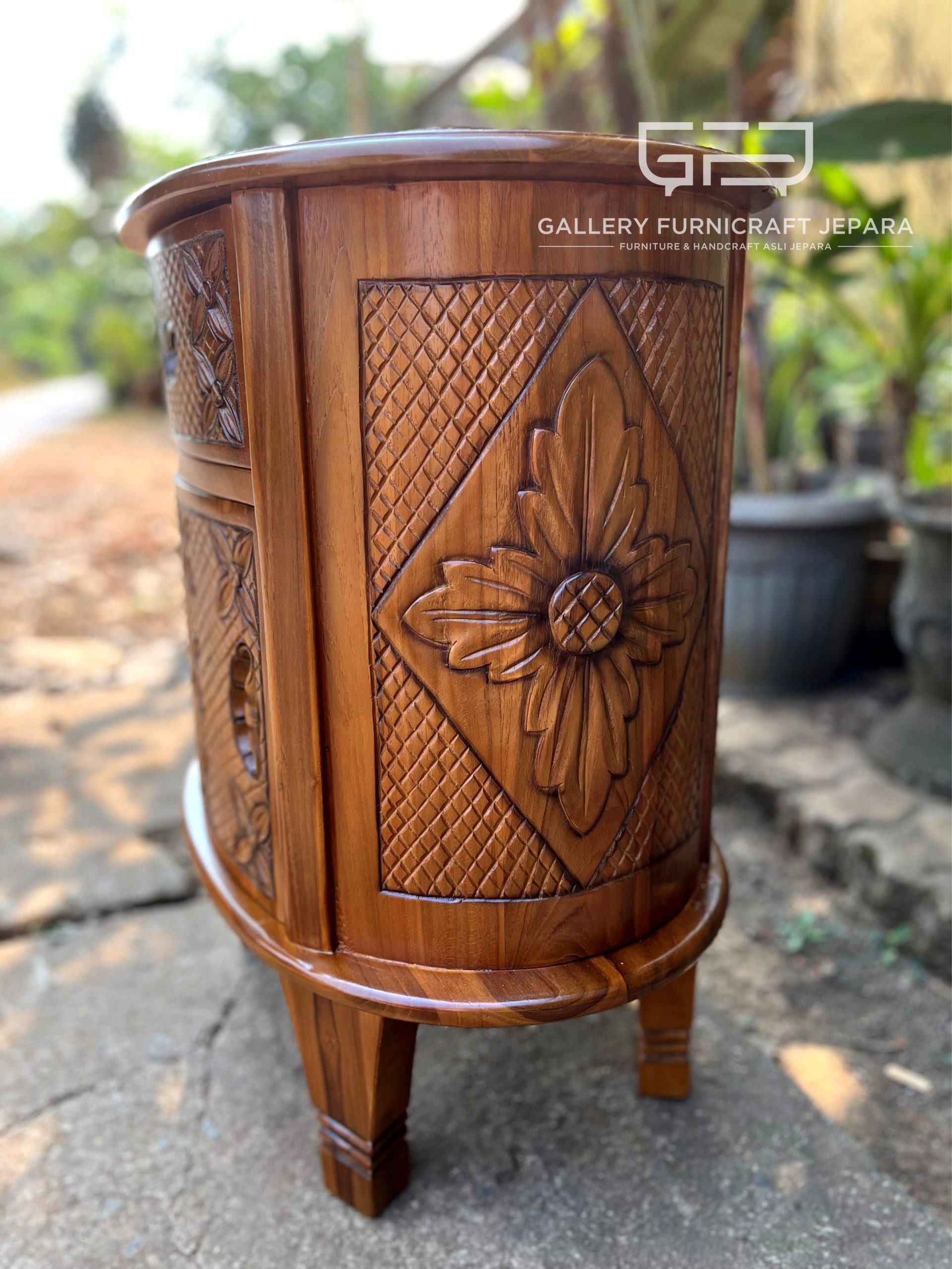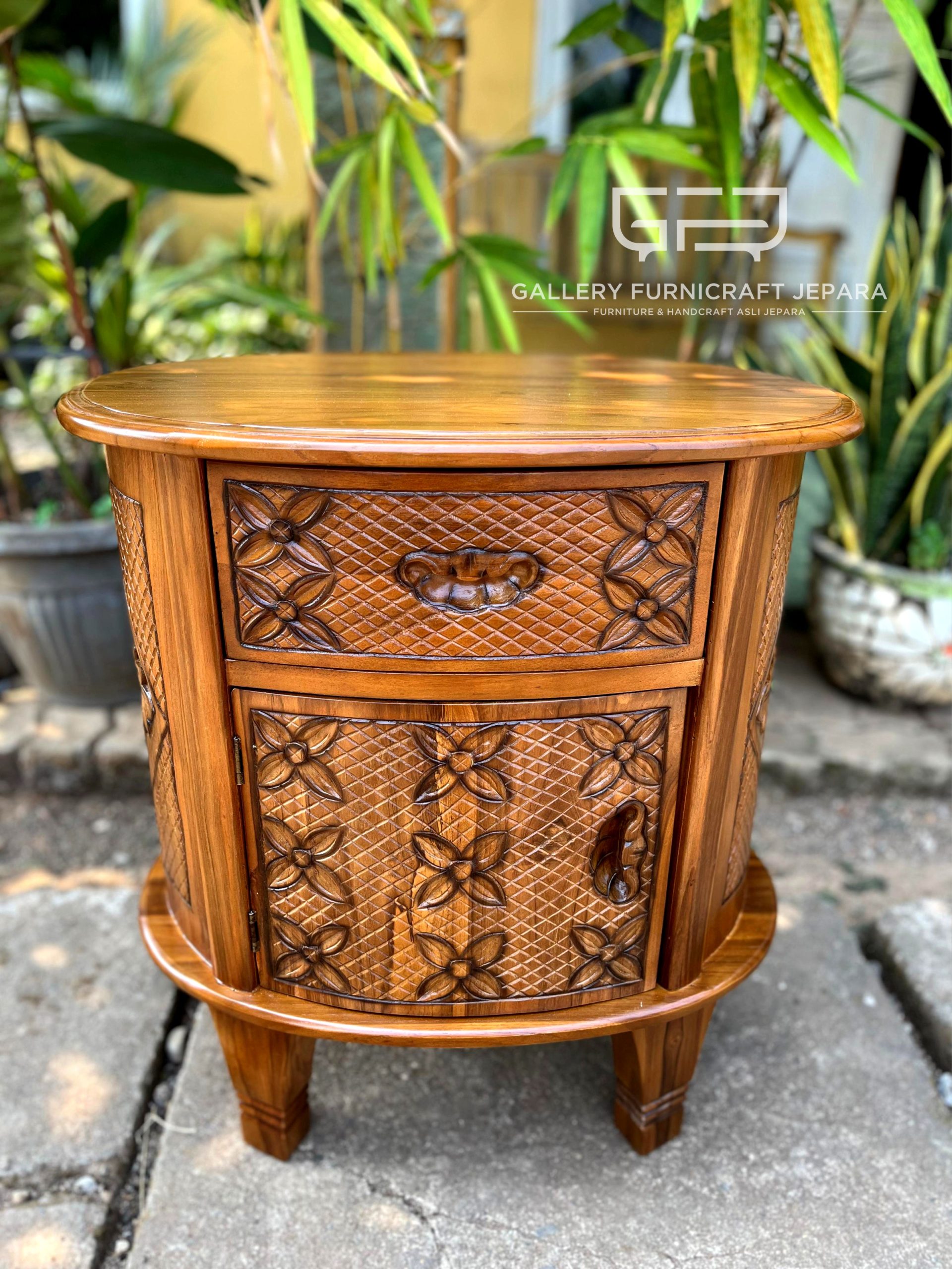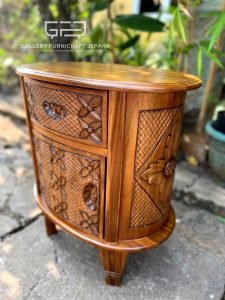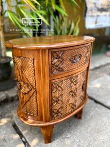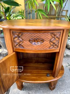 Meja nakas hongkong kawung, terdapat 1 pintu bawah dan 1 laci. Material kayu jati solid, Finishing Natural Melamine Glossy.