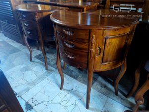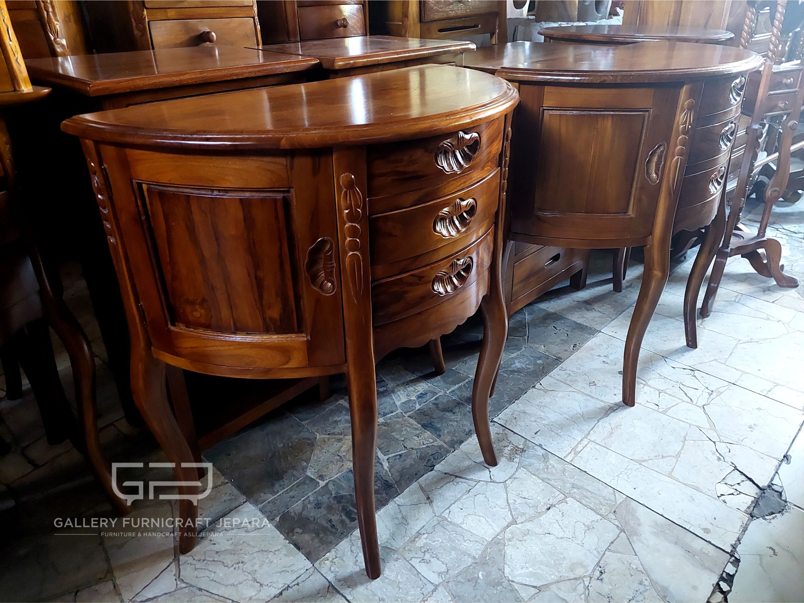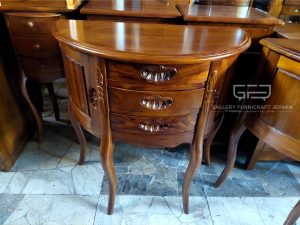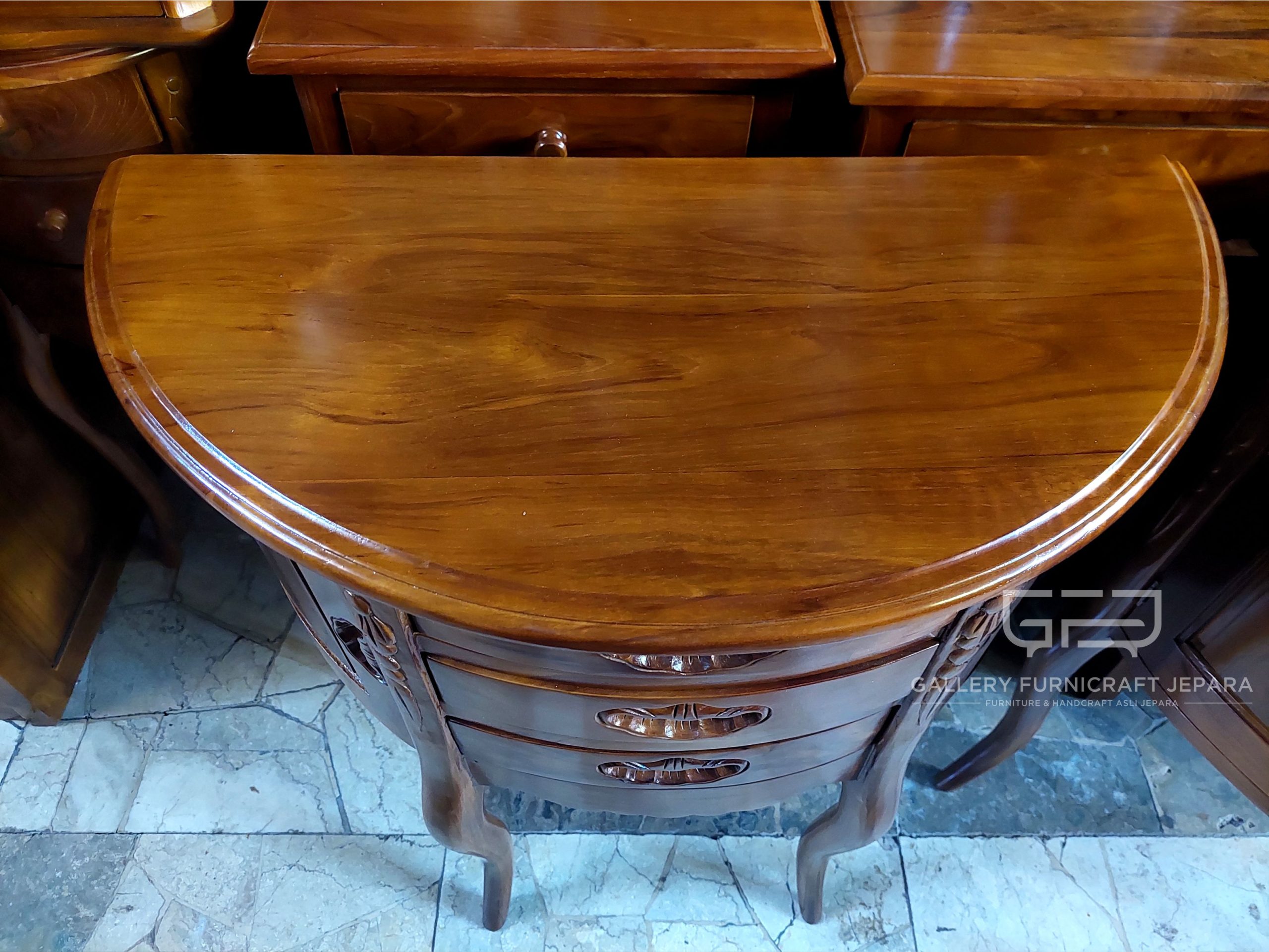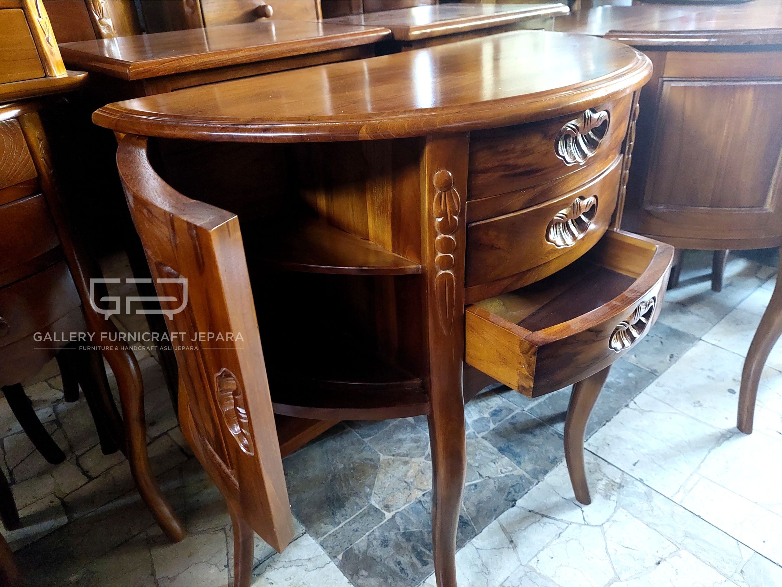 Meja nakas setengah lingkaran, Merupakan produk asli Jepara, Dilengkapi dengan 2 pintu & 3 laci, Bahan baku kayu jati berkualitas konstruksi kuat dan tahan lama, Finishing Natural Melamine.