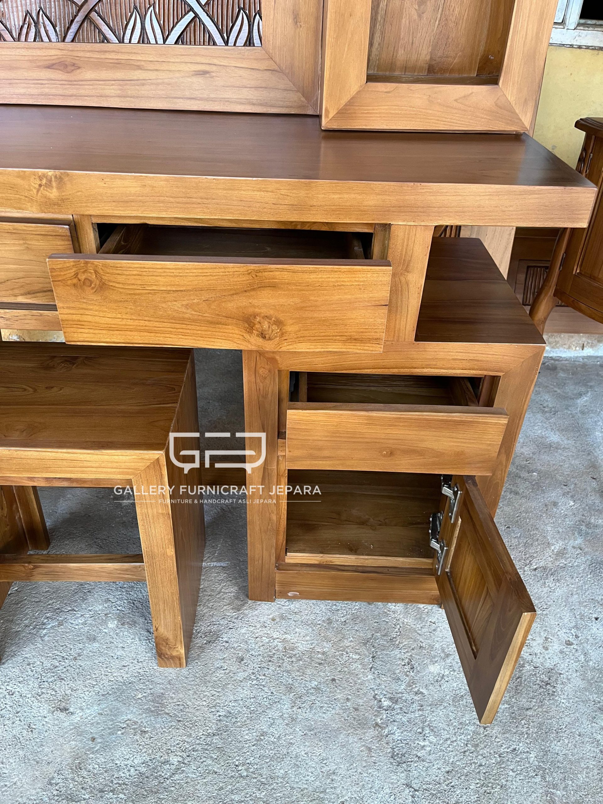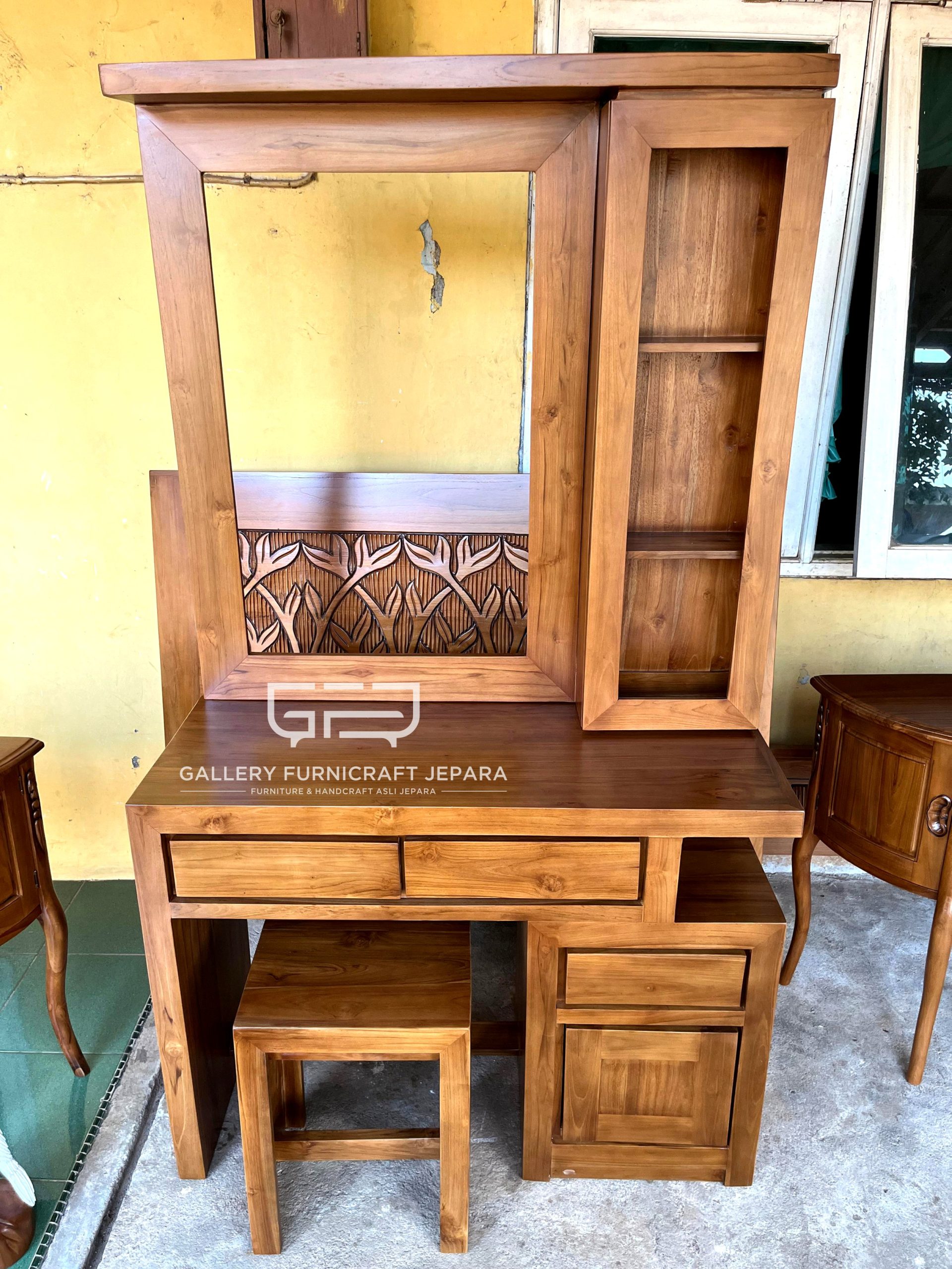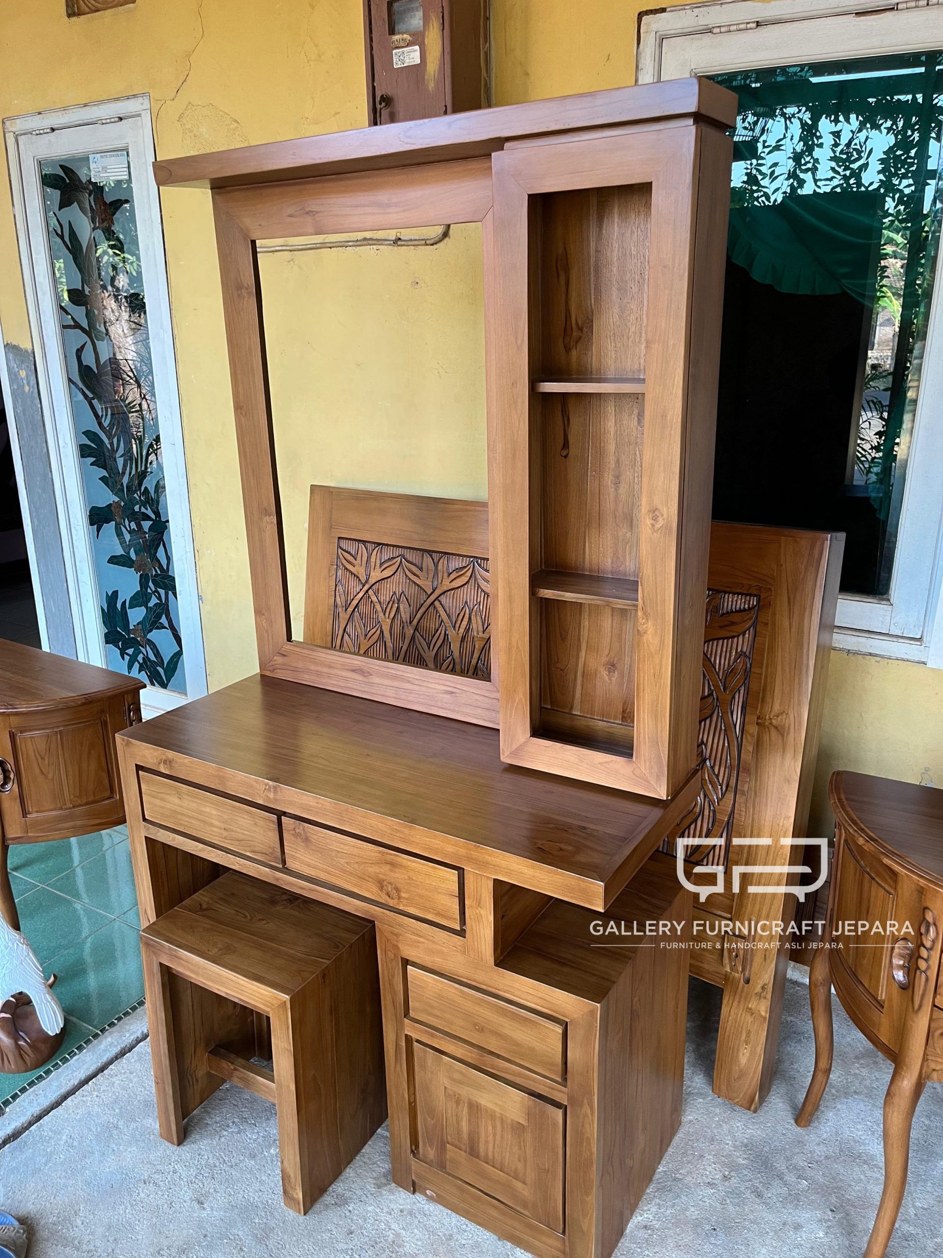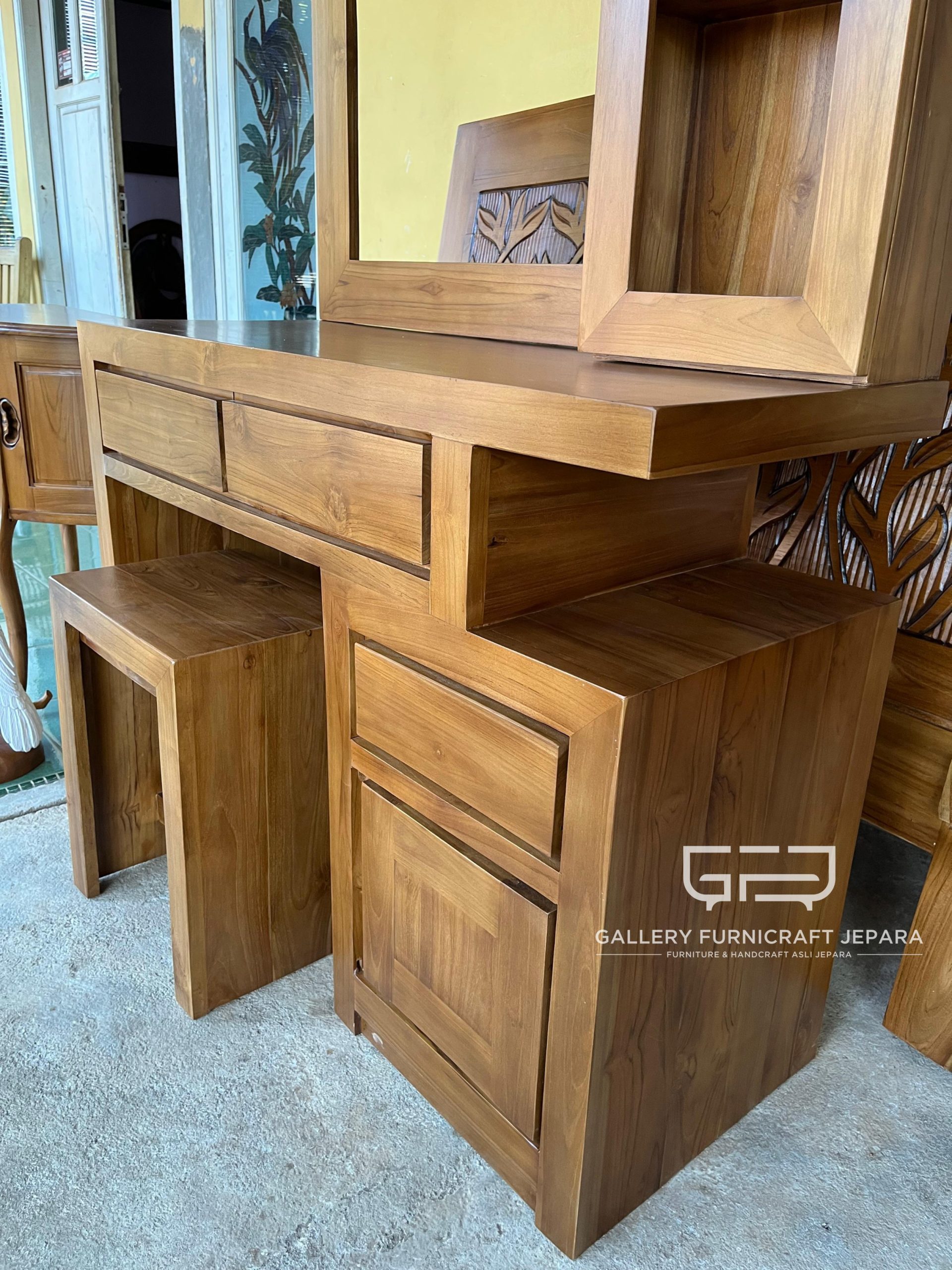 set meja rias minimalis dengan material kayu jati perhutani yang kuat corak/seratnya, finishing natural doff, made by Gallery Furnicraft Jepara.