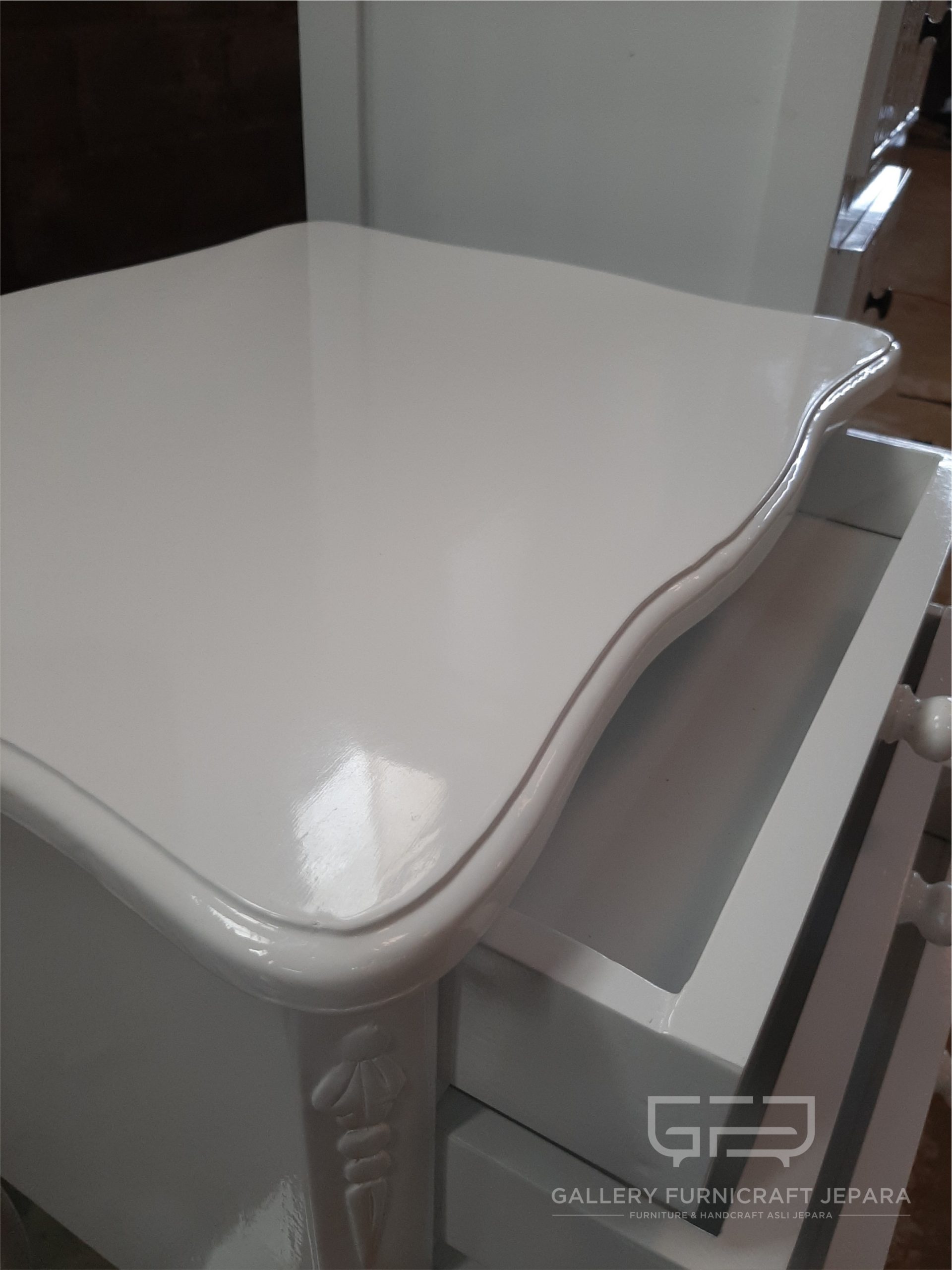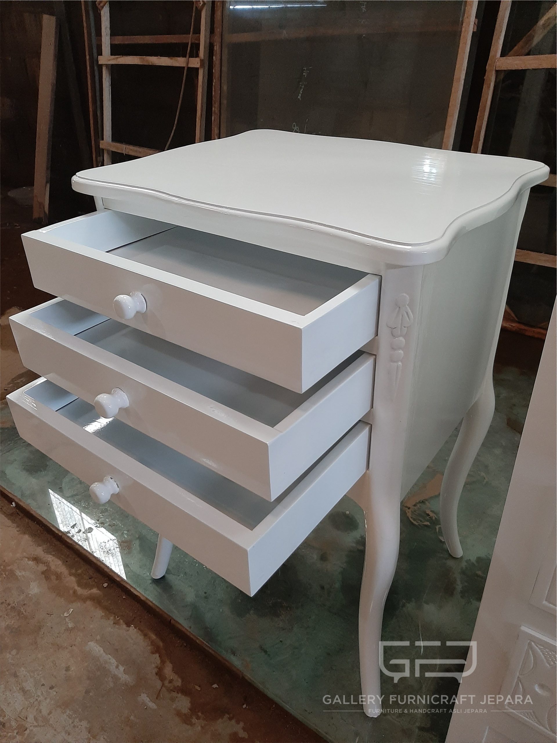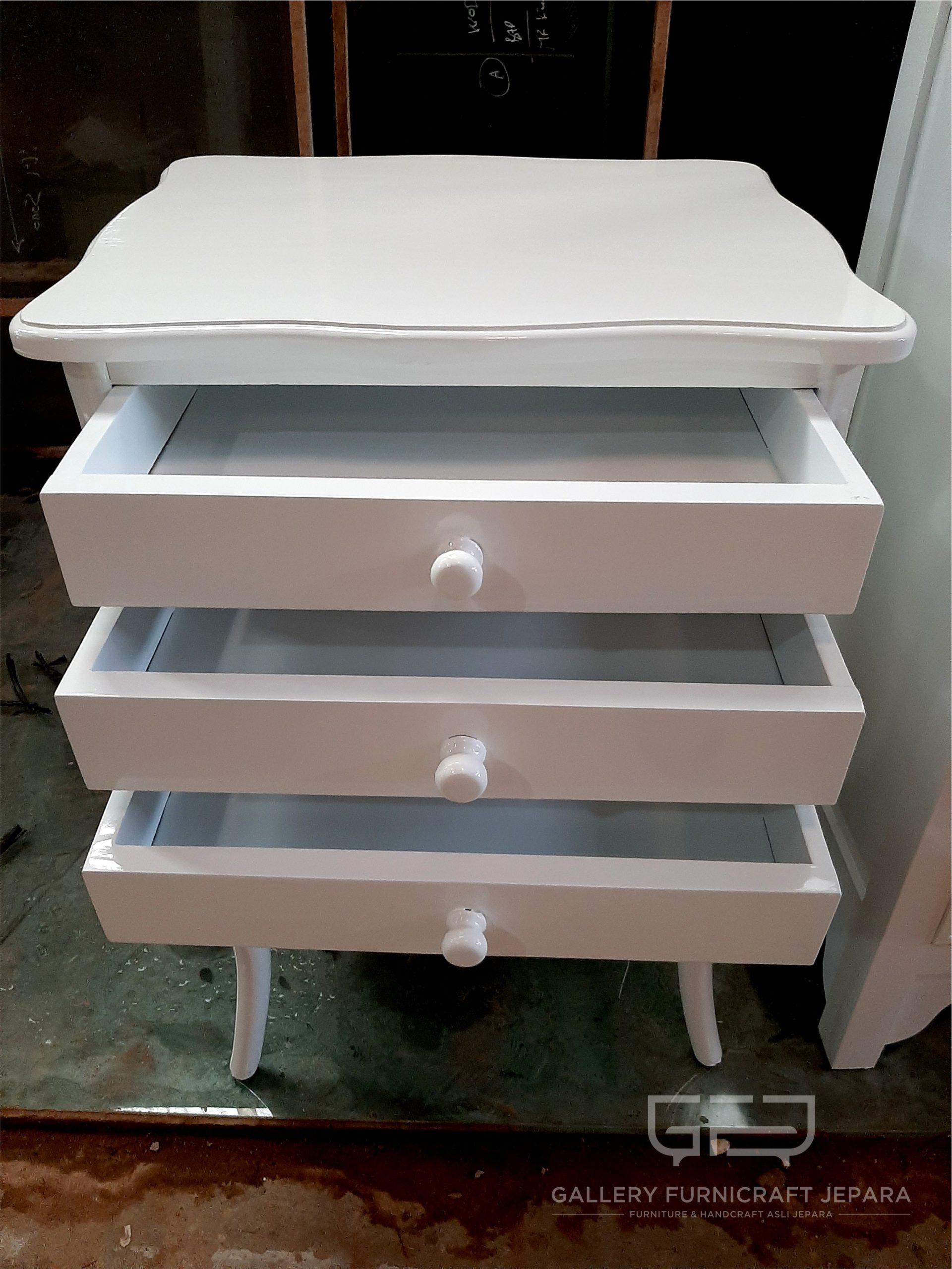 Best seller nakas model kupu kayu jati finishing duco, nakas ini dilengkapi dengan 3 laci penyimpanan, material full kayu jati solid dan finishing duco melamine kualitas A.