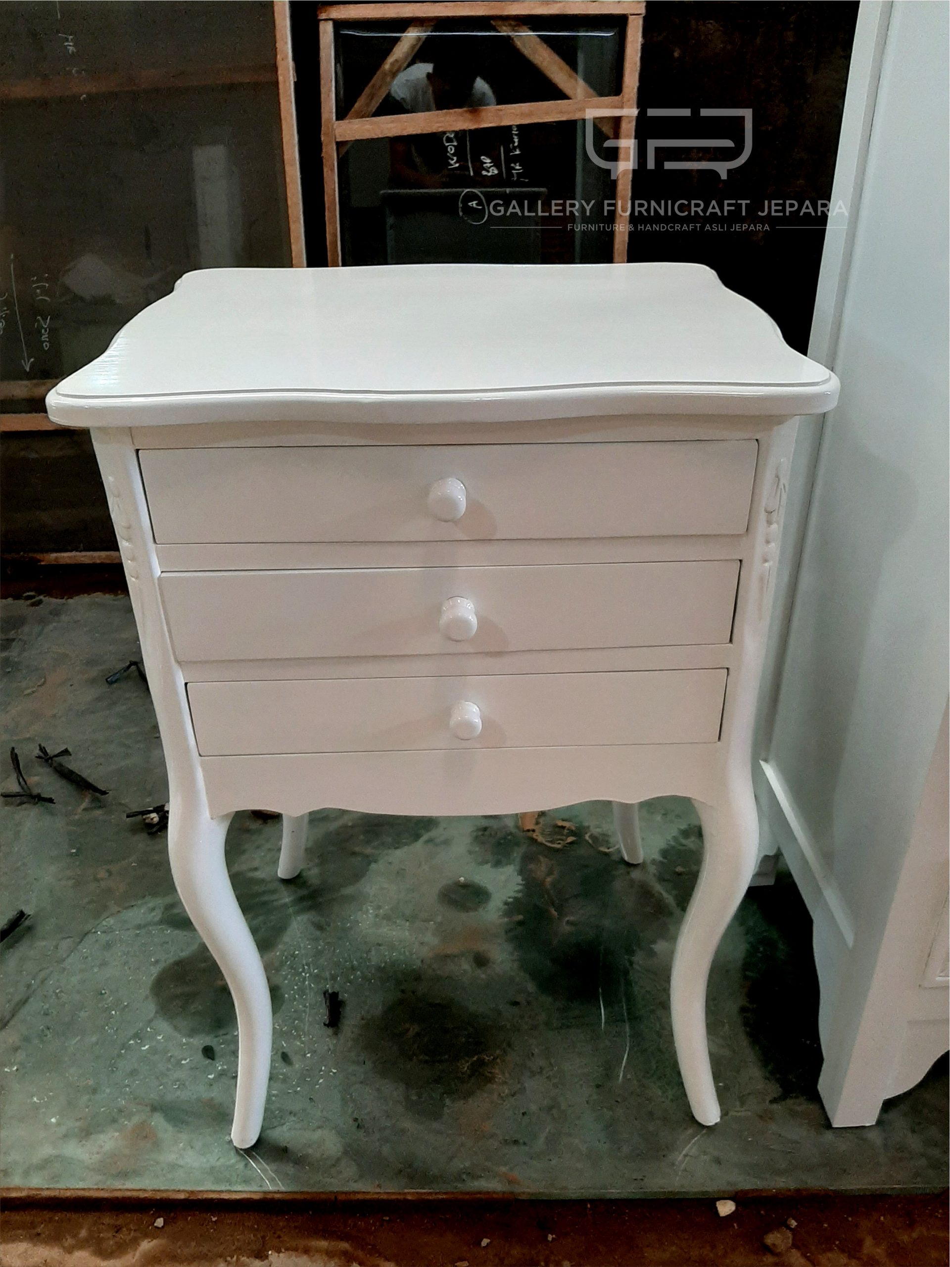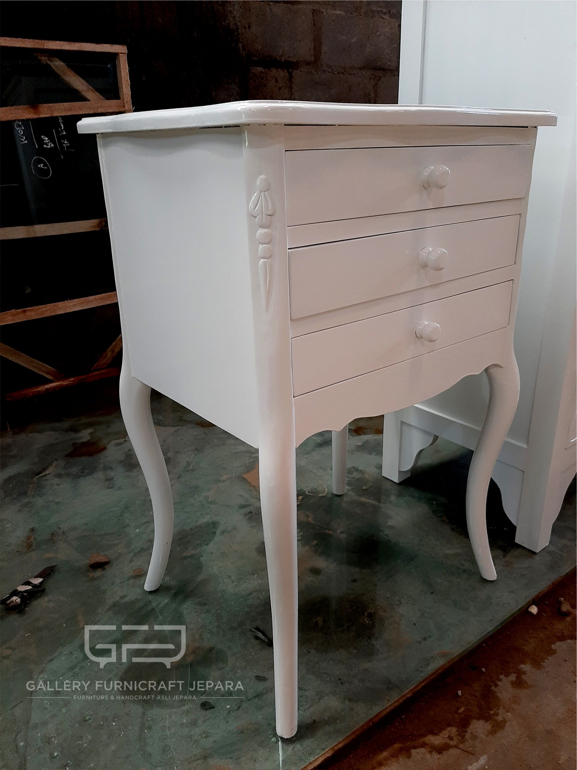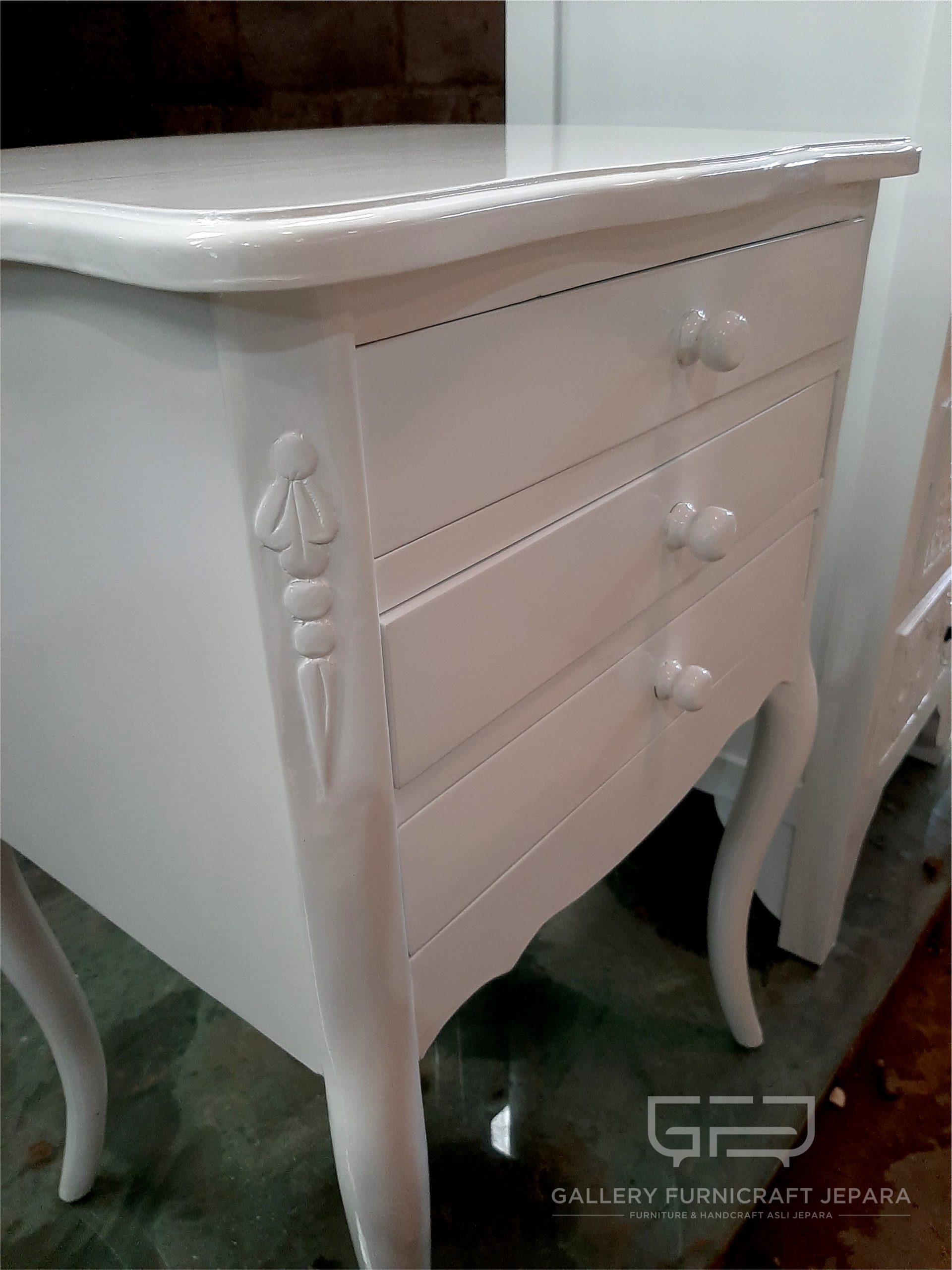 Best seller nakas model kupu kayu jati finishing duco, nakas ini dilengkapi dengan 3 laci penyimpanan, material full kayu jati solid dan finishing duco melamine kualitas A.