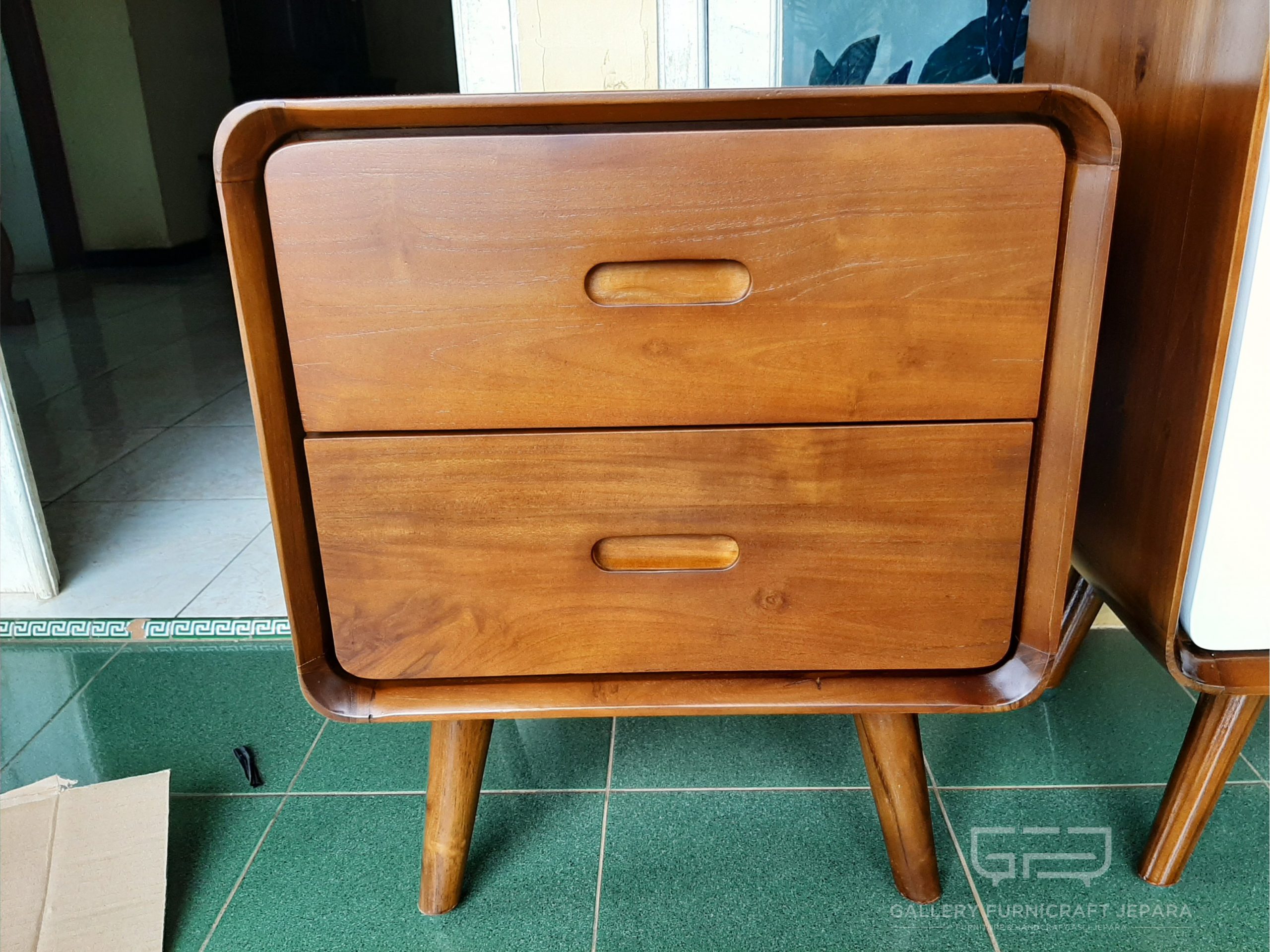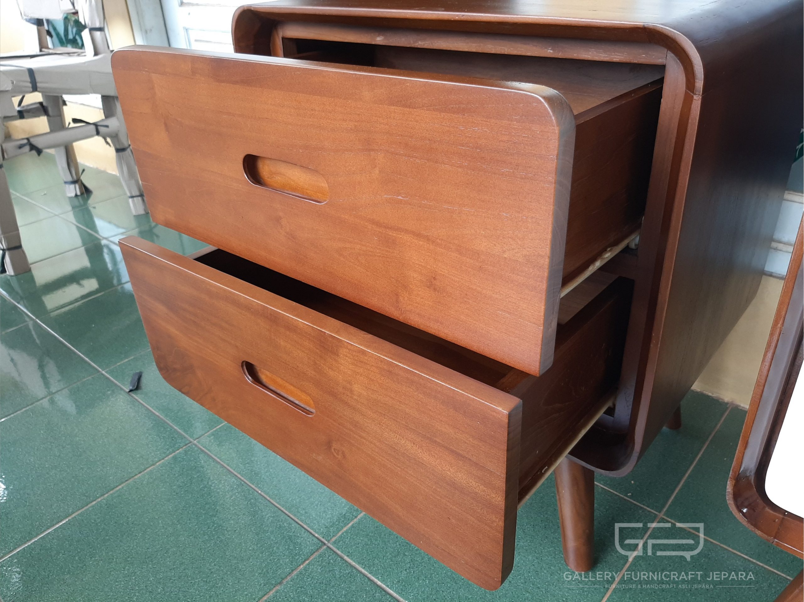 Nakas konsep desain retro dengan dilengkapi 2 laci, berbahan kayu jati solid dan pengerjaan mebel kualitas jepara.