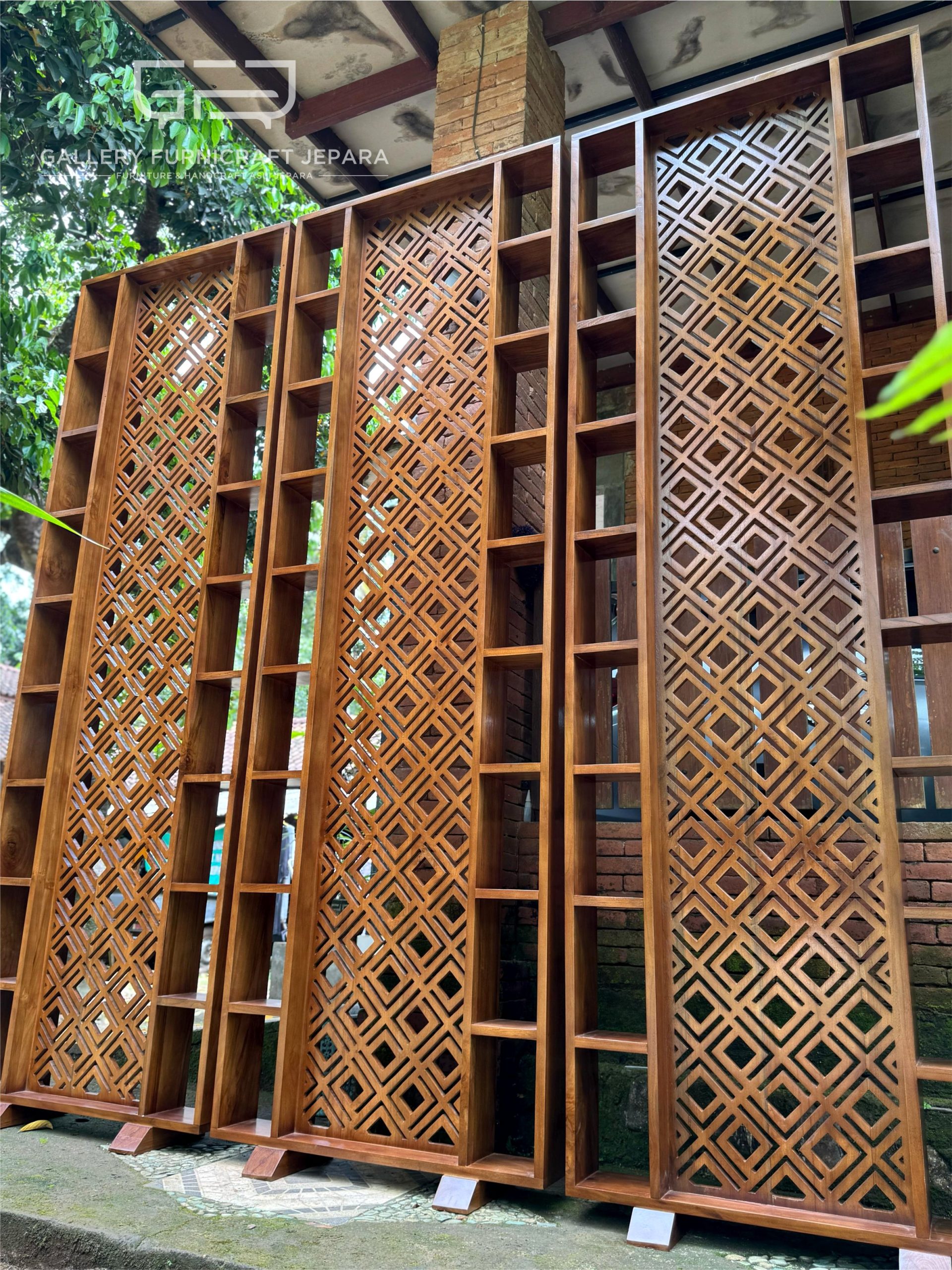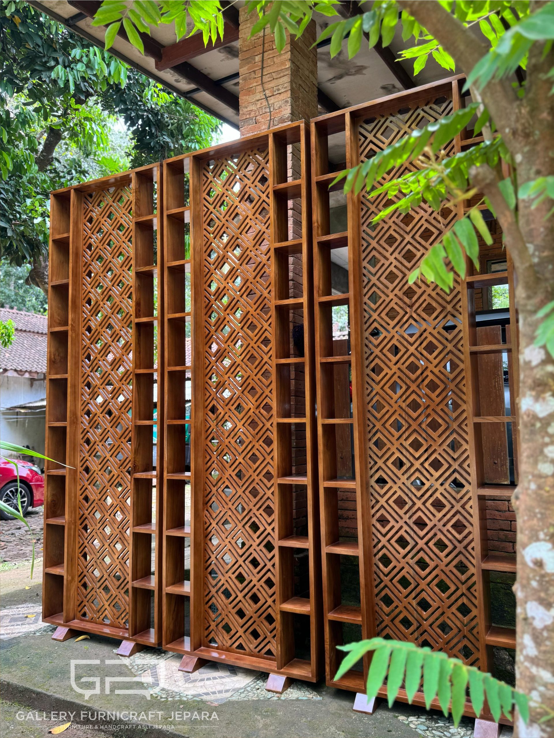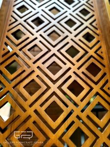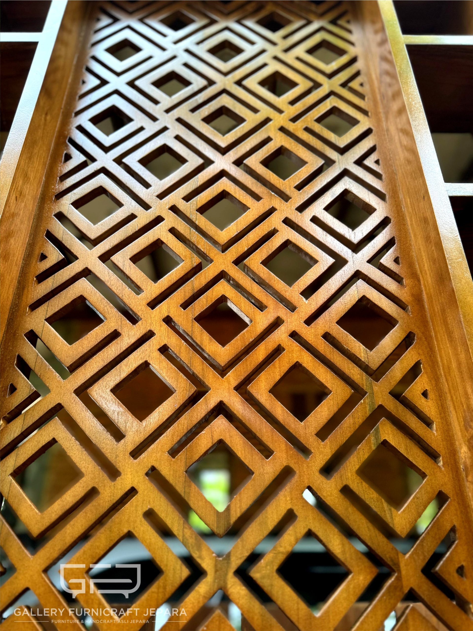 Partisi minimalis ukir tengah kupat 3 helai, finishing natural melamin, product by Gallery Furnicraft Jepara.