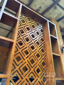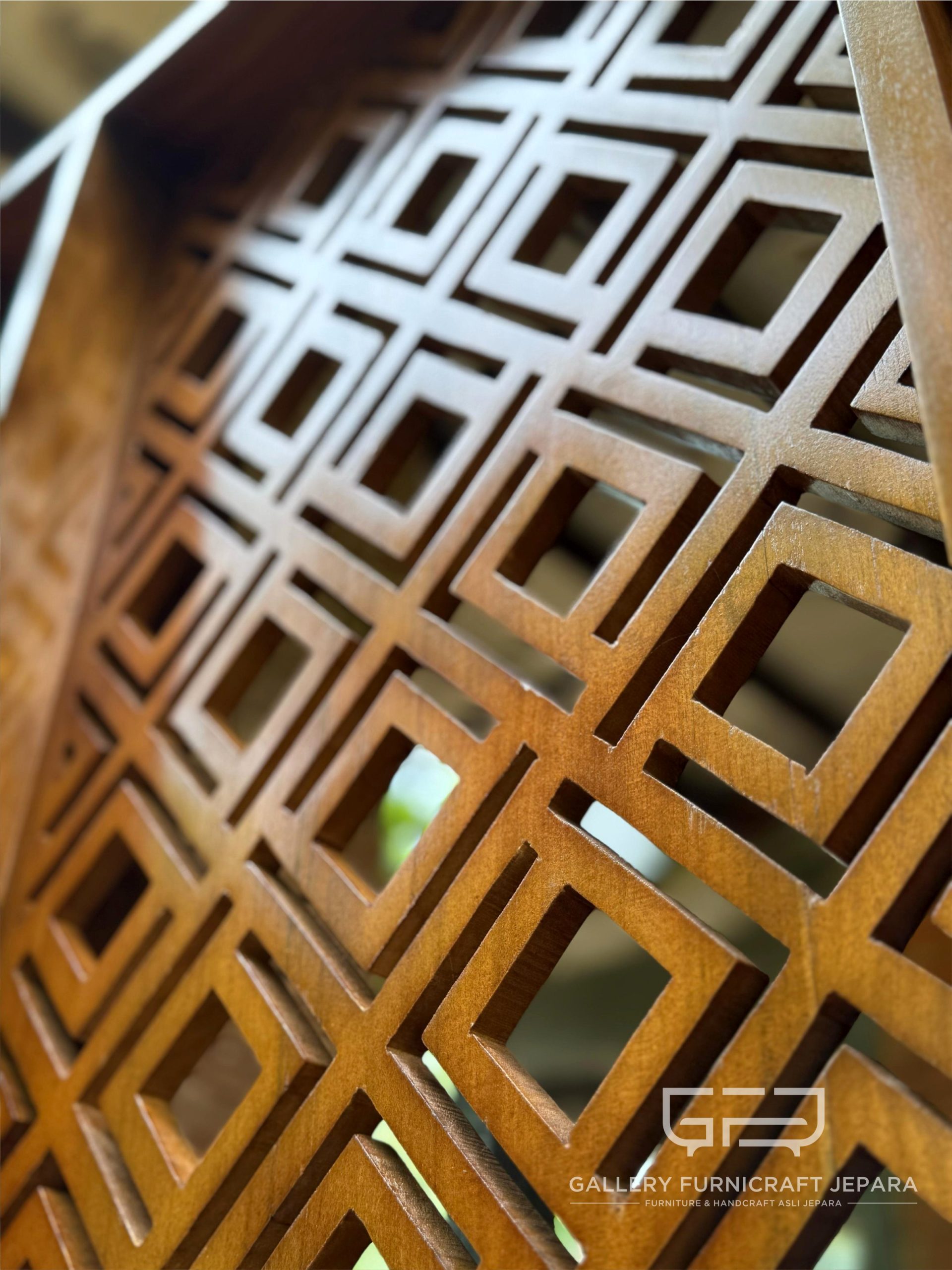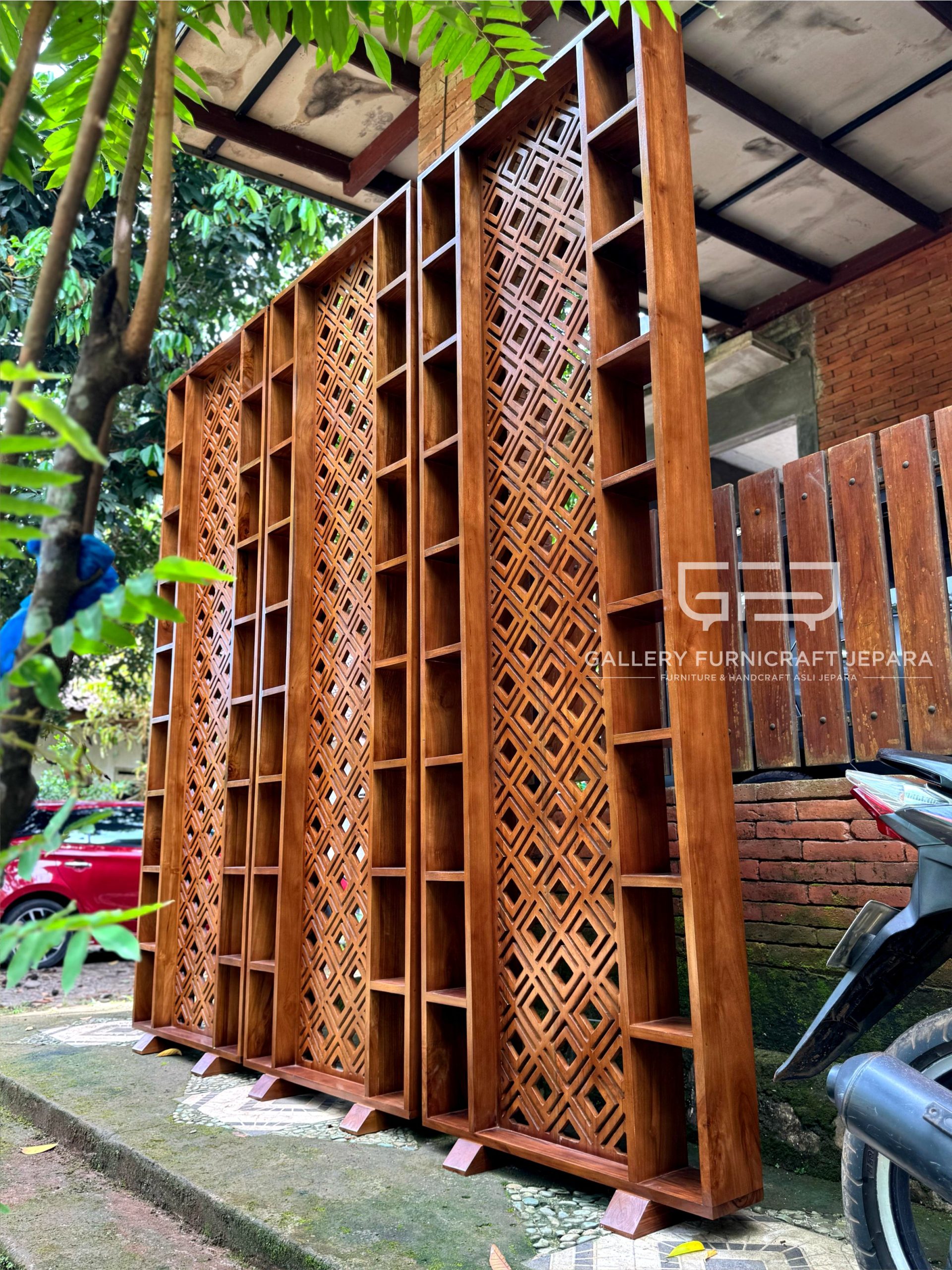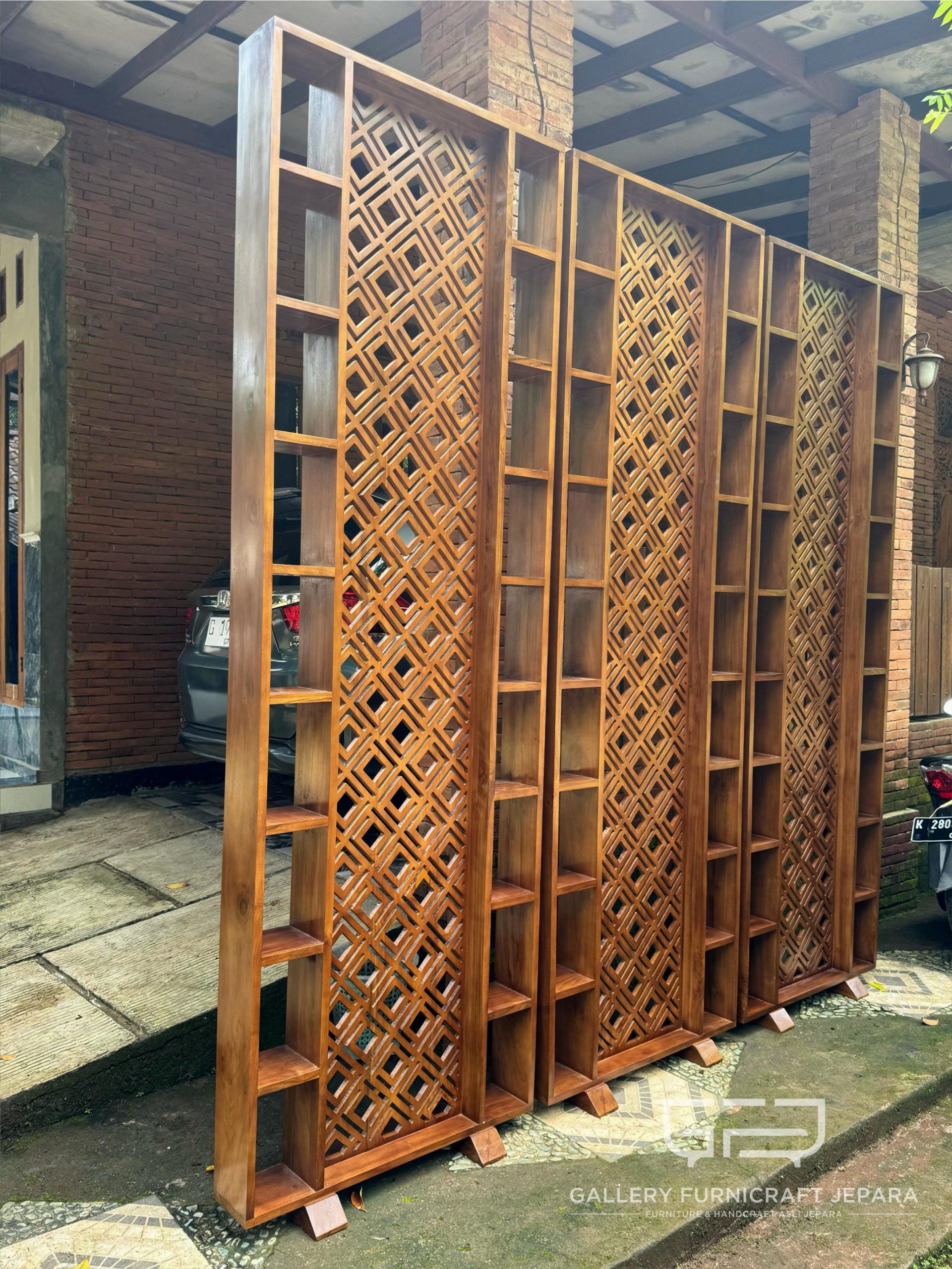 Partisi minimalis ukir tengah kupat 3 helai, finishing natural melamin, product by Gallery Furnicraft Jepara.
