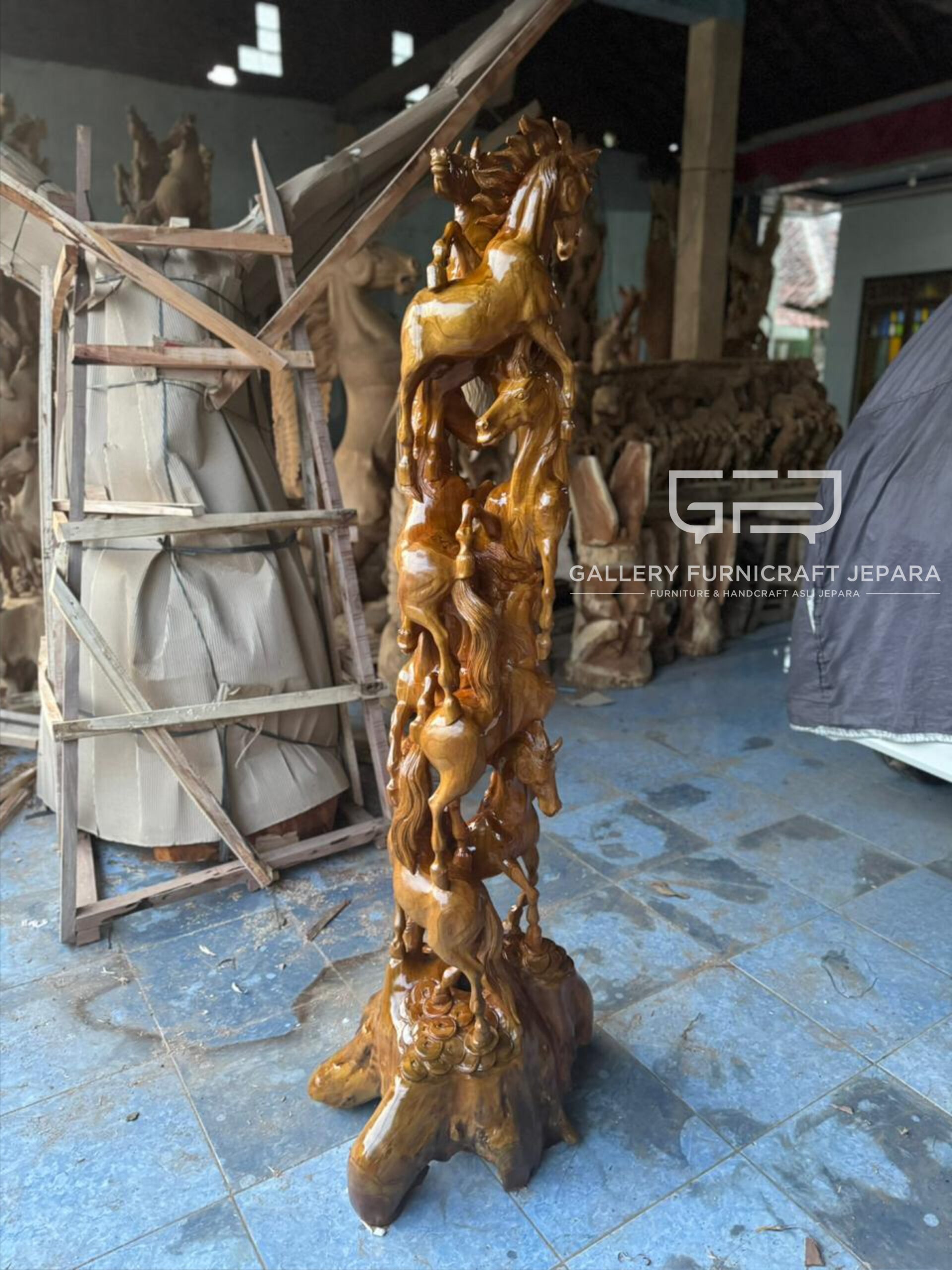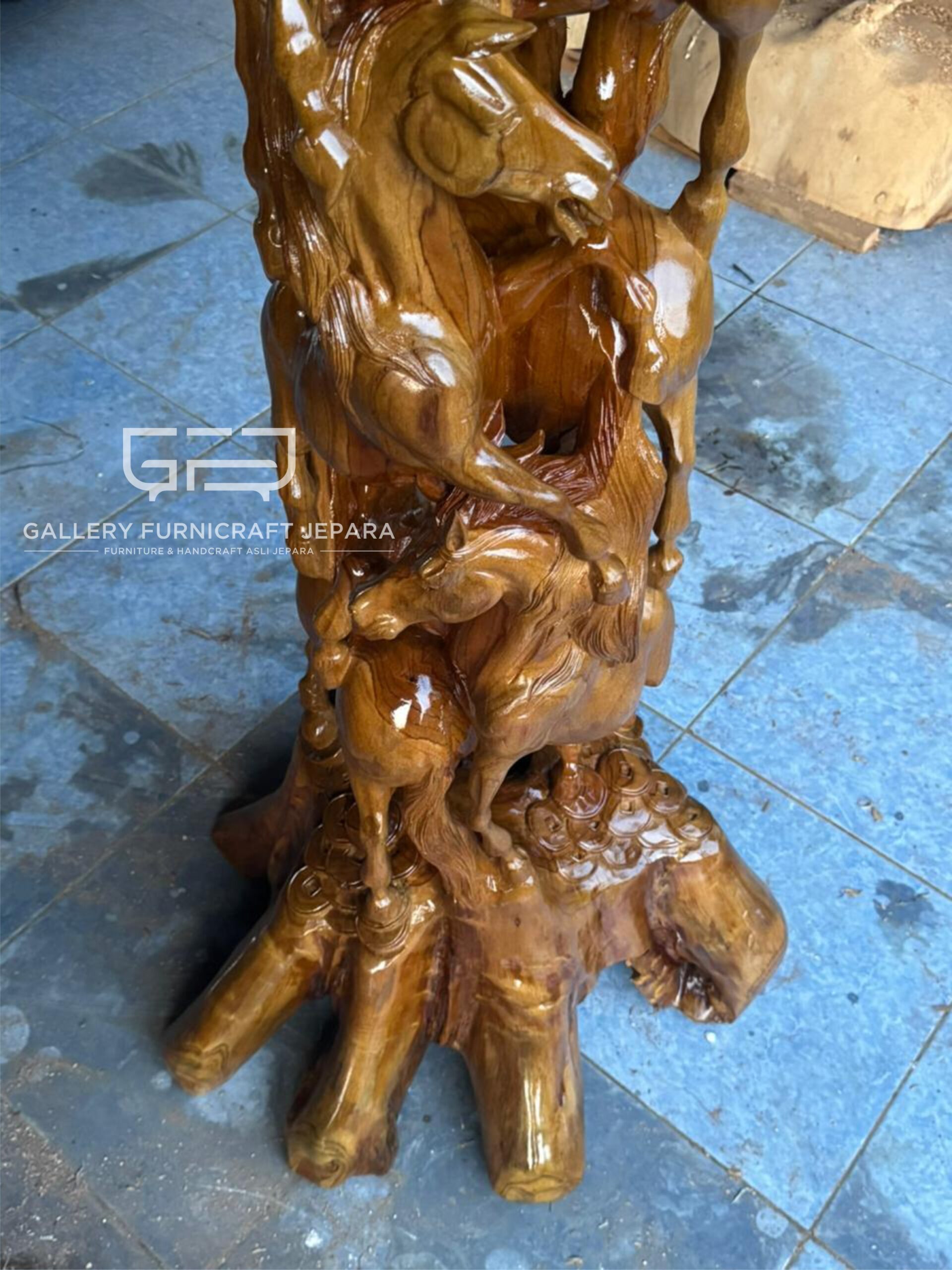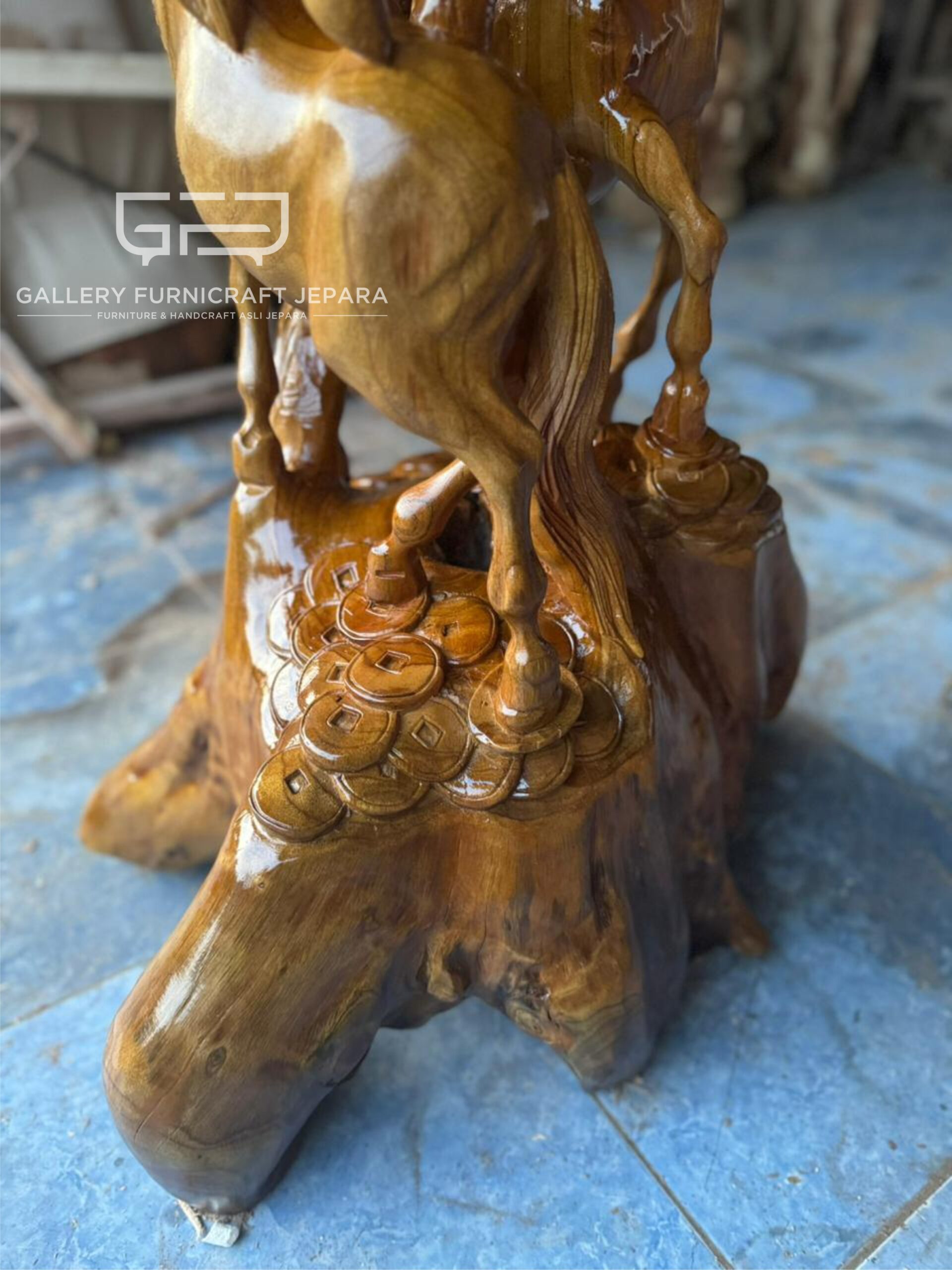 Open Order, patung kuda melingkar koin material pohon jati utuh, Original Product by Gallery Furnicraft Jepara