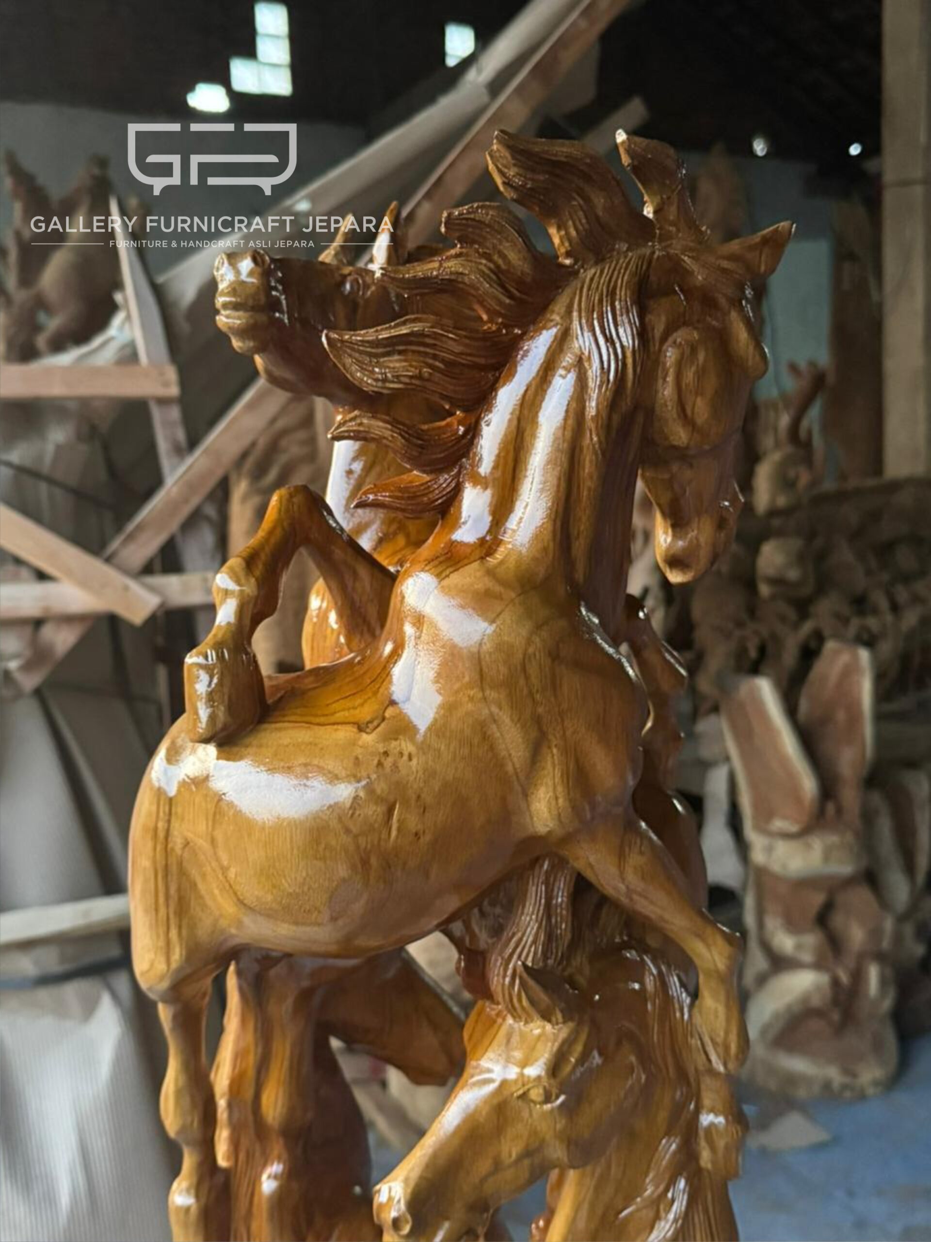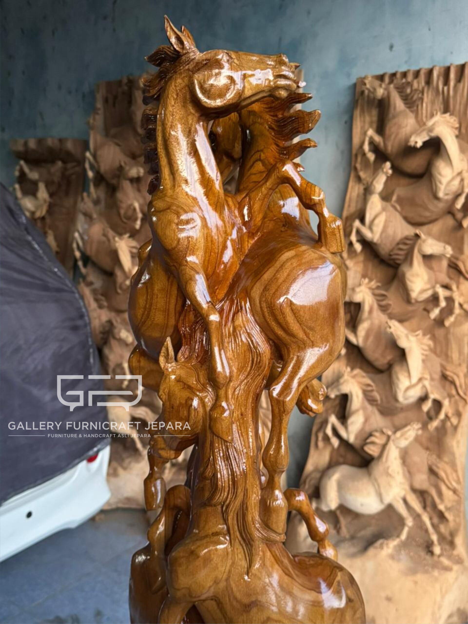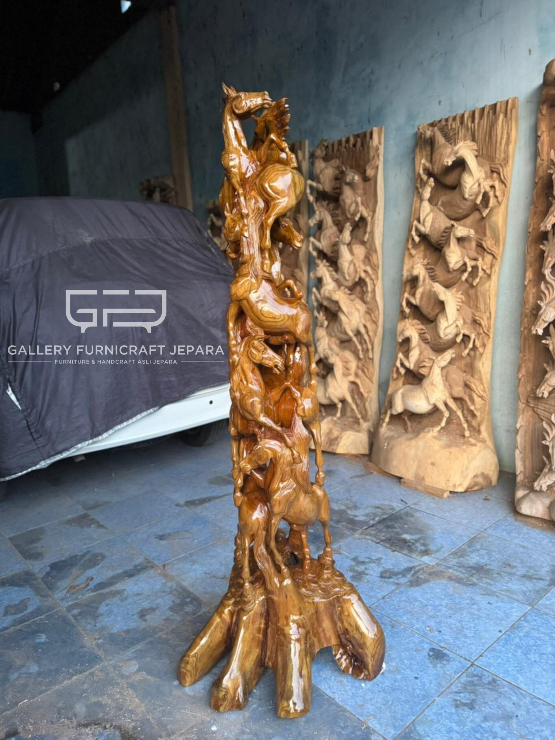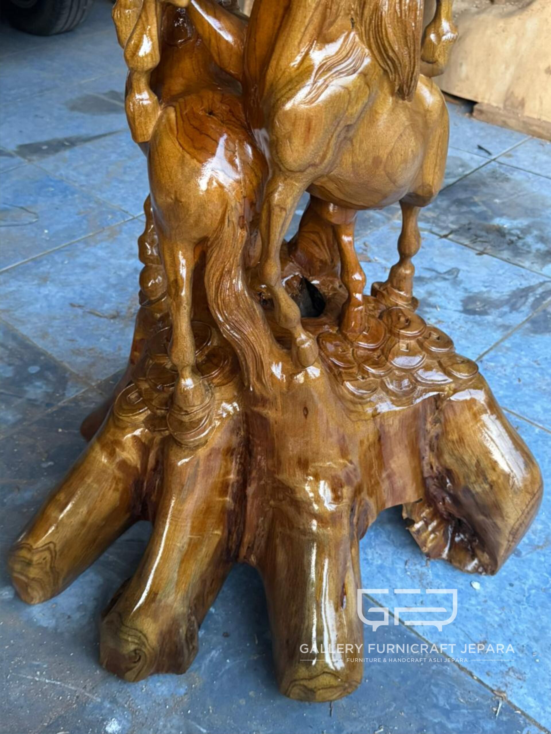 Open Order, patung kuda melingkar koin material pohon jati utuh, Original Product by Gallery Furnicraft Jepara
