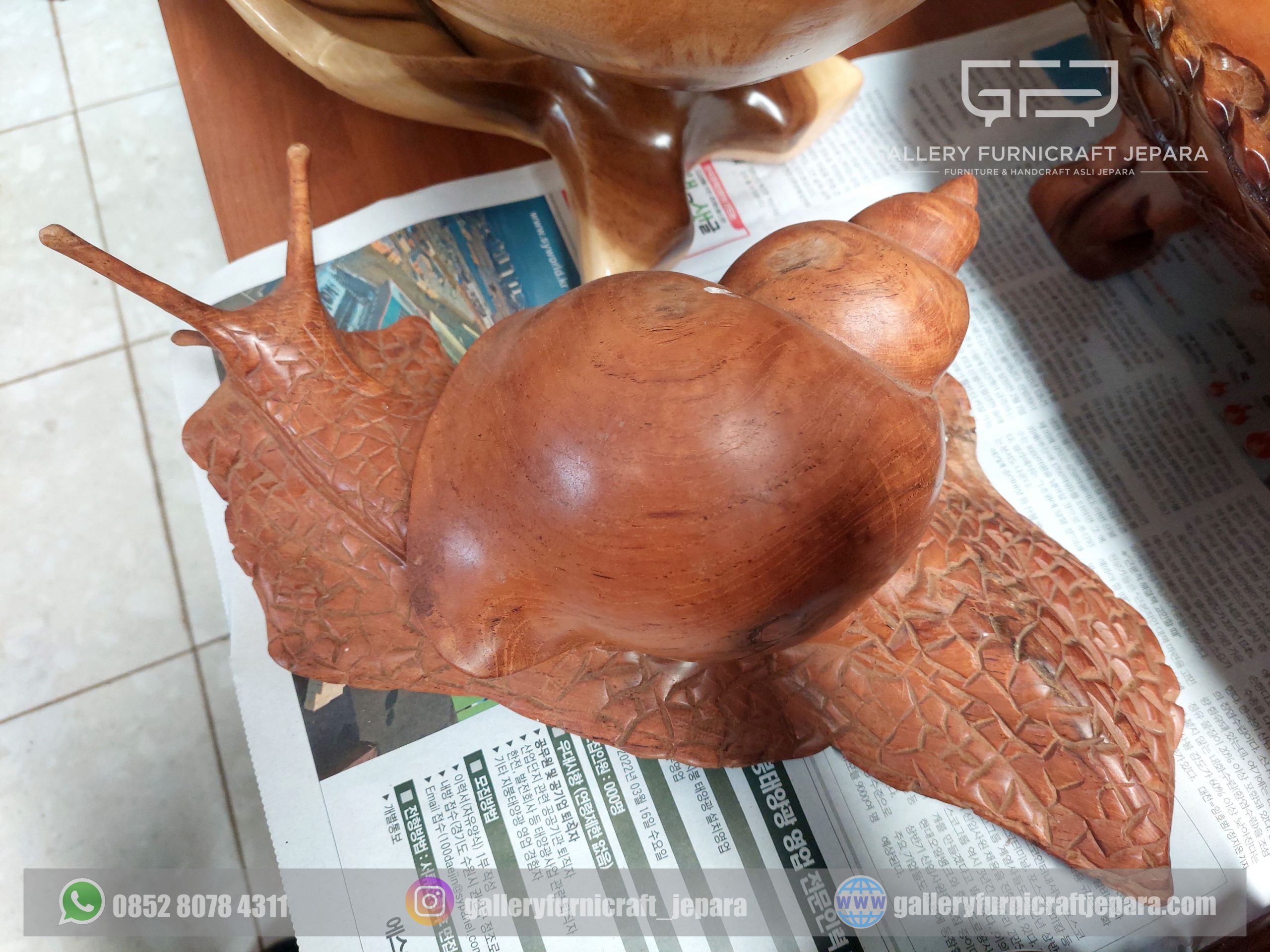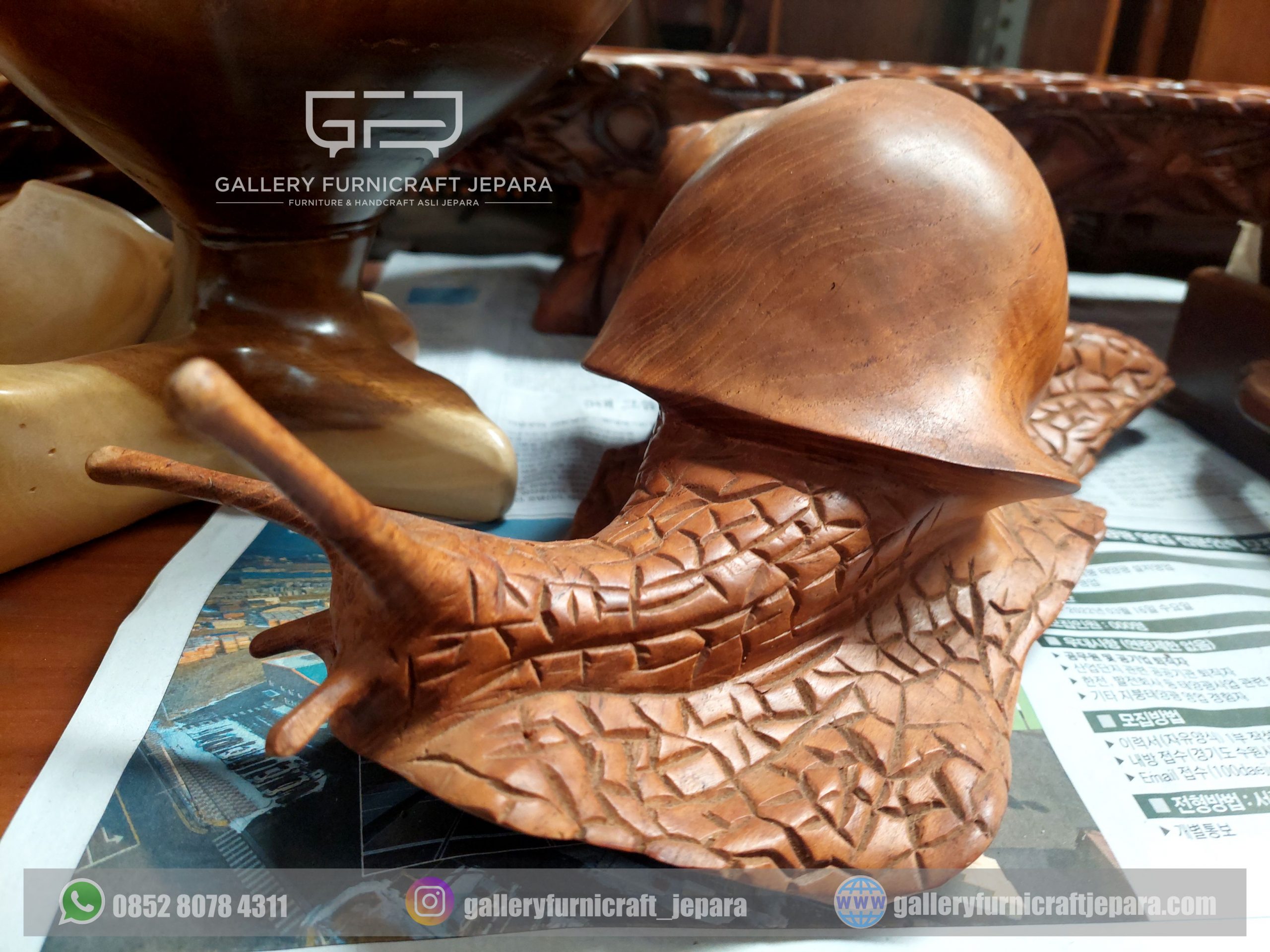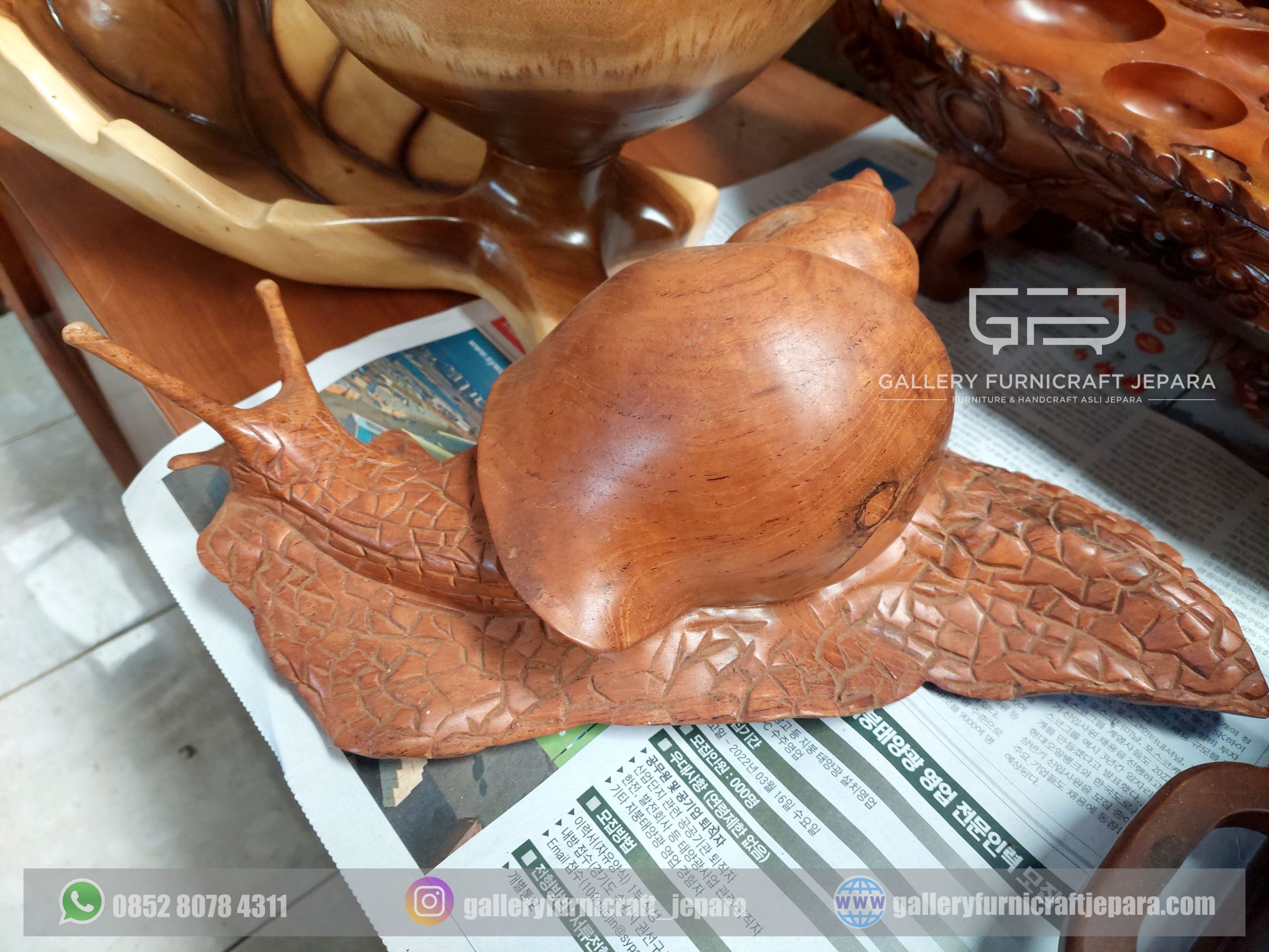 Dekorasi Patung Siput Untuk Hiasan dibuat oleh seniman ukir jepara, material menggunakan kayu Jati solid dengan kombinasi finishing melamine
