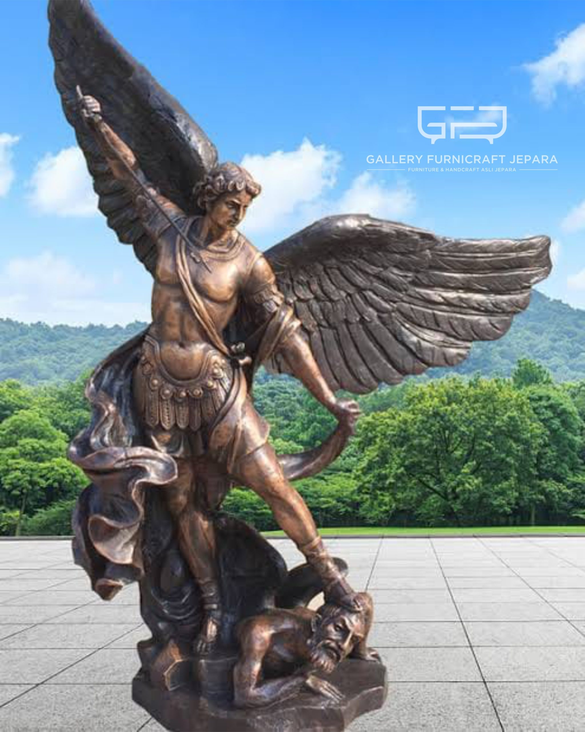 Open Custom patung St.Mikael Ukuran Real Size dari kayu Mahoni solid, Finishing Natural/Duco