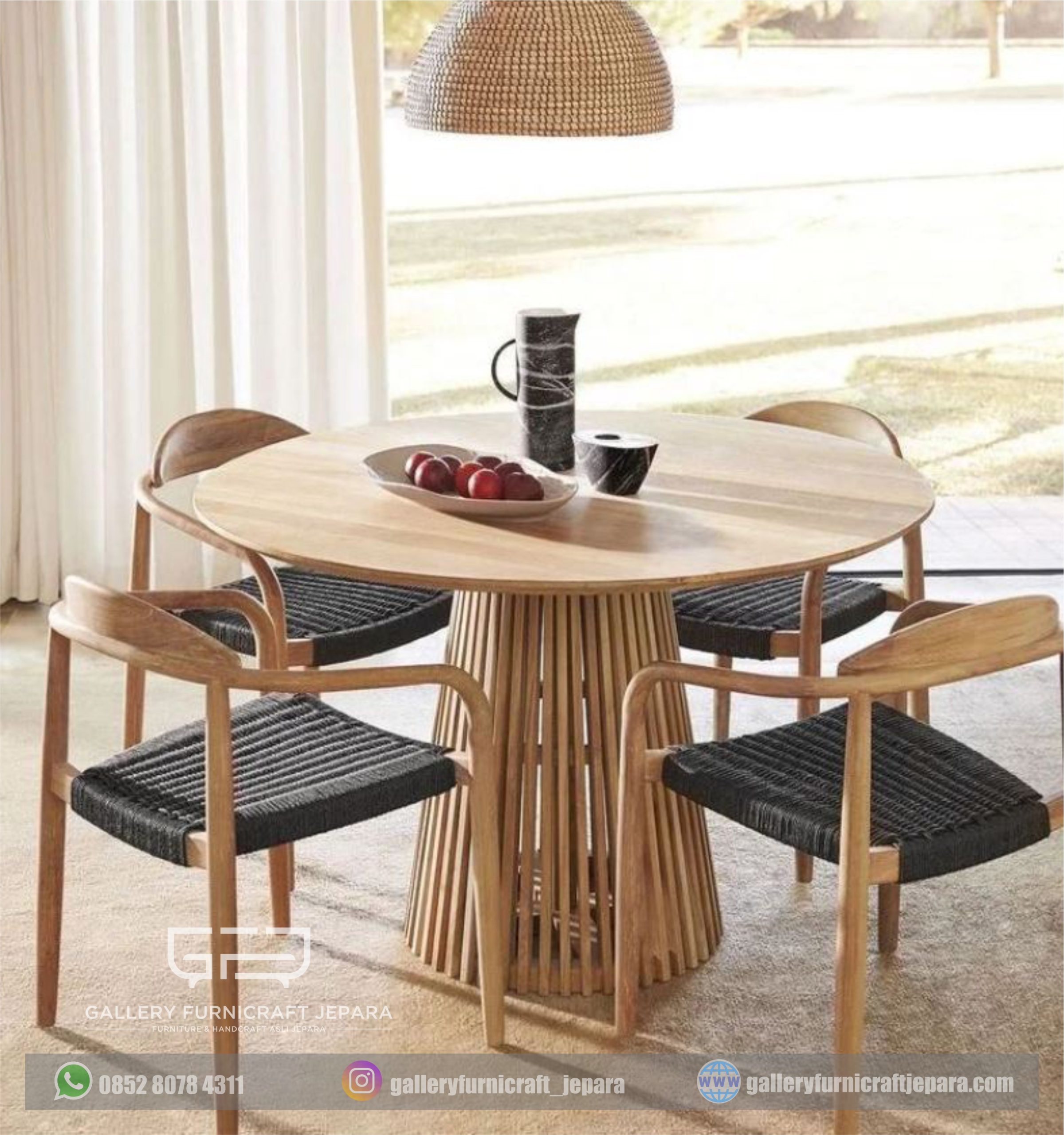 Cocok untuk kursi teras/kursi makan dengan jumlah 4 kursi model RETRO kombinasi kayu jati dan LUM, meja model bulat jari jari Diameter 100cm Tinggi 75cm, bahan baku full jati,Finishing Melamine Doff Classic.