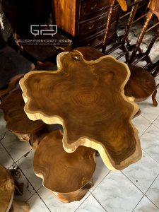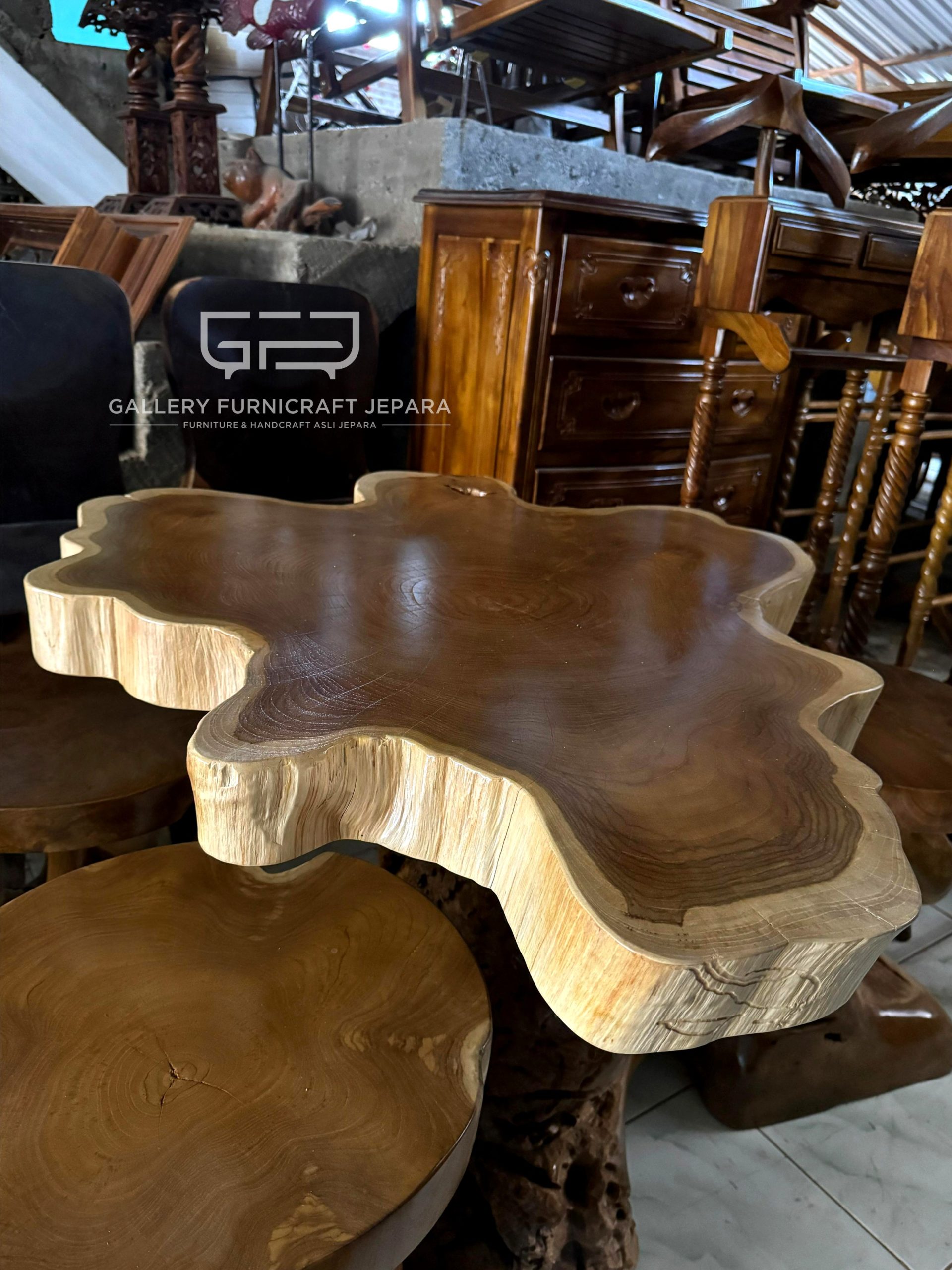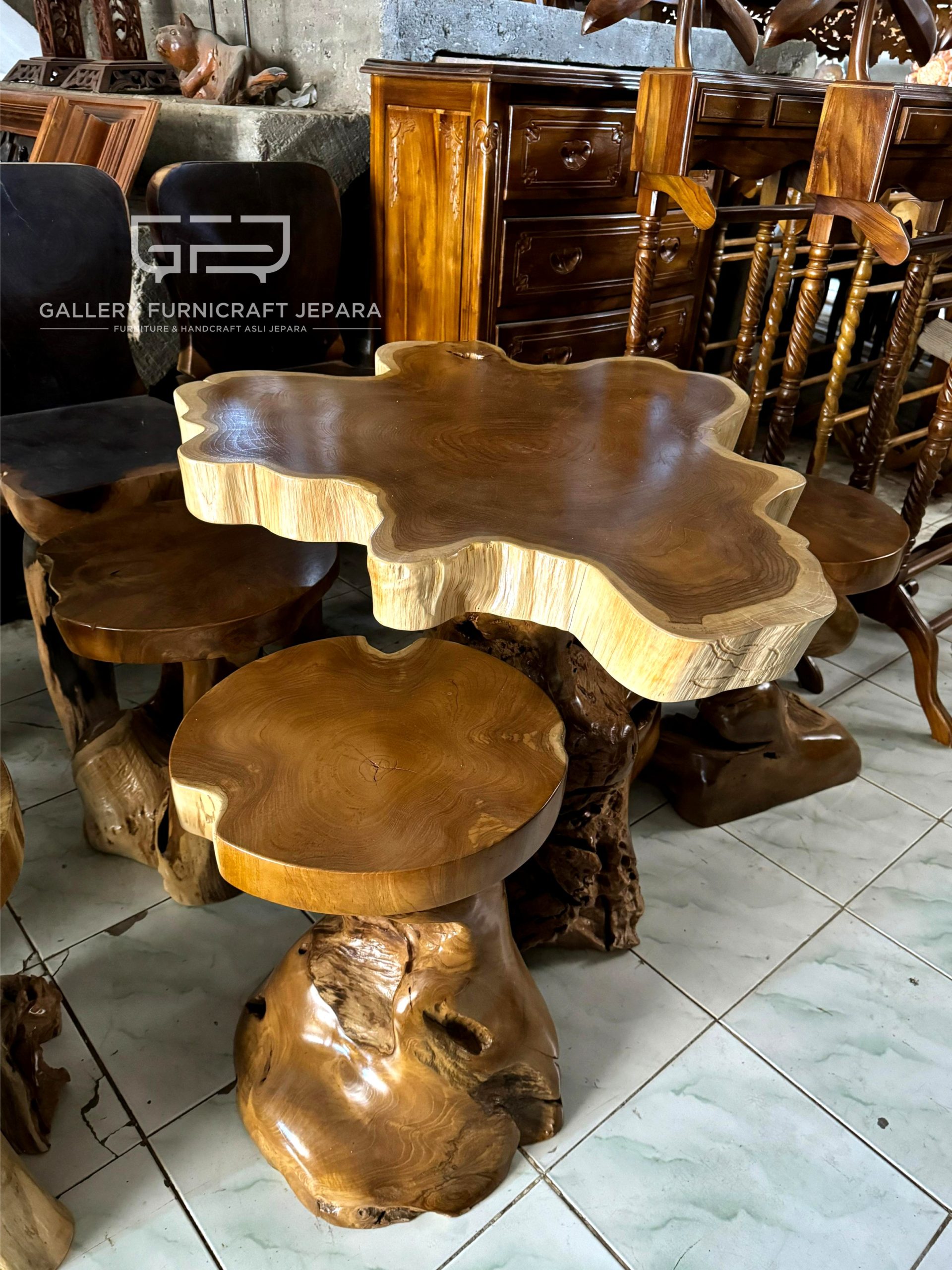 Set meja akar jati dengan bahan jati perhutani tua erosi antik. Material kayu jati solid, Finishing Natural Melamine Satin Doff.
