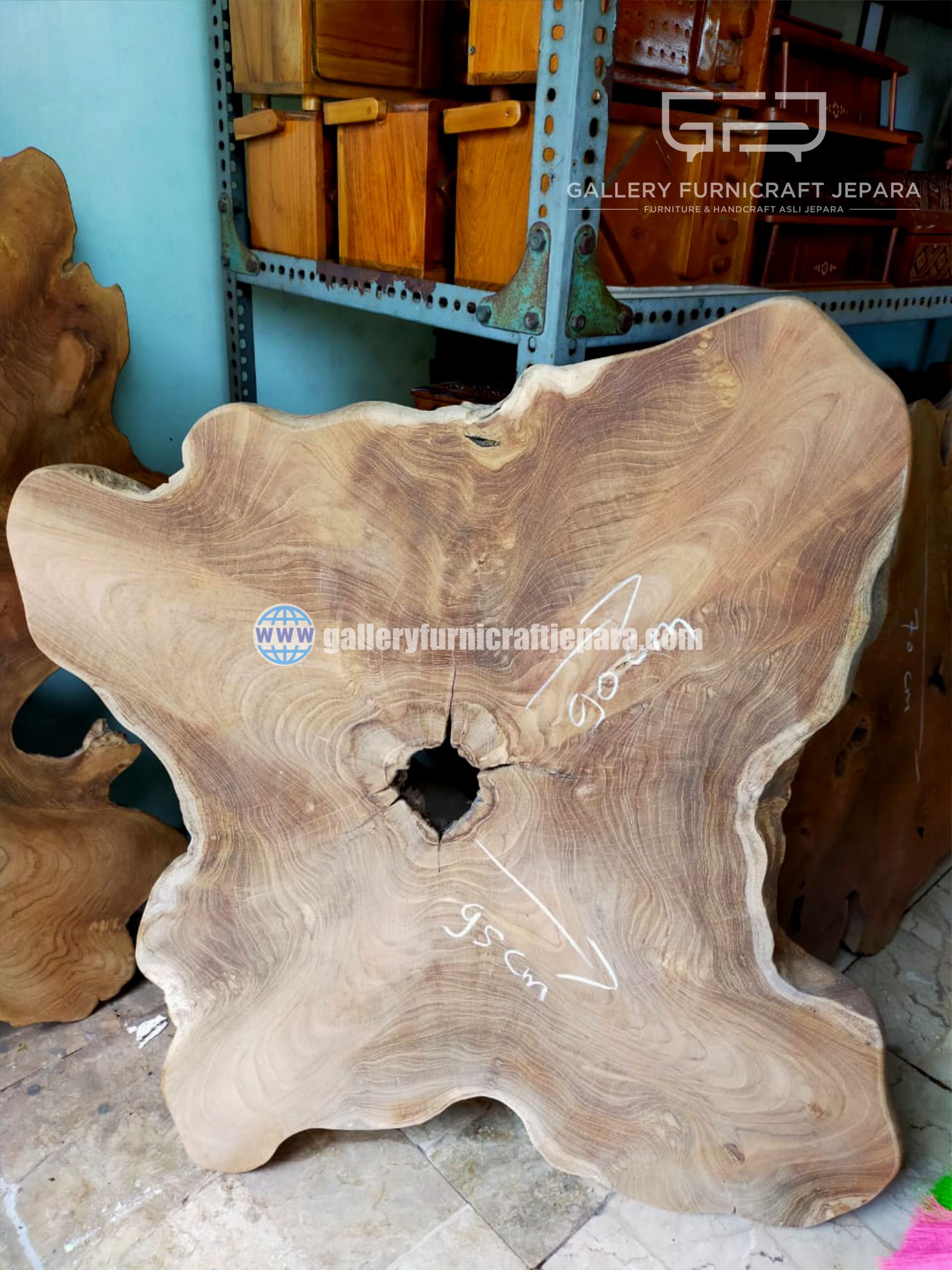 Bahan meja kopi kepala kayu jati, size 90×95 tebal 5.5cm, dari jati perhutani TPK yang sudah sangat tua dan antik, terlihat dari corak dan serat kayu, sudah termasuk finishing natural dengan coating melamin
